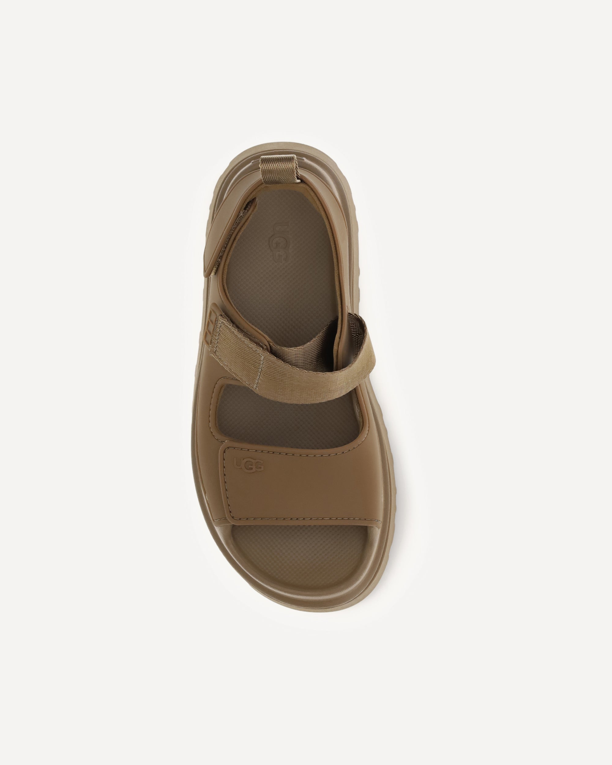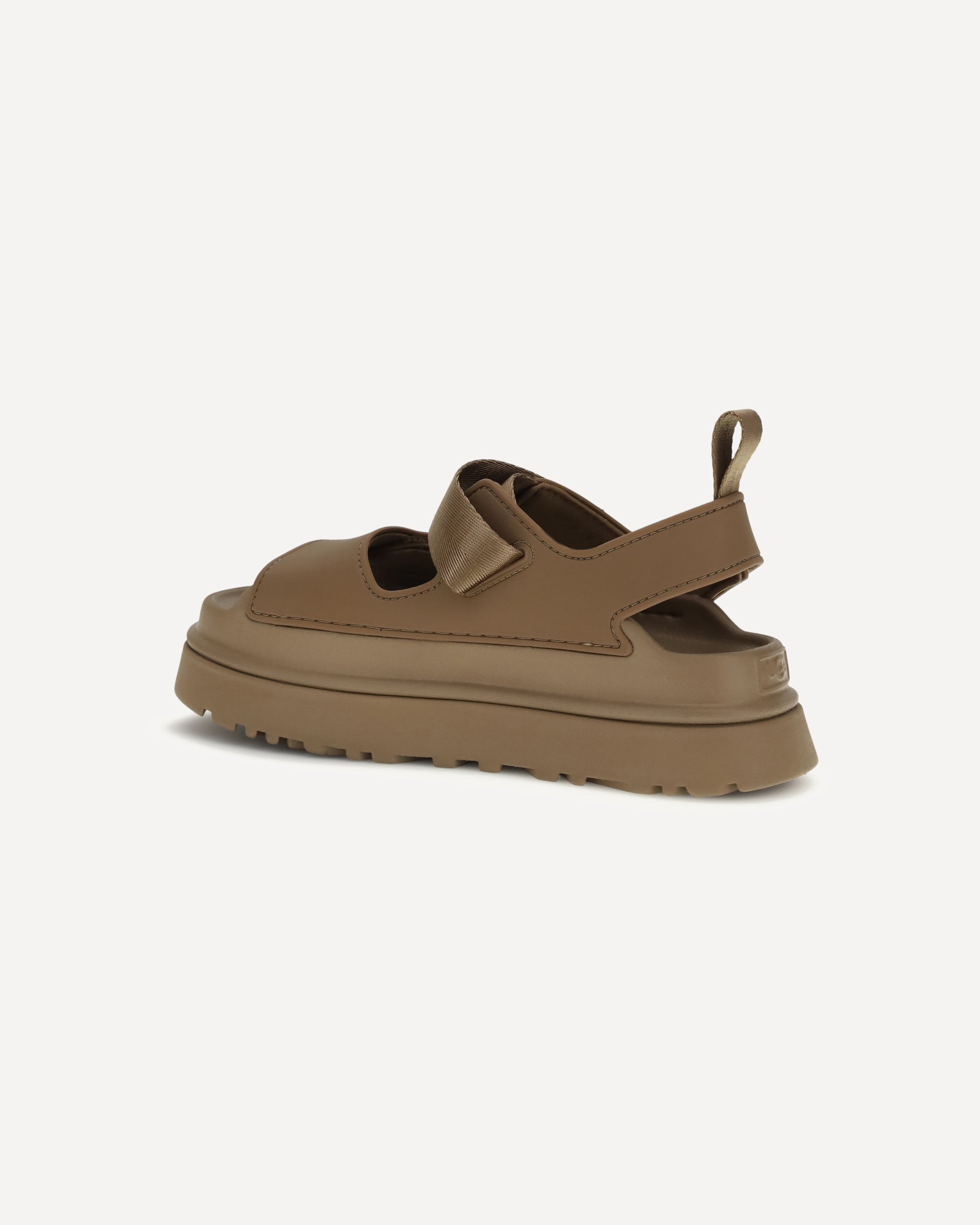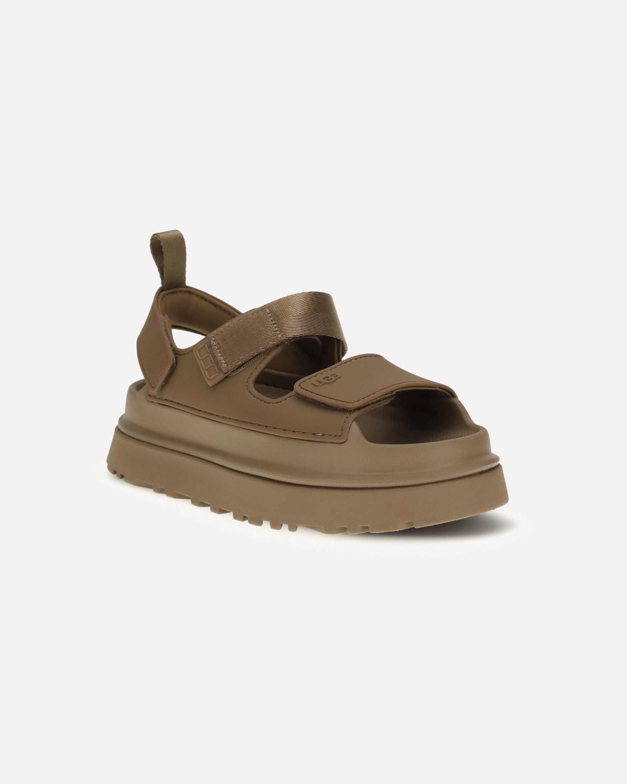 The Goldenglow Sandals by UGG combine contemporary design with sustainable materials, making them perfect for the summer season. The TPU upper is complemented by a back strap made from recycled materials, while the Velcro closure and fabric ankle strap ensure a practical and adjustable fit. The straps made from recycled polyester fibers and the fabric lining, also crafted from recycled materials, underscore the brand’s commitment to the environment. The EVA sole ensures lightness and comfort, making these sandals ideal for everyday wear that combines style and functionality.