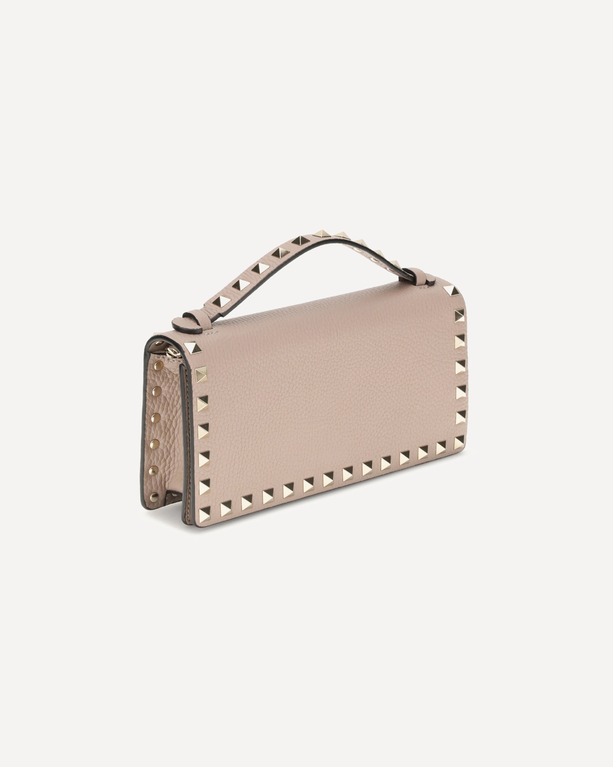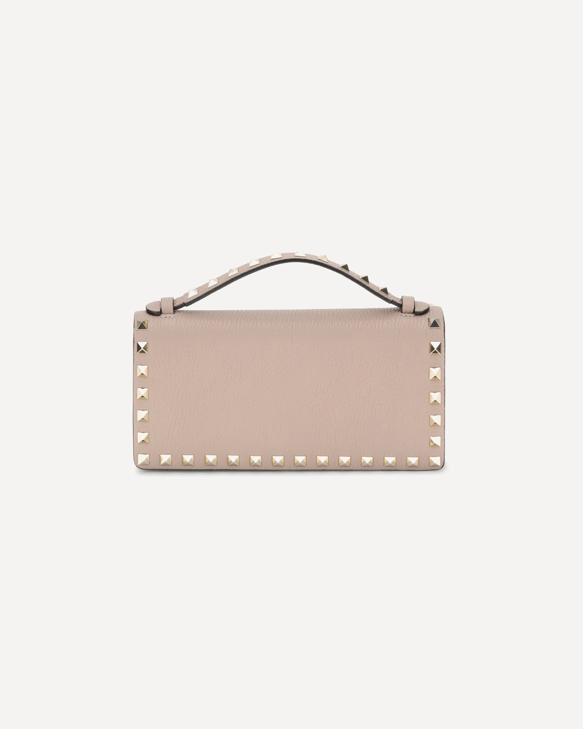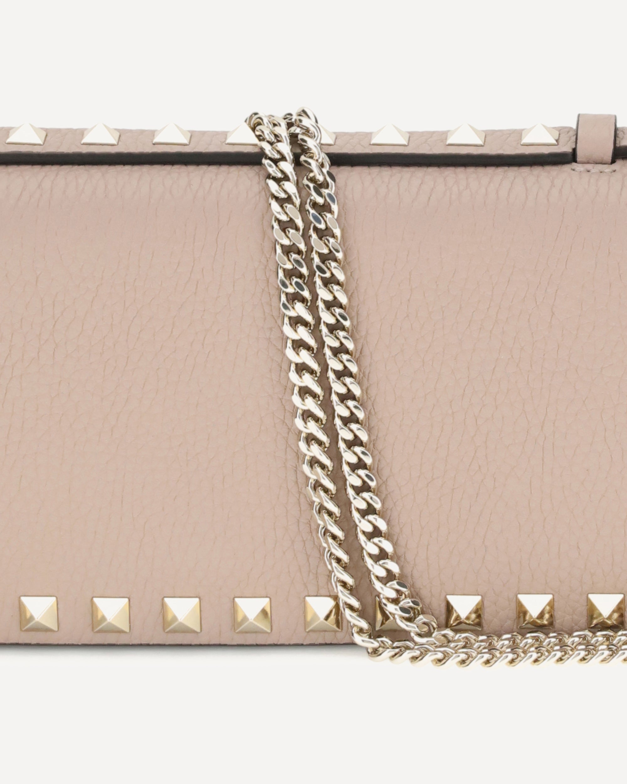 Valentino Garavani grained leather Wallet with top handle and chain shoulder strap for a dual mode of use. It features the iconic Rockstud studs applied on the perimeters and front flap closure equipped with a magnetic button. Inside, a single compartment with zippered welt pocket to better organize your essentials with style and functionality.
