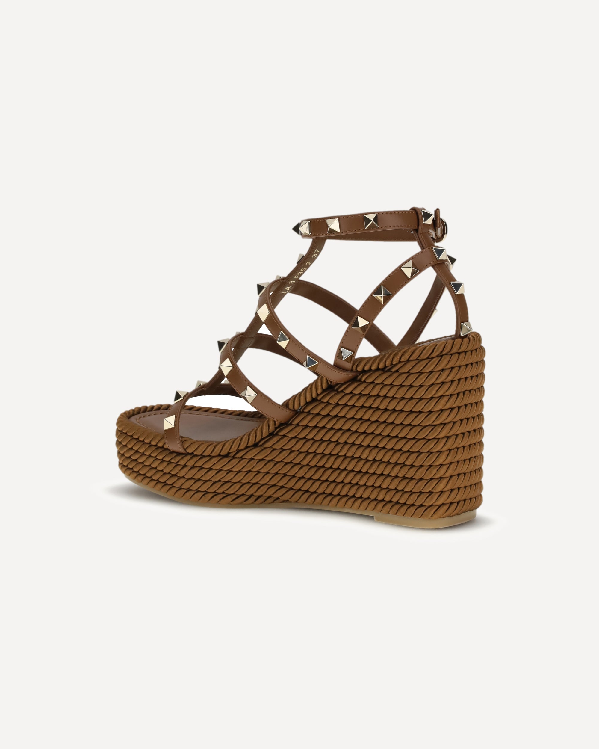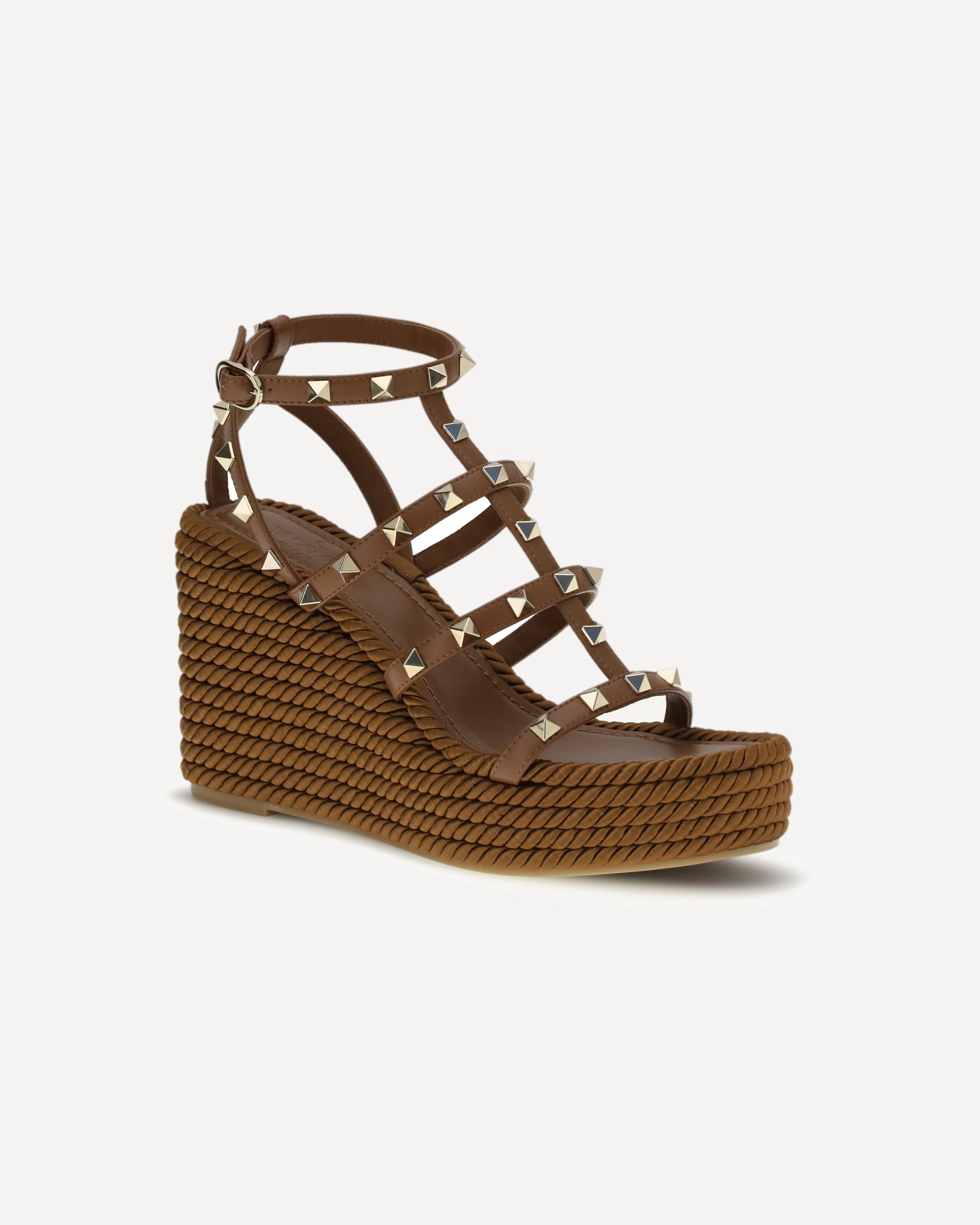 The Rockstud Torchon 95 Wedges by Valentino Garavani elevate the classic espadrille with soft leather and the brand’s signature stud detailing for a bold, refined touch. The square open toe enhances the silhouette, while the adjustable ankle strap provides a secure and elegant fit. The braided wedge adds a summery, feminine feel, making them an effortless choice for polished day-to-evening looks.