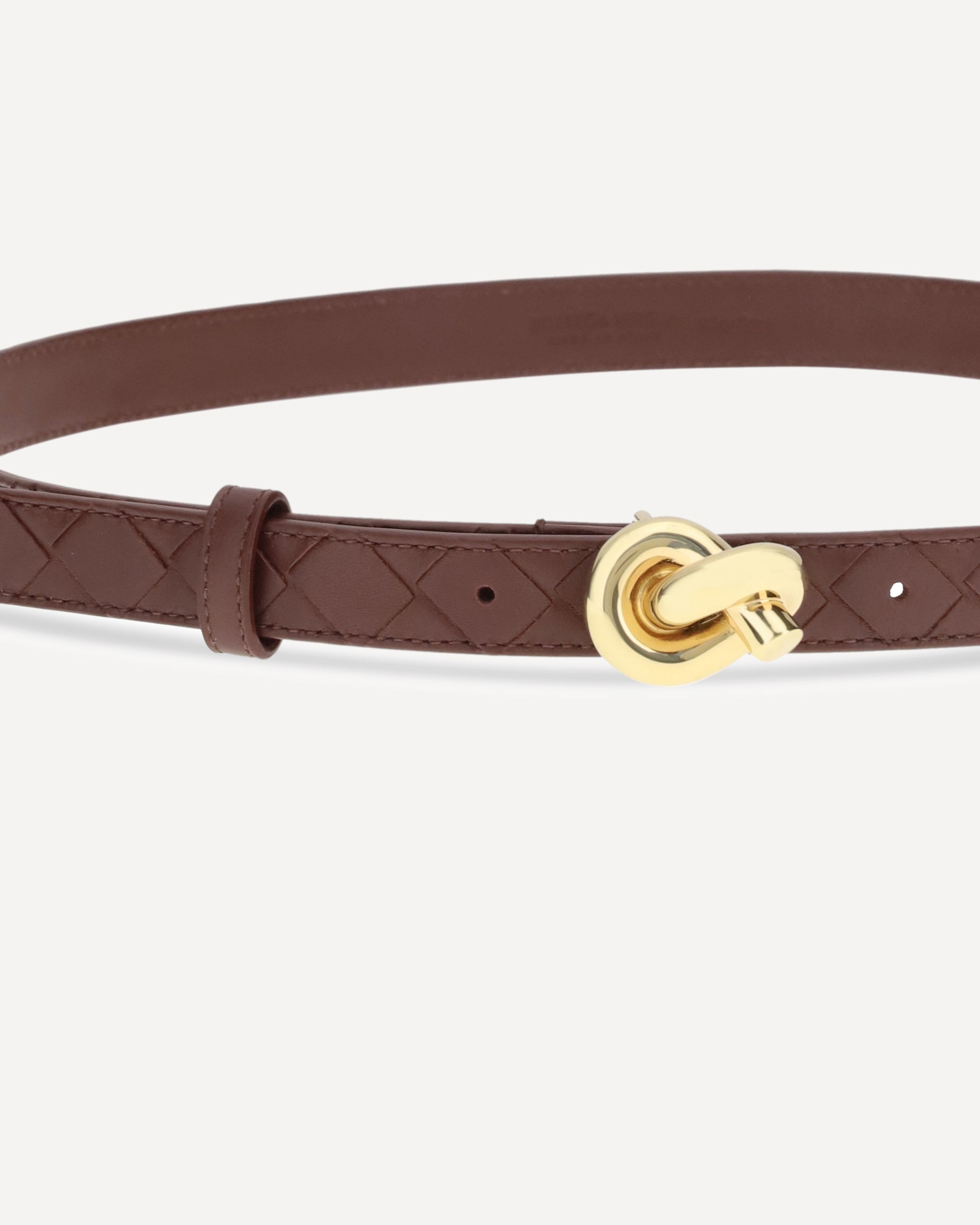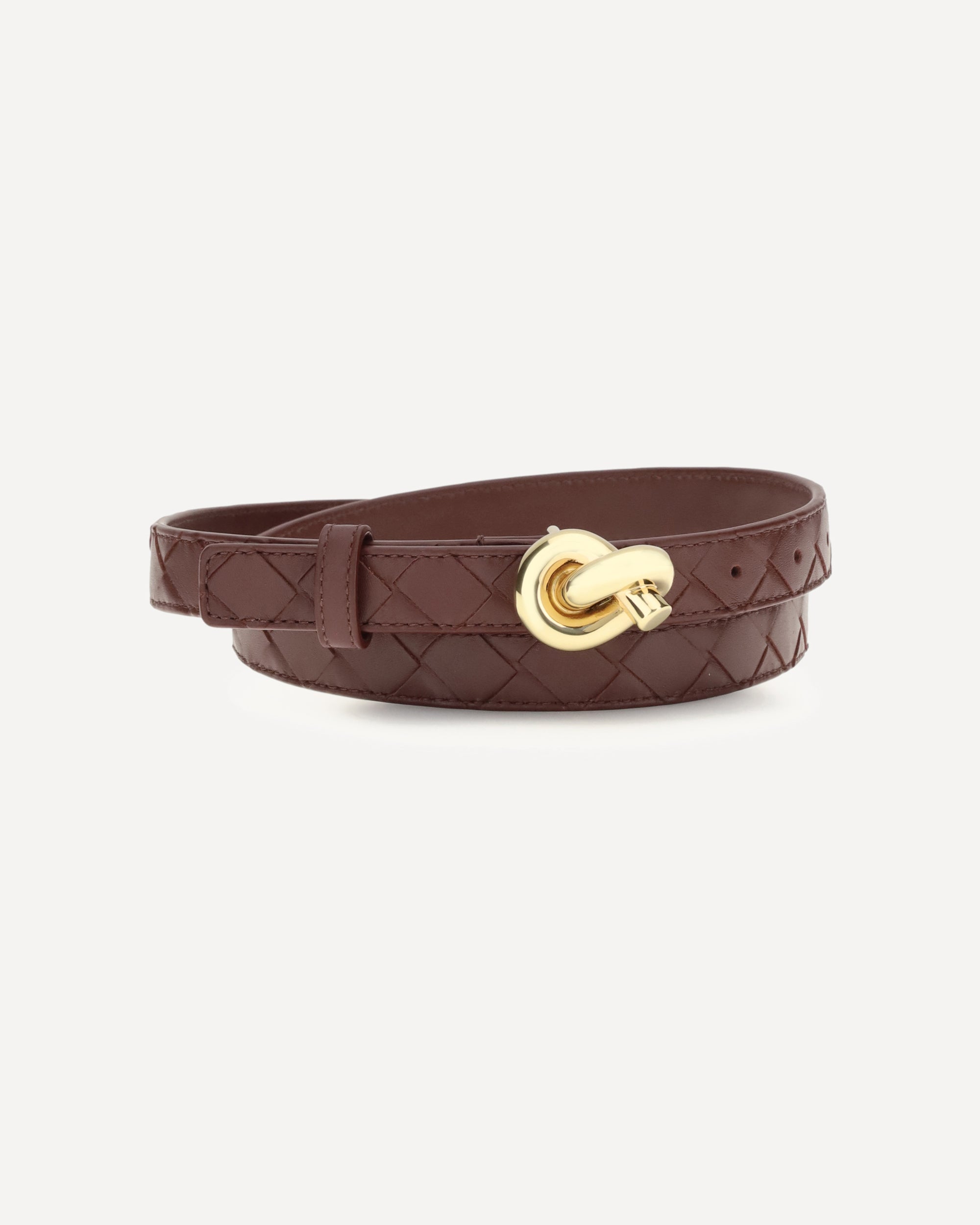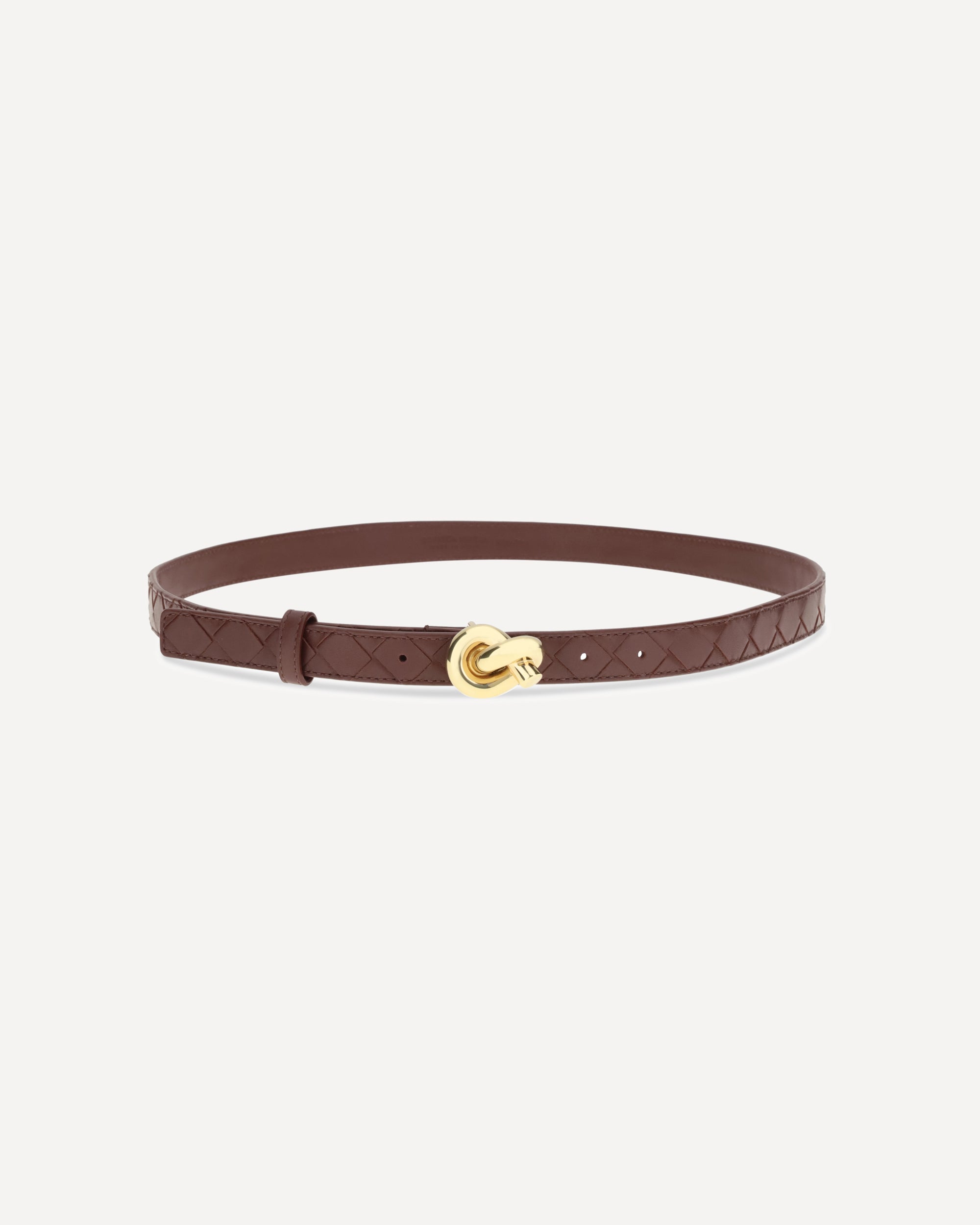 Bottega Veneta's Knot Belt is an iconic accessory that combines elegance and craftsmanship. Made of soft silky calfskin with Intrecciato workmanship, the distinctive symbol of the maison, it is distinguished by a metal knot buckle, a sculptural and sophisticated element that echoes the model's name. The pin closure ensures a secure and adjustable fit. A refined detail to complete both formal and casual looks with an unmistakable touch of style.
