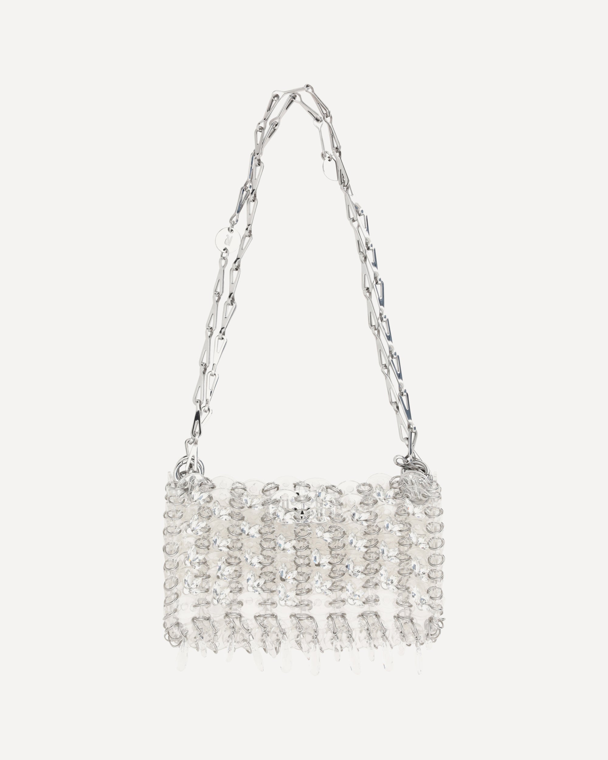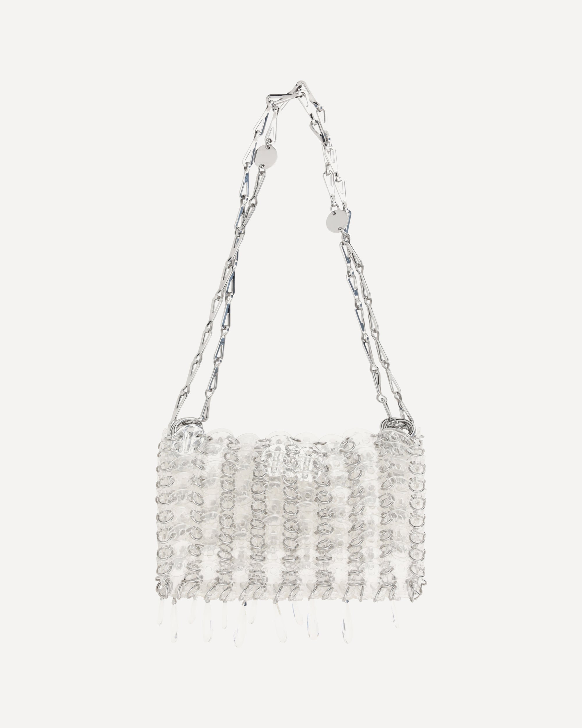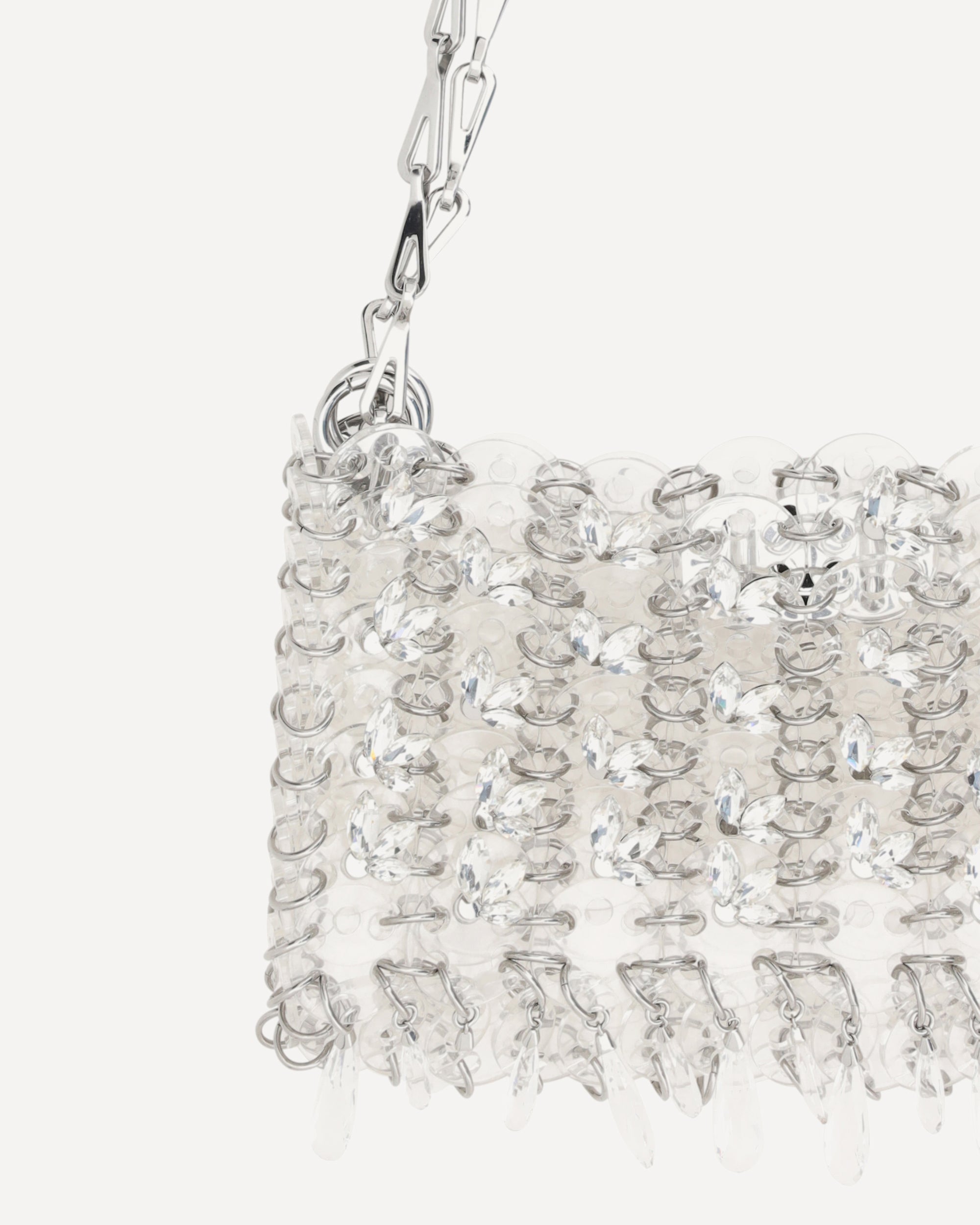Rabanne's 1969 Nano Shoulder Bag is a true style statement. Featuring a resin disc design, it adds a modern and unique touch. The chain shoulder strap lends elegance, while the top magnetic button closure provides practicality. On the bottom of the bag, drop-shaped crystal rhinestones lend a touch of luxury, while shiny all-over appliquéd moniline details make every corner of the bag bright and refined.