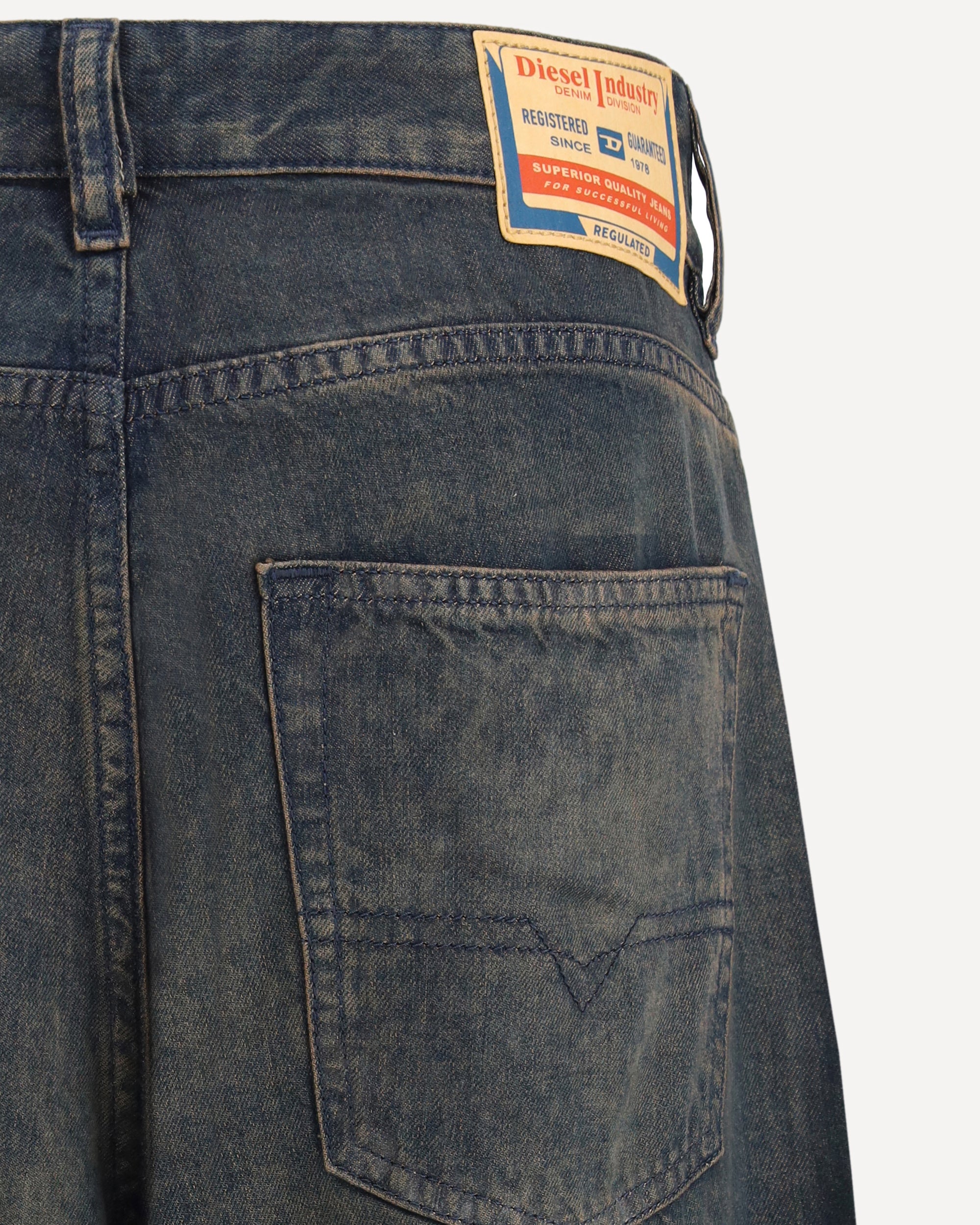 The Relaxed 1996 D-Sire Jeans by Diesel feature a relaxed fit with a low waist, low crotch, and extra-long wide leg. The loosest of Diesel’s denim silhouettes, they are designed for a drapey, oversized look. Crafted from dark blue lightweight Tencel Lyocell denim with a smooth, fluid texture, the wash is treated with spray and laser techniques to create a dégradé effect at the hem, enriched by sandy-toned dirt effects. Finished with a button fly.