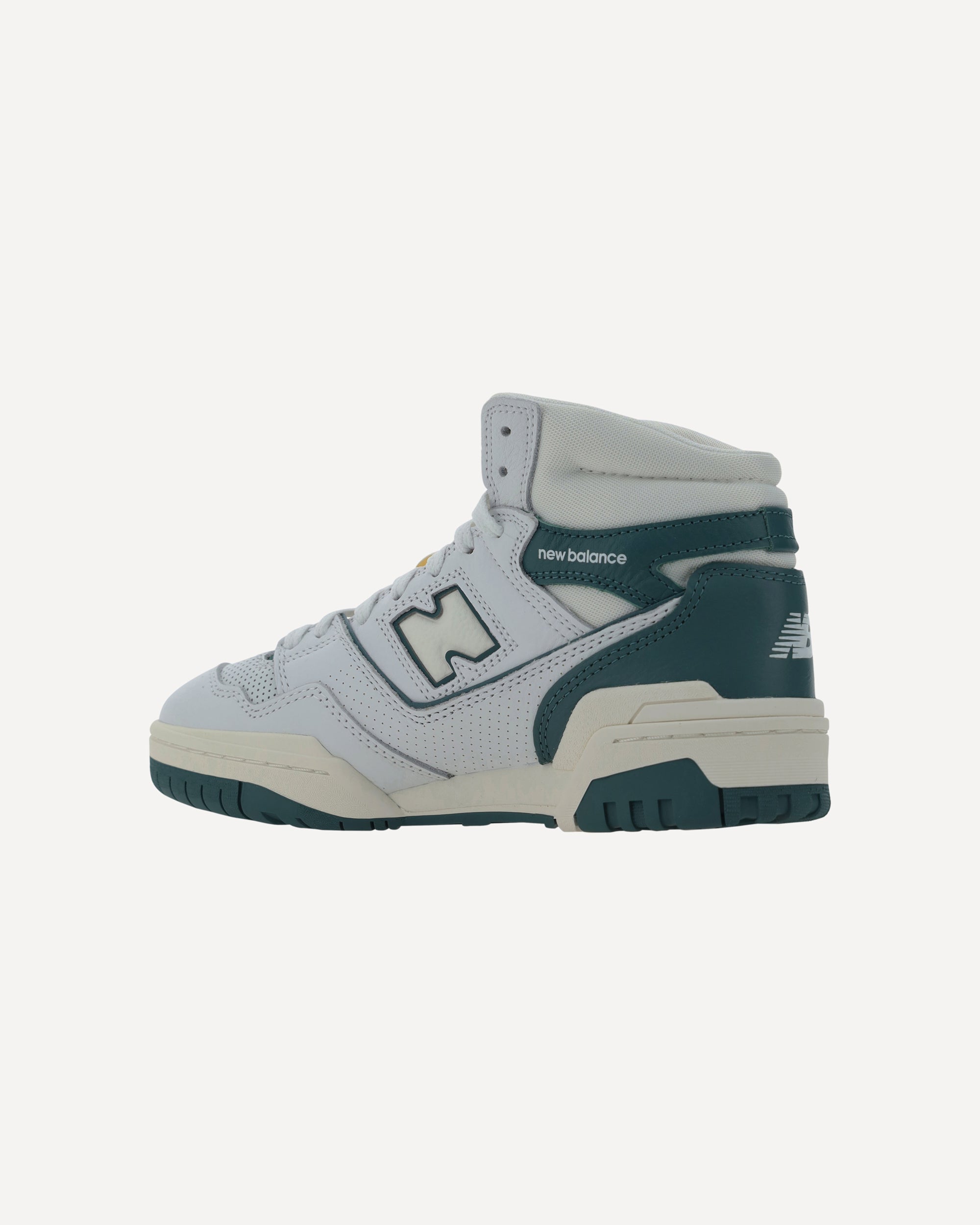 Calfskin 550 High Sneakers by New Balance, ankle-high style, lace-up front closure, embroidered brand logo patch on front tab, slightly extended toe, paneled design, perforated side panels, iconic brand logo on side panels, contrasting brand logo on heel.