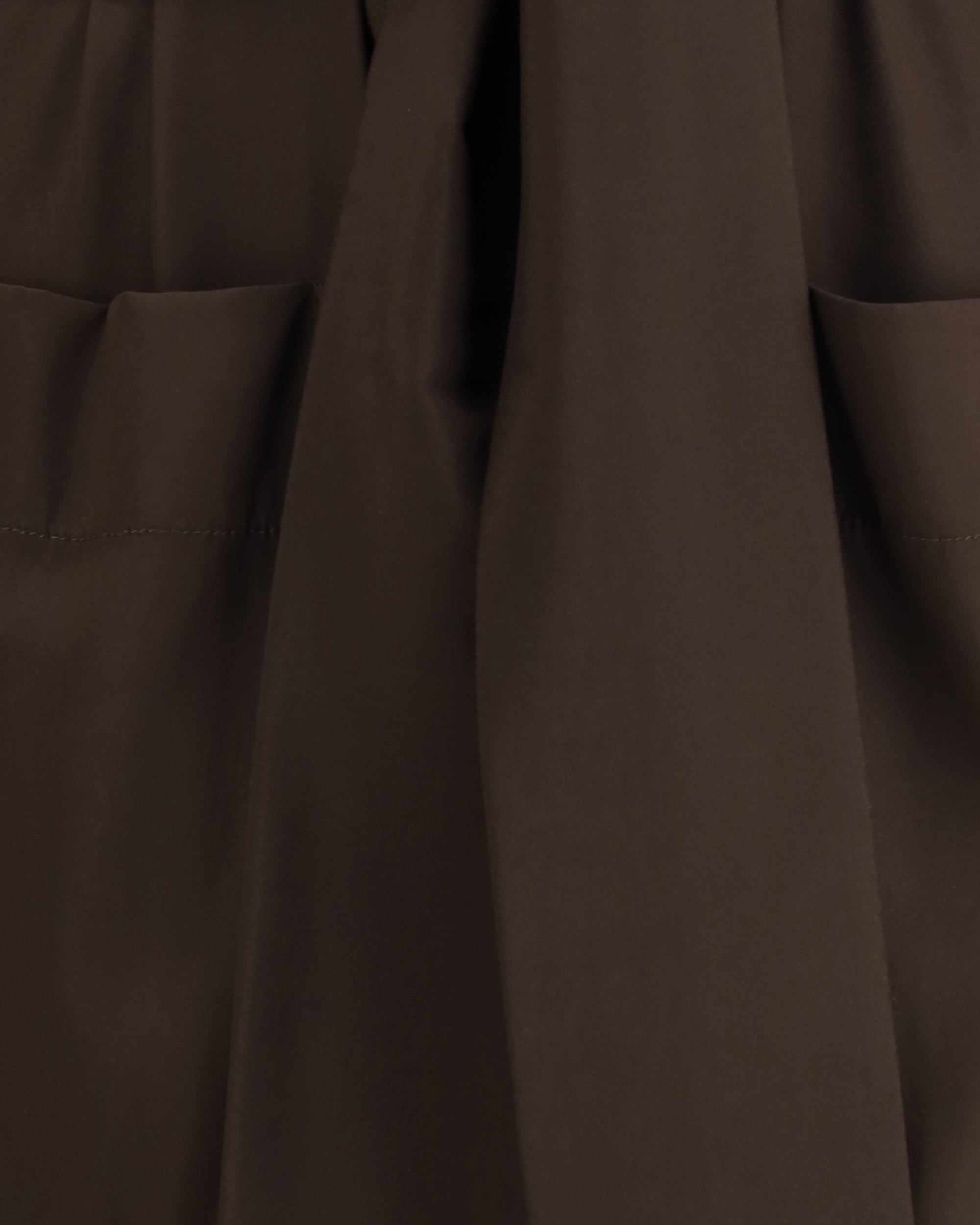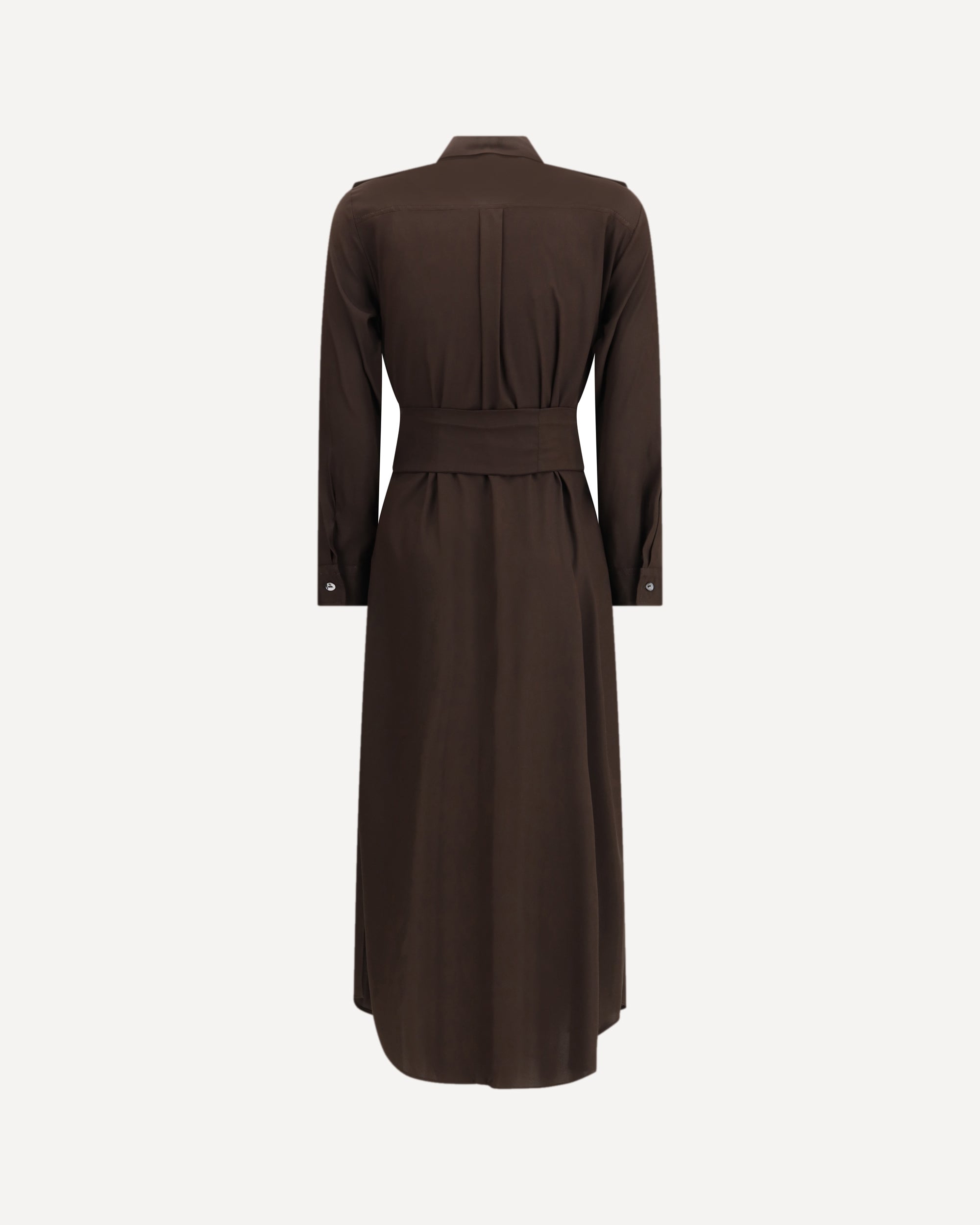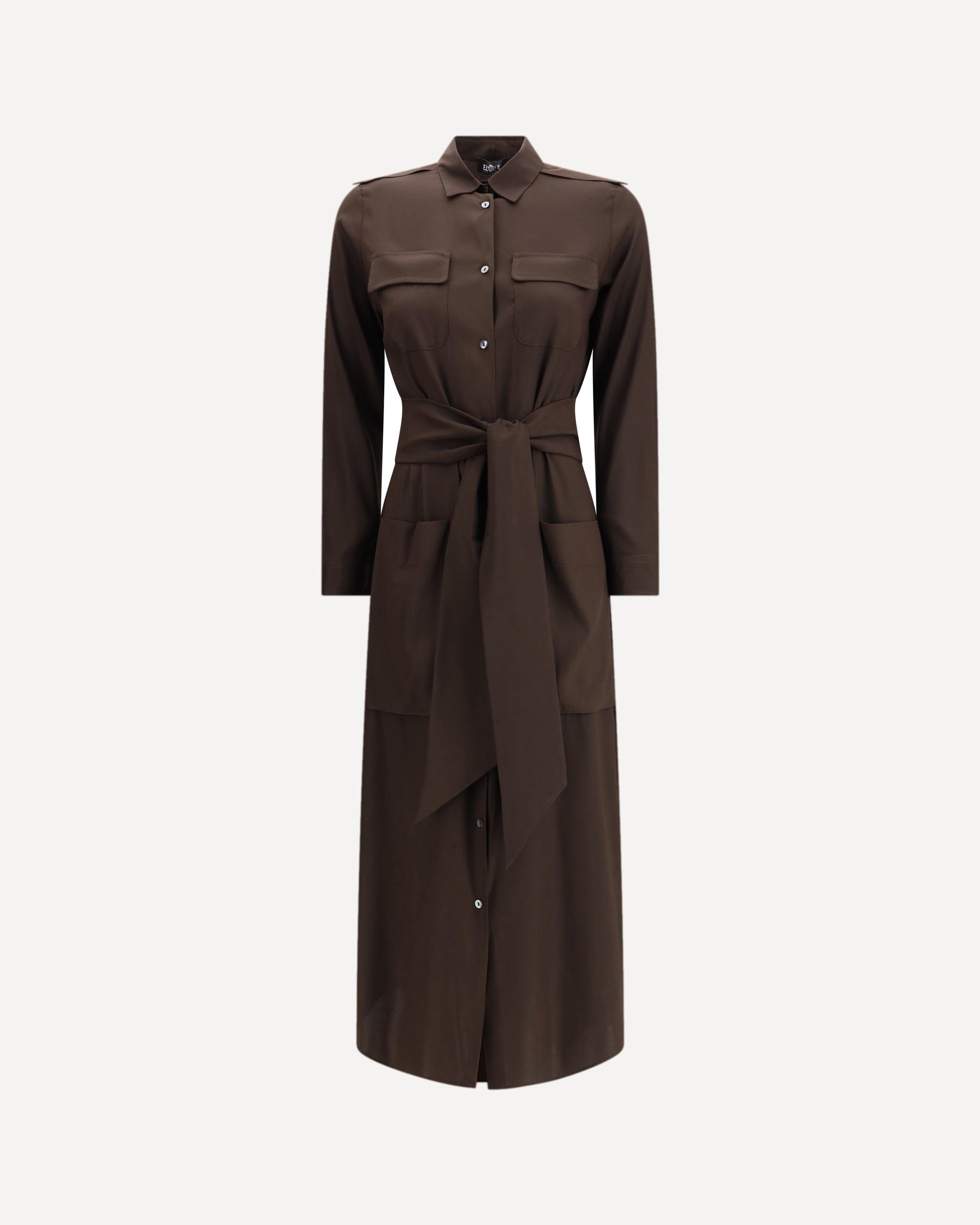The silk Dress by Ella balances sophistication and practicality through a harmonious blend of style and lightness. Crafted from pure silk, it features a utility-inspired design with four applied pockets: two smaller ones on the chest and two larger ones on the lower part. The button-down front and classic collar lend understated elegance, while the cuffed sleeves enhance its tailored appeal. A matching scarf, separate from the dress, completes the look with a fluid and refined touch.