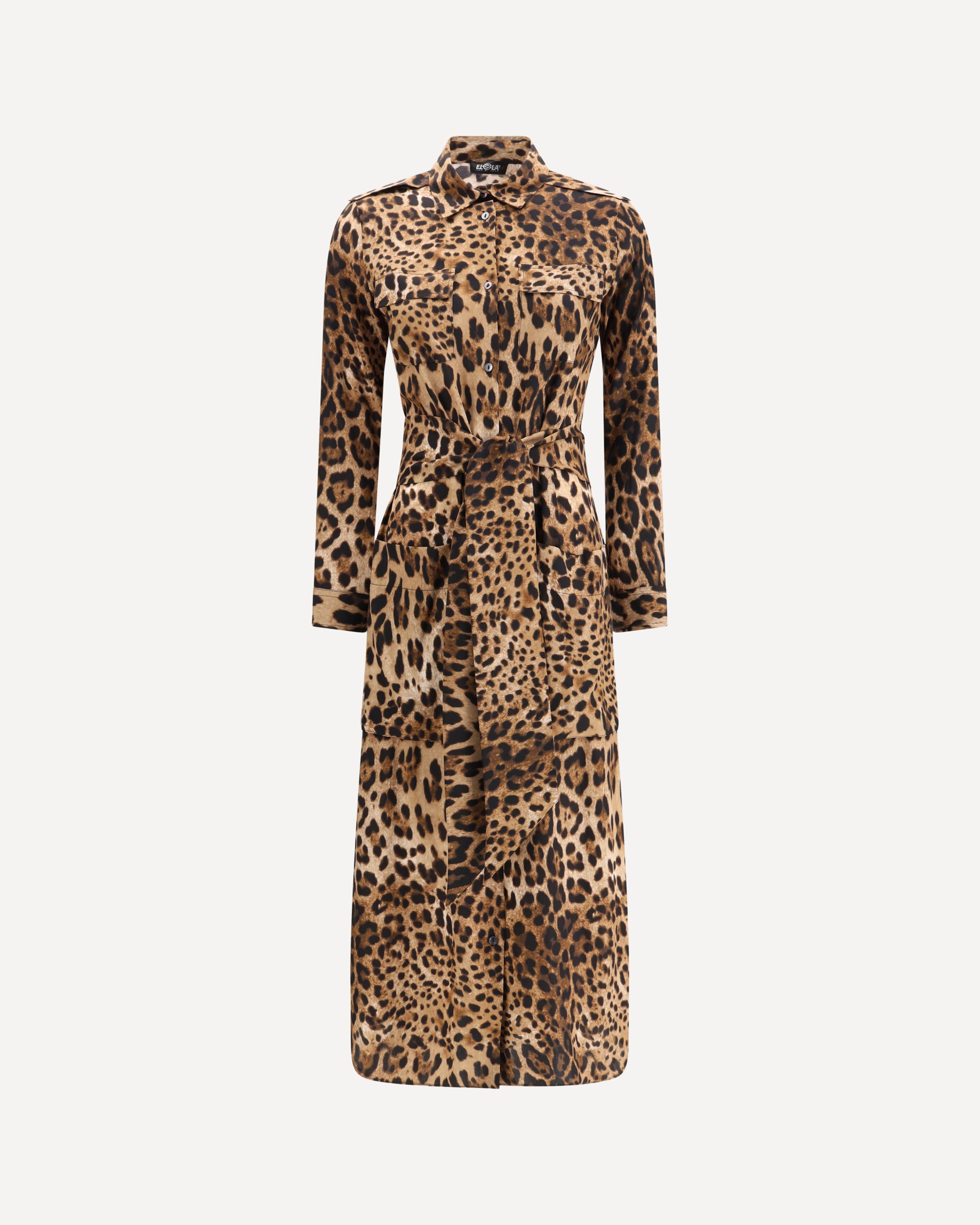 The patterned silk dress by Ella balances sophistication and practicality through a harmonious blend of style and lightness. Crafted from pure silk, it features a utility-inspired design with four applied pockets: two smaller ones on the chest and two larger ones on the lower part. The button-down front and classic collar lend understated elegance, while the cuffed sleeves enhance its tailored appeal. A matching scarf, separate from the dress, completes the look with a fluid and refined touch.