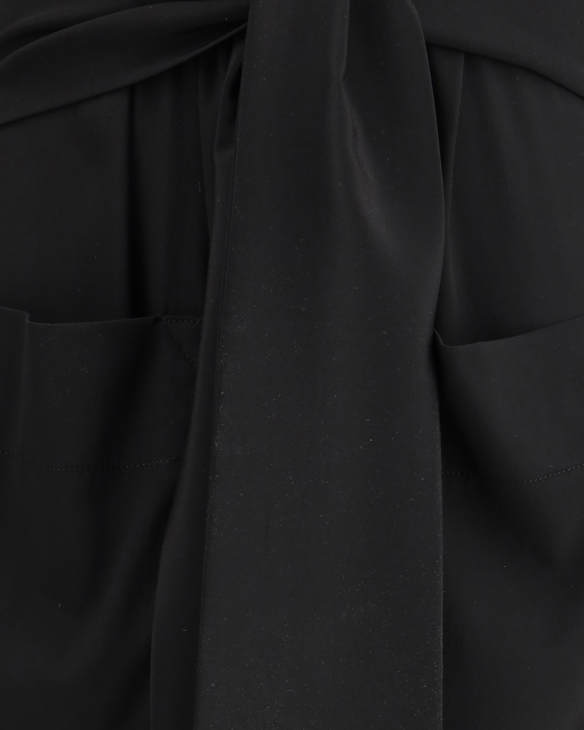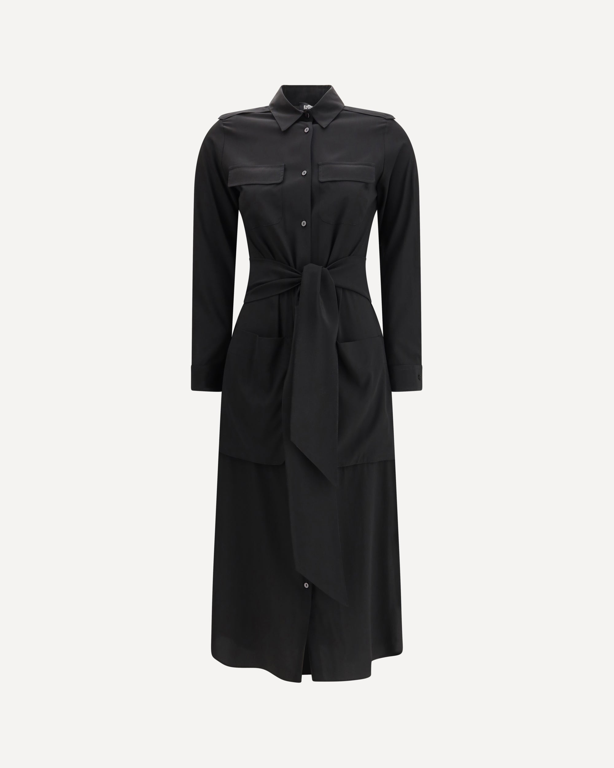 The silk Dress by Ella balances sophistication and practicality through a harmonious blend of style and lightness. Crafted from pure silk, it features a utility-inspired design with four applied pockets: two smaller ones on the chest and two larger ones on the lower part. The button-down front and classic collar lend understated elegance, while the cuffed sleeves enhance its tailored appeal. A matching scarf, separate from the dress, completes the look with a fluid and refined touch.