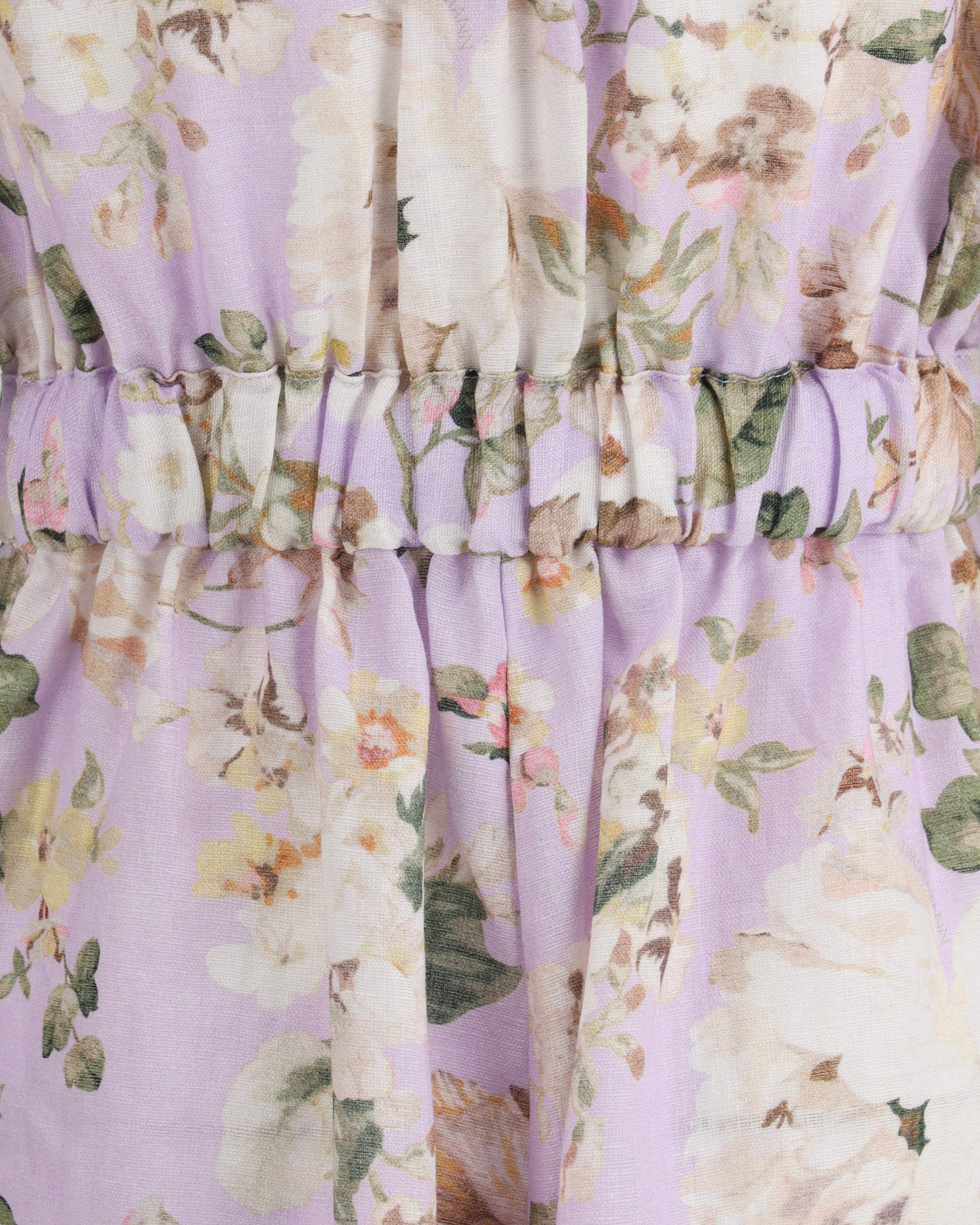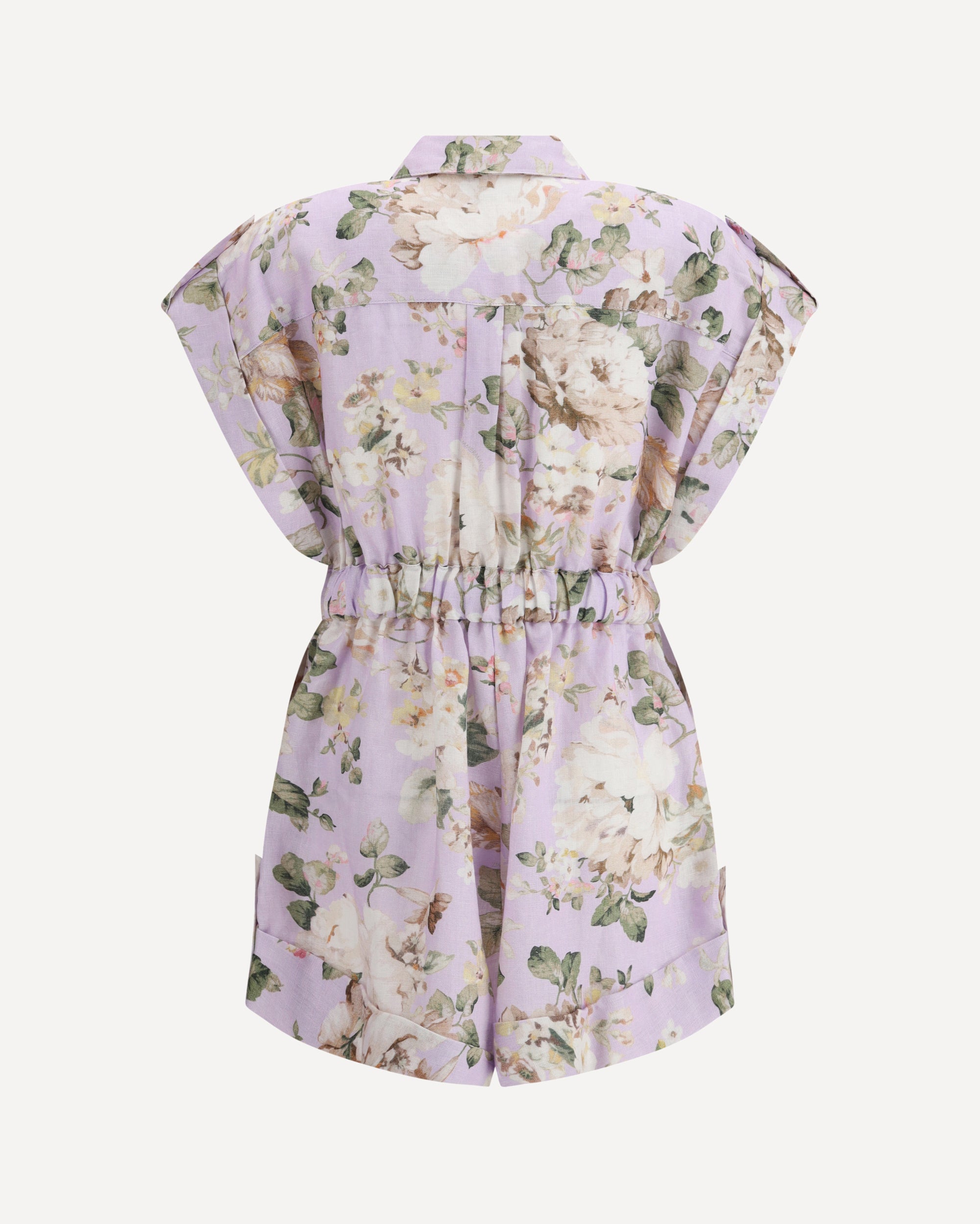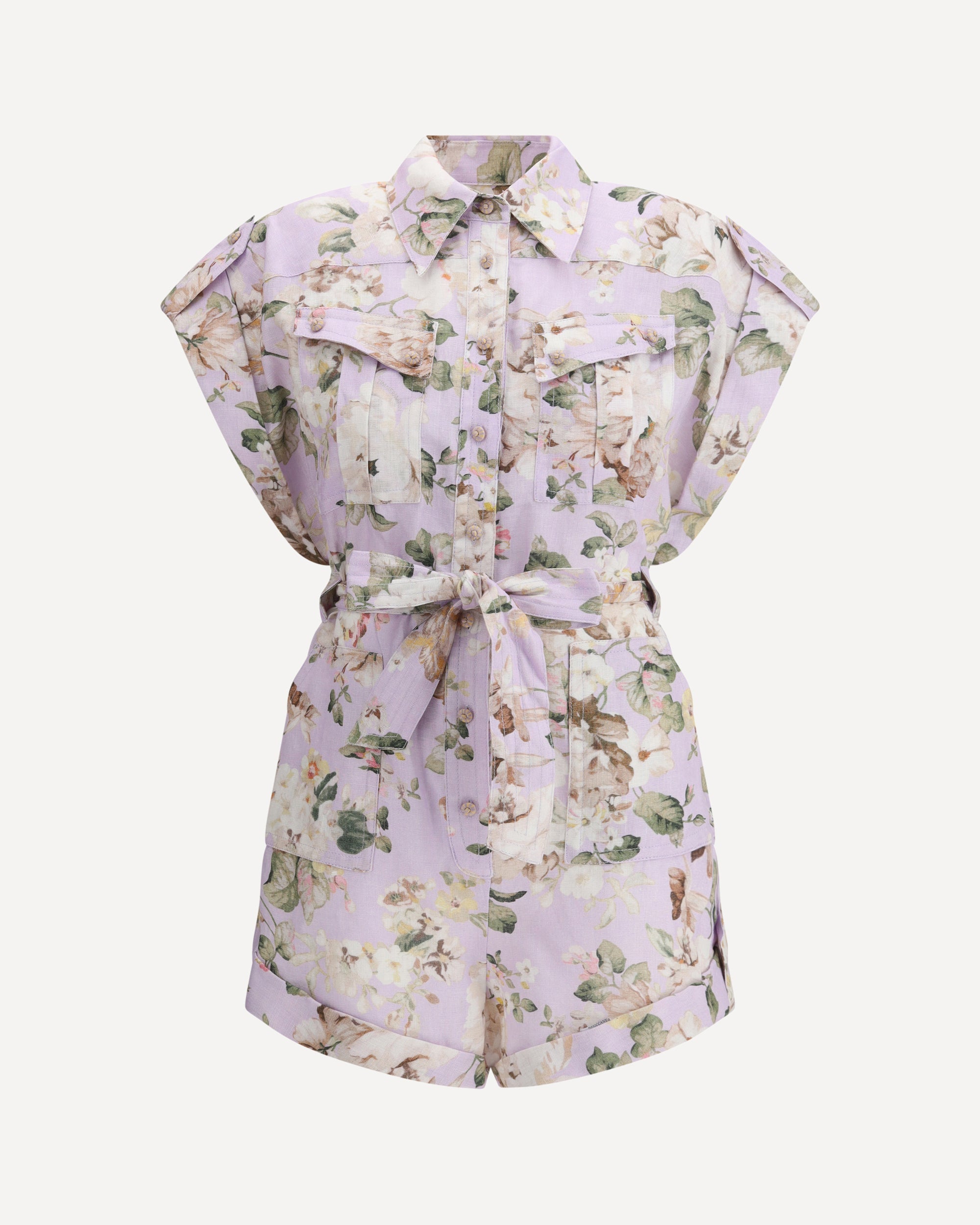Linen Acacia Pocket Playsuit by Zimmerman, design with turned-up short sleeves, classic collar, front closure using flower buttons, two patch pockets on front panel with flap and buttons, two side patch pockets, knotted and matching ribbon detail on front, elastic waistband on back panel, turned-up shorts hem, all-over flower pattern, regular fit.