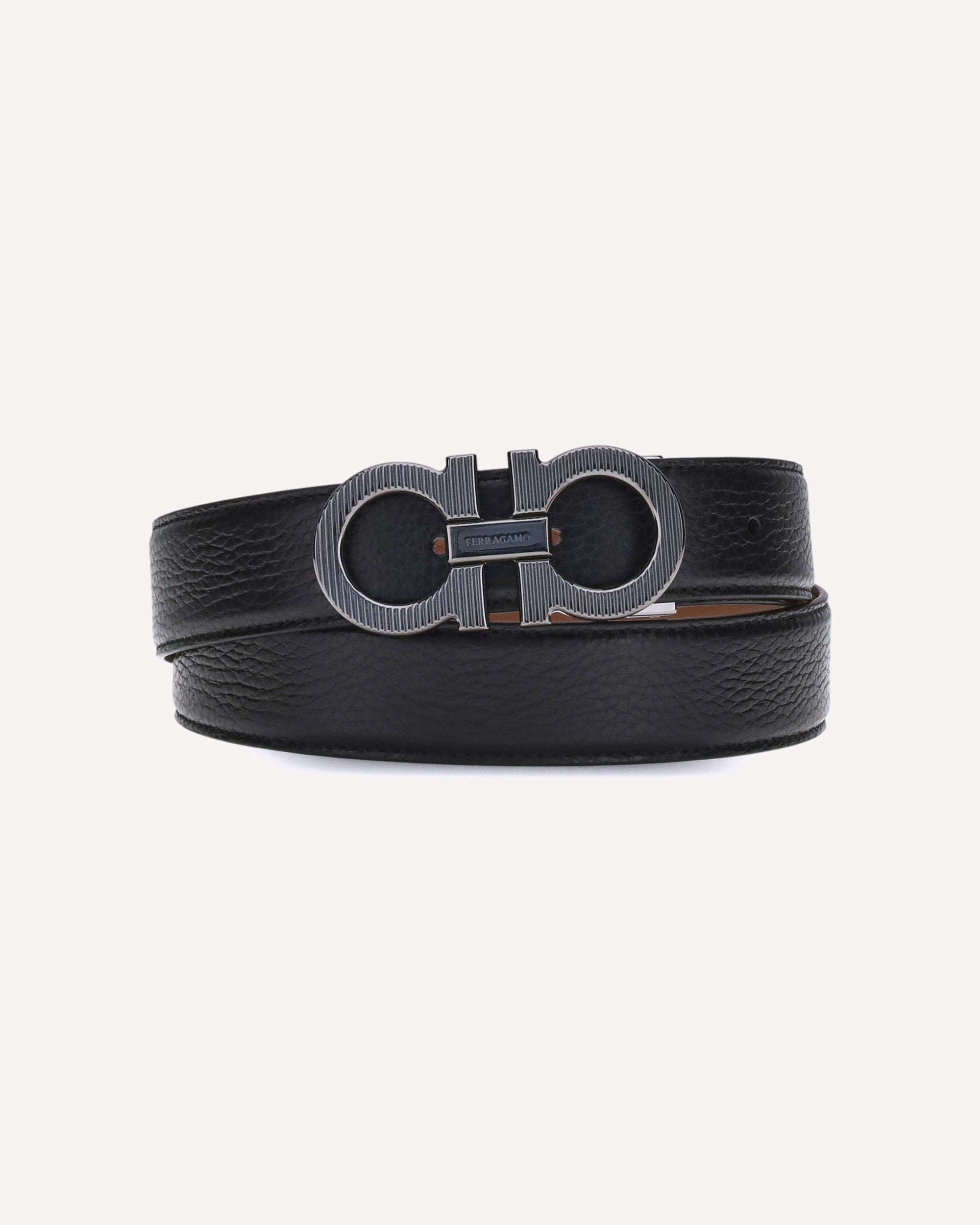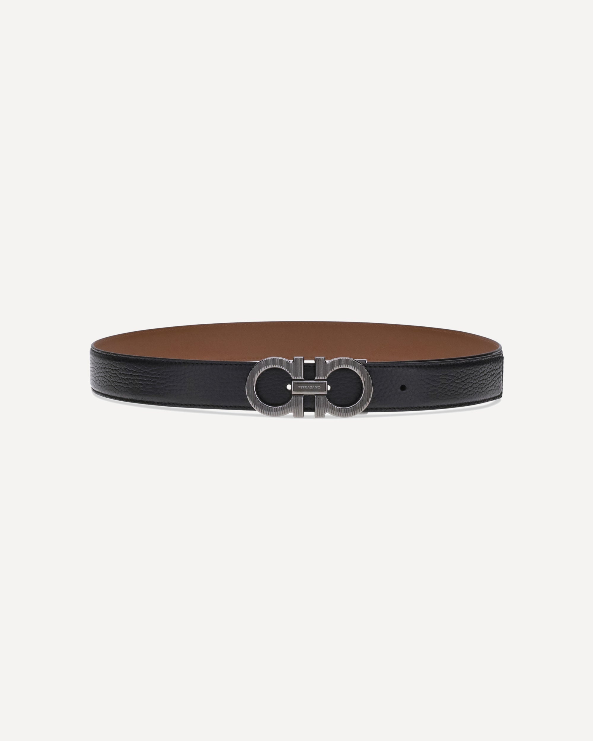 Ferragamo's Gancini reversible Belt is an iconic accessory, featuring its distinctive Gancini buckle in a ruthenium finish. The buckle is embellished with fine vertical knurling, adding a touch of elegance. This model is also adjustable in length, ensuring a perfectly tailored fit and style for any occasion.