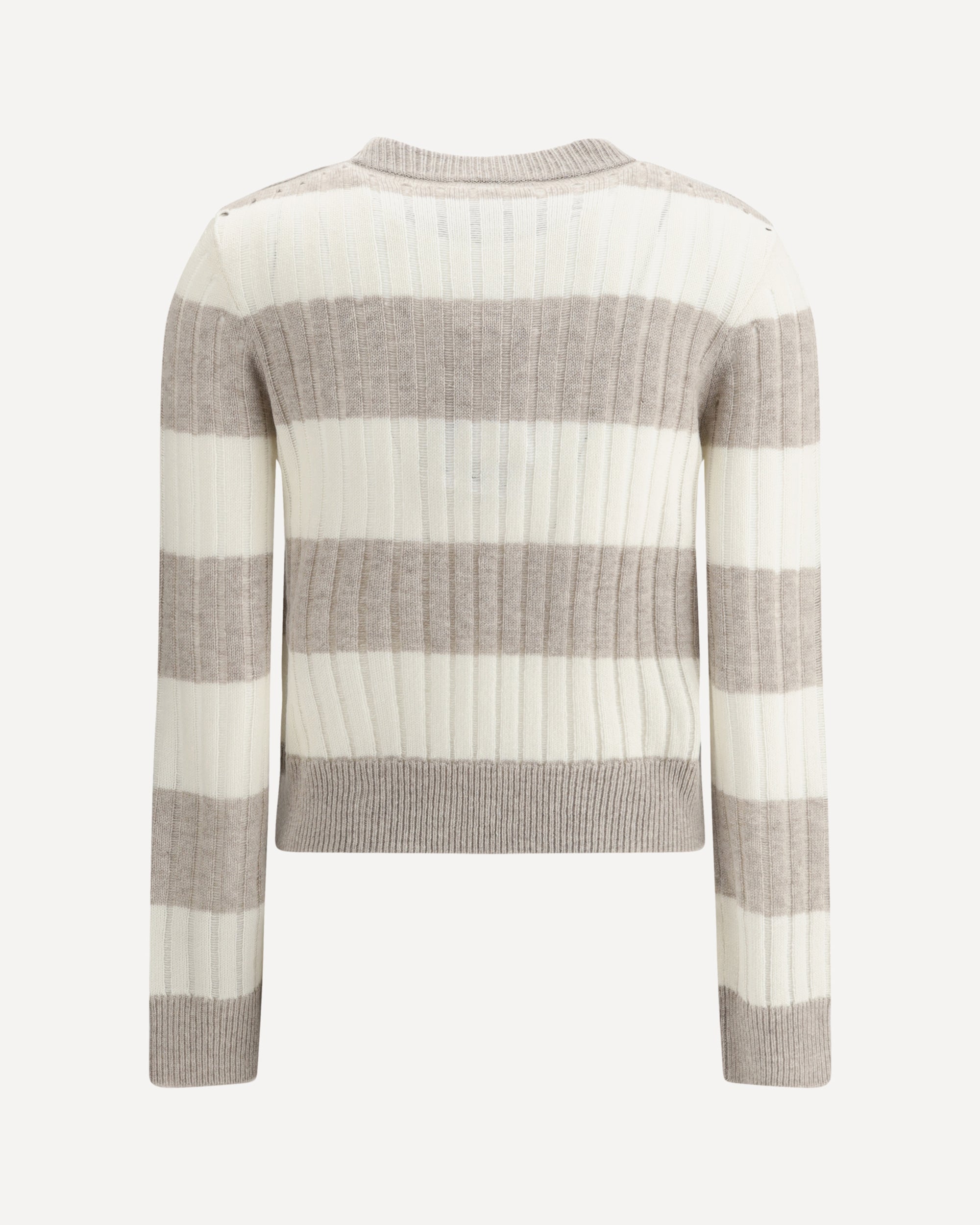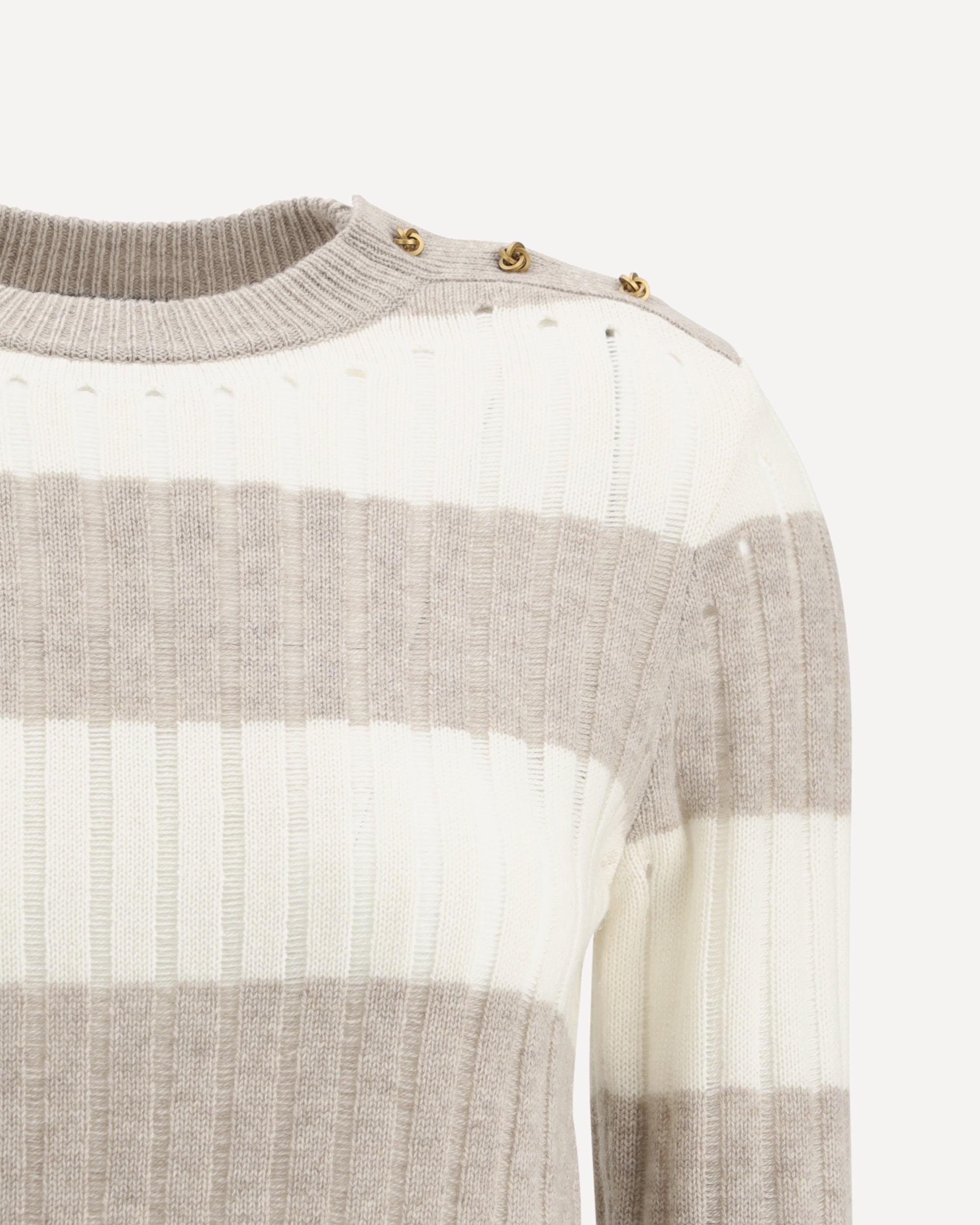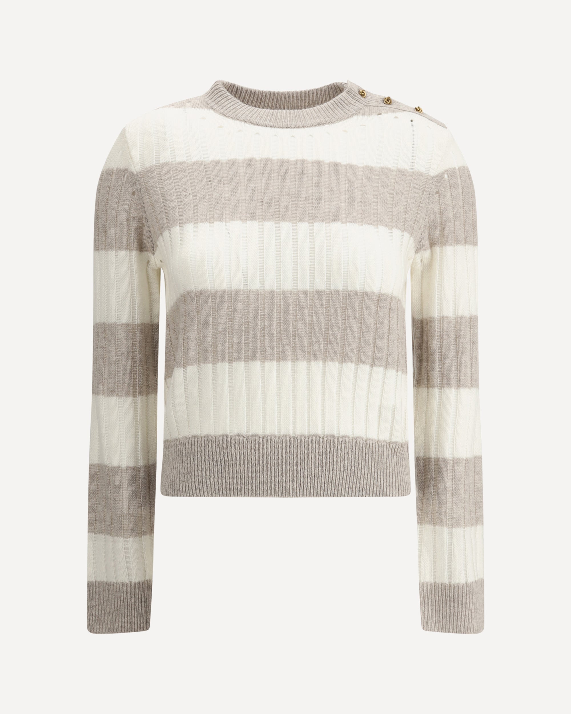 Max Mara's Alfeo Sweater is a sophisticated, modern piece made from soft, high-quality wool. The ribbed crew neck lends a classic and versatile touch, while the embossed buttons at the shoulder add a distinctive detail and an accent of elegance. The ribbed design extends across the sweater's entire surface, giving visible texture and a perfect fit that conforms to the silhouette. The wide stripe pattern brings an element of freshness and dynamism, creating an interesting contrast that enriches the look without being too bold.