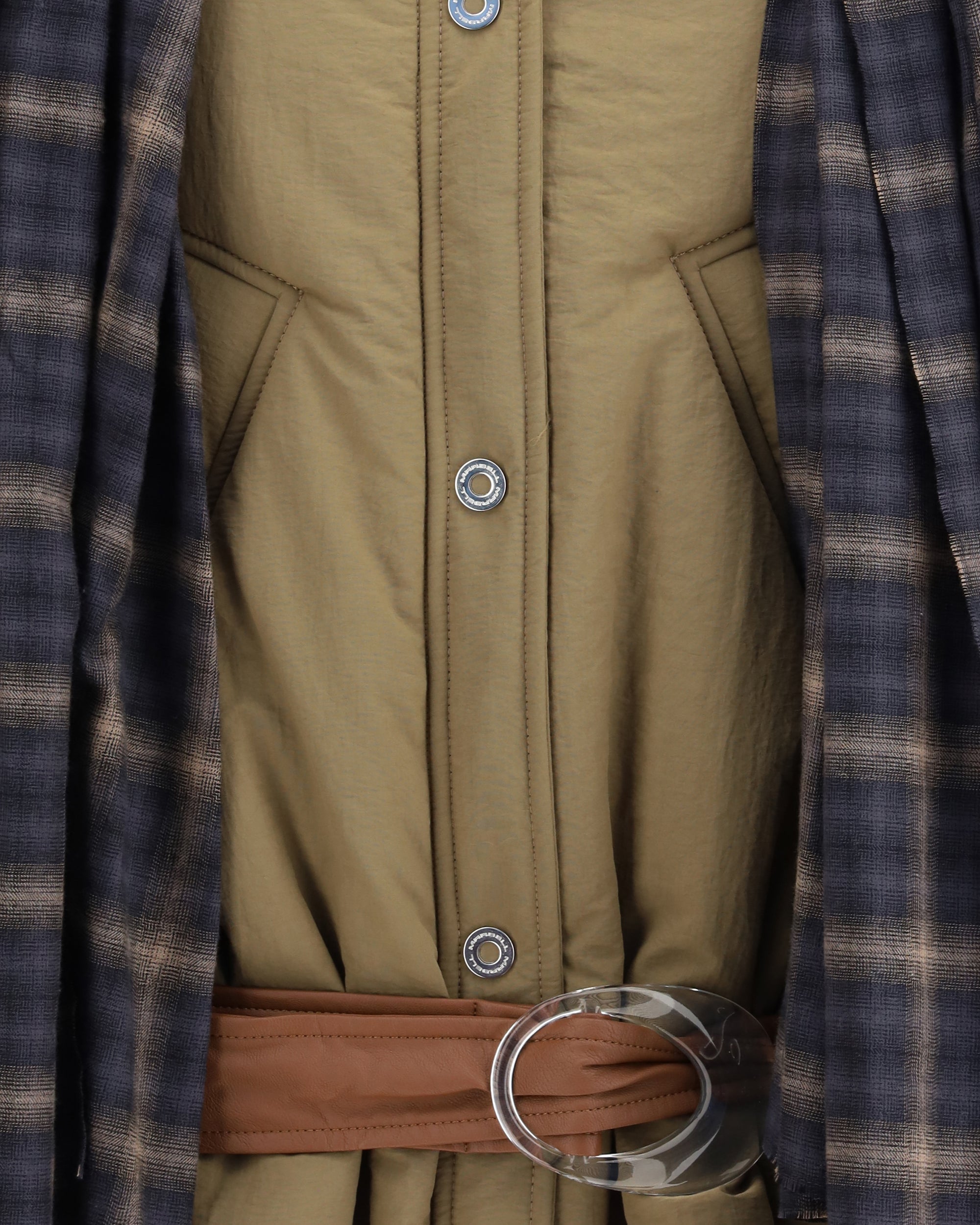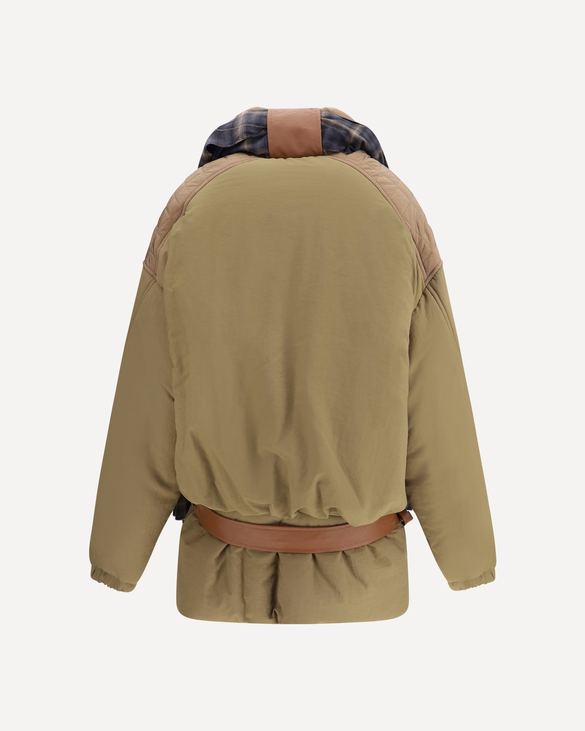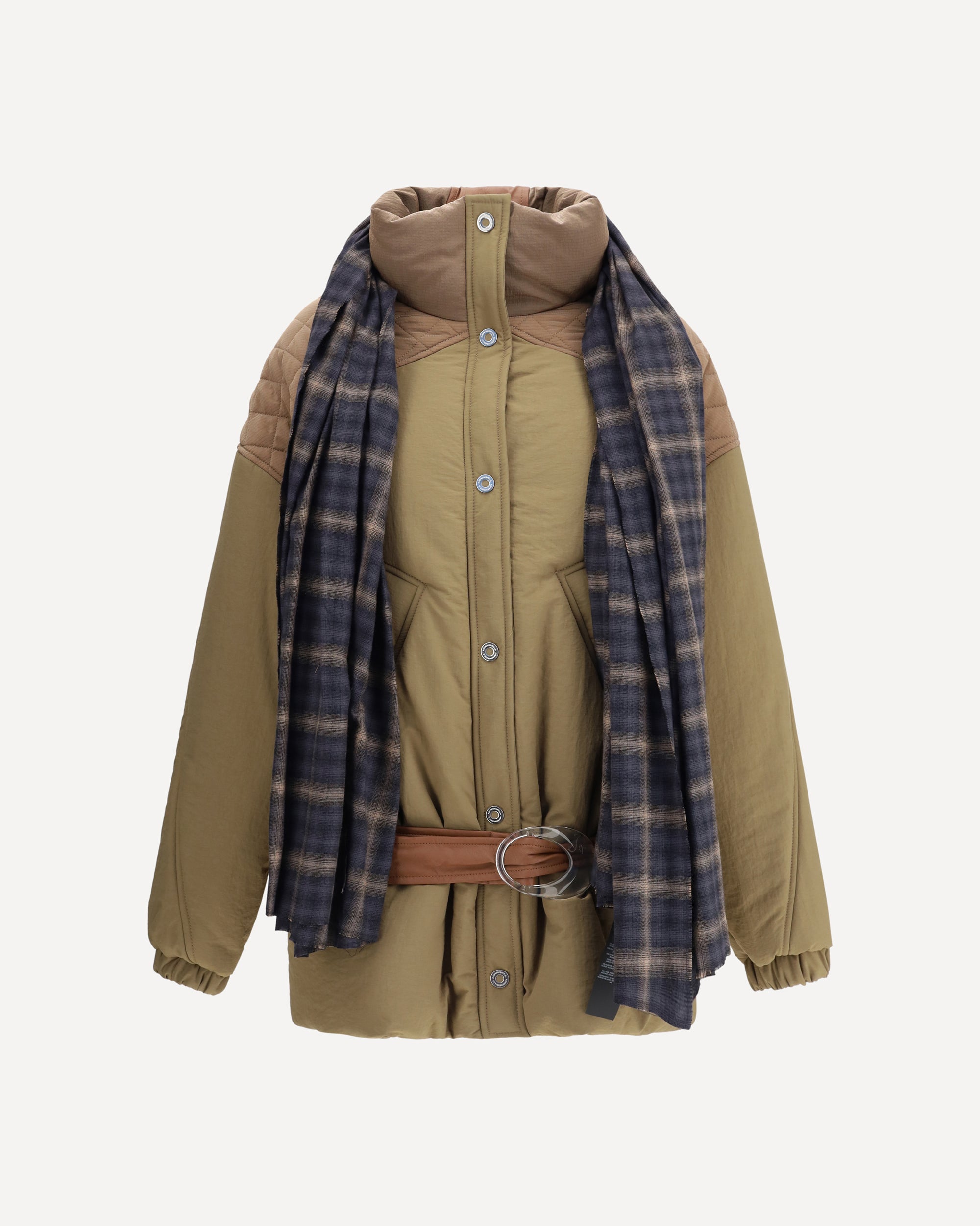 The Amy Jacket by Marbell is crafted from padded technical fabric with quilted details, a high collar, and front snap-button closure. It features functional pockets, long sleeves with elastic cuffs, and dropped shoulders for optimal comfort. The design is completed by a removable scarf and a removable faux-leather fabric belt, making the piece versatile and modern.