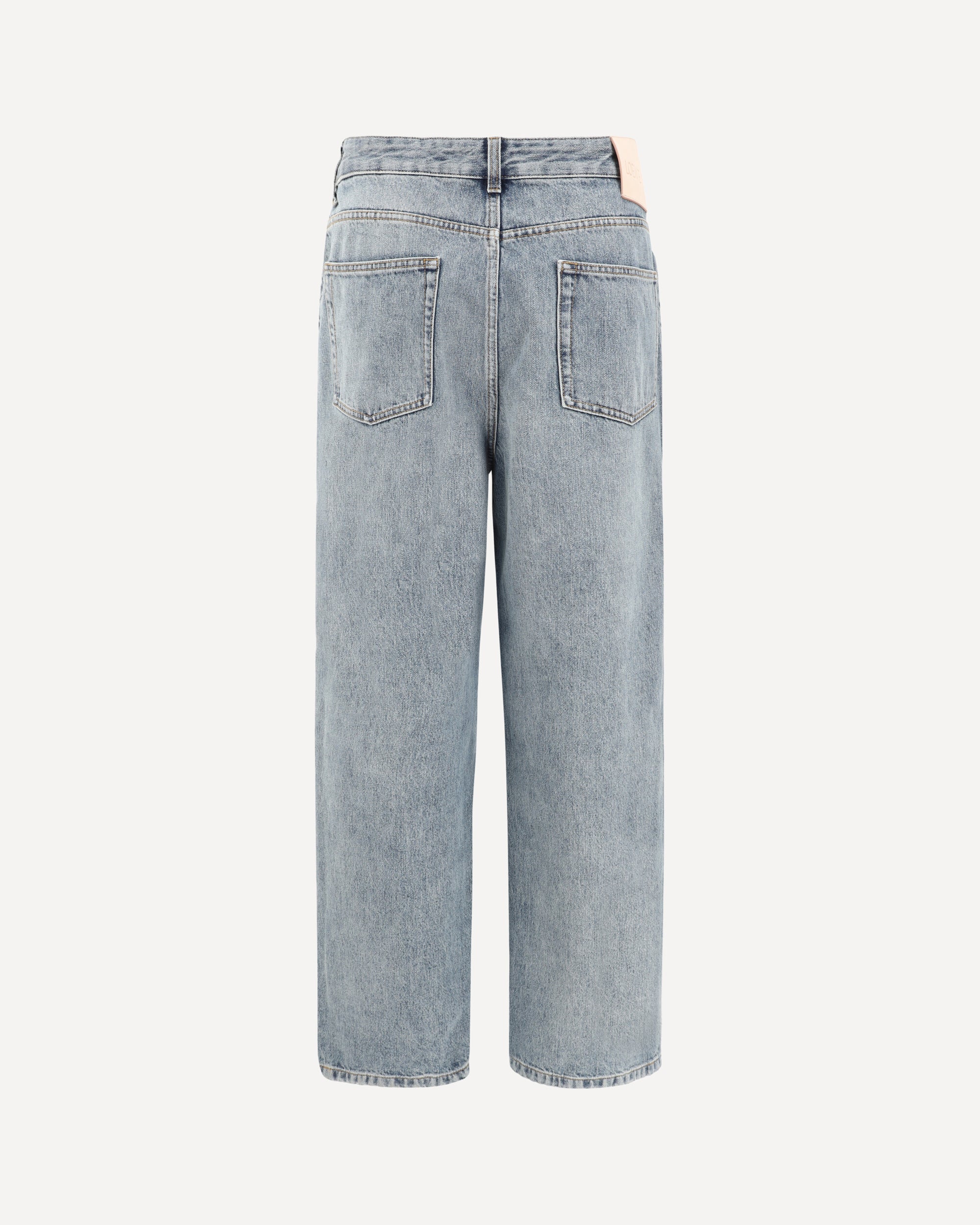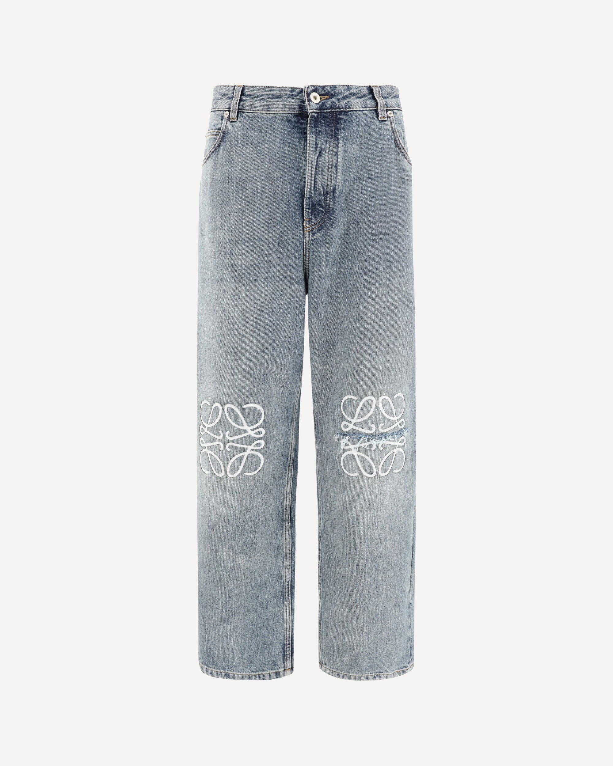 Loewe's five-pocket baggy jeans are a garment that mixes comfort and high fashion with a bold design. The front zipper and button closure, along with belt loops on the waistband, ensure a comfortable and adjustable fit. The baggy style offers a loose, relaxed silhouette perfect for a casual, modern look. The brand's iconic logo stitched on the knees adds a distinctive and unique touch, making these jeans not only a practical garment, but also a style statement. Versatile and contemporary, they are ideal for those seeking a balance between comfort and high-fashion trends.