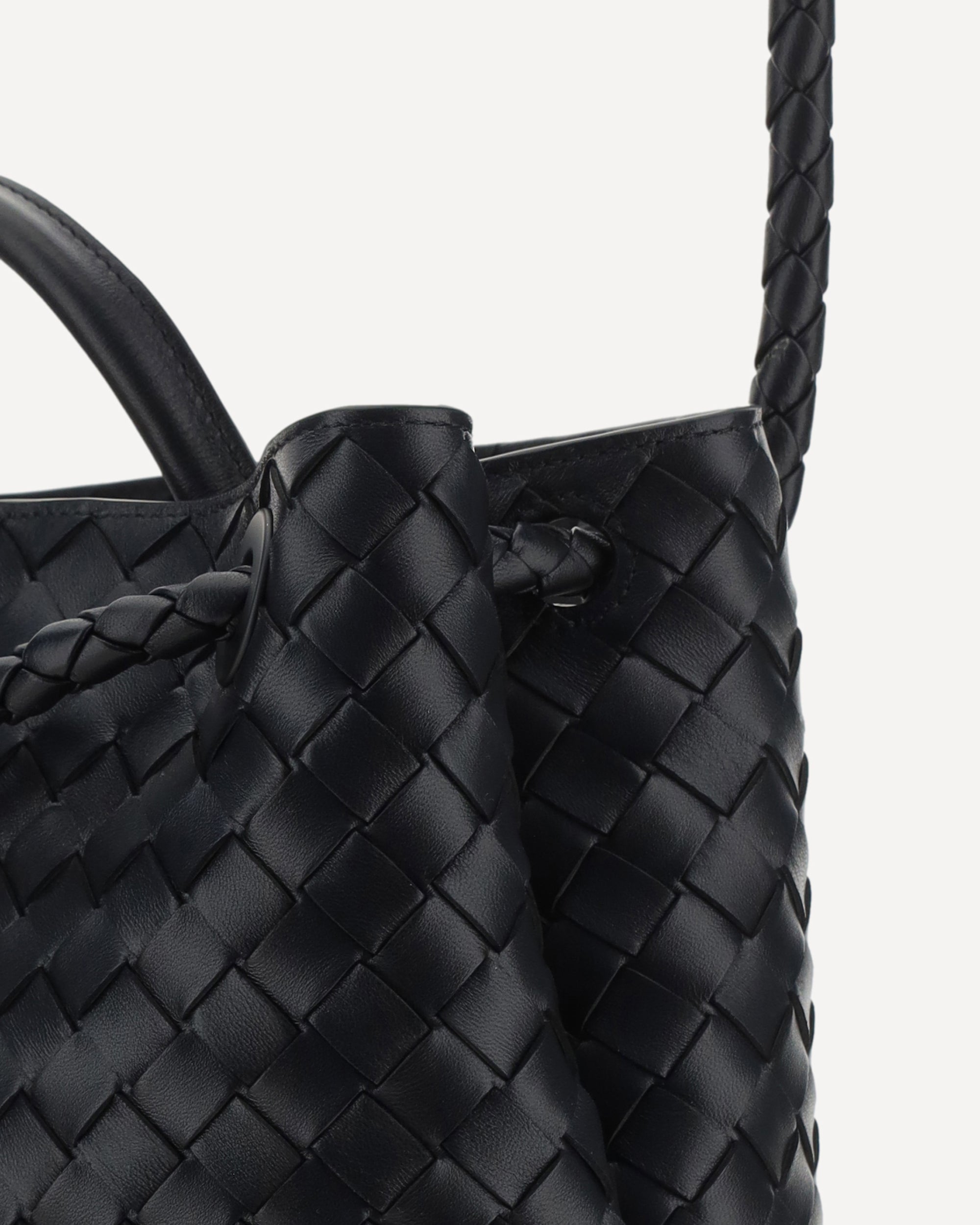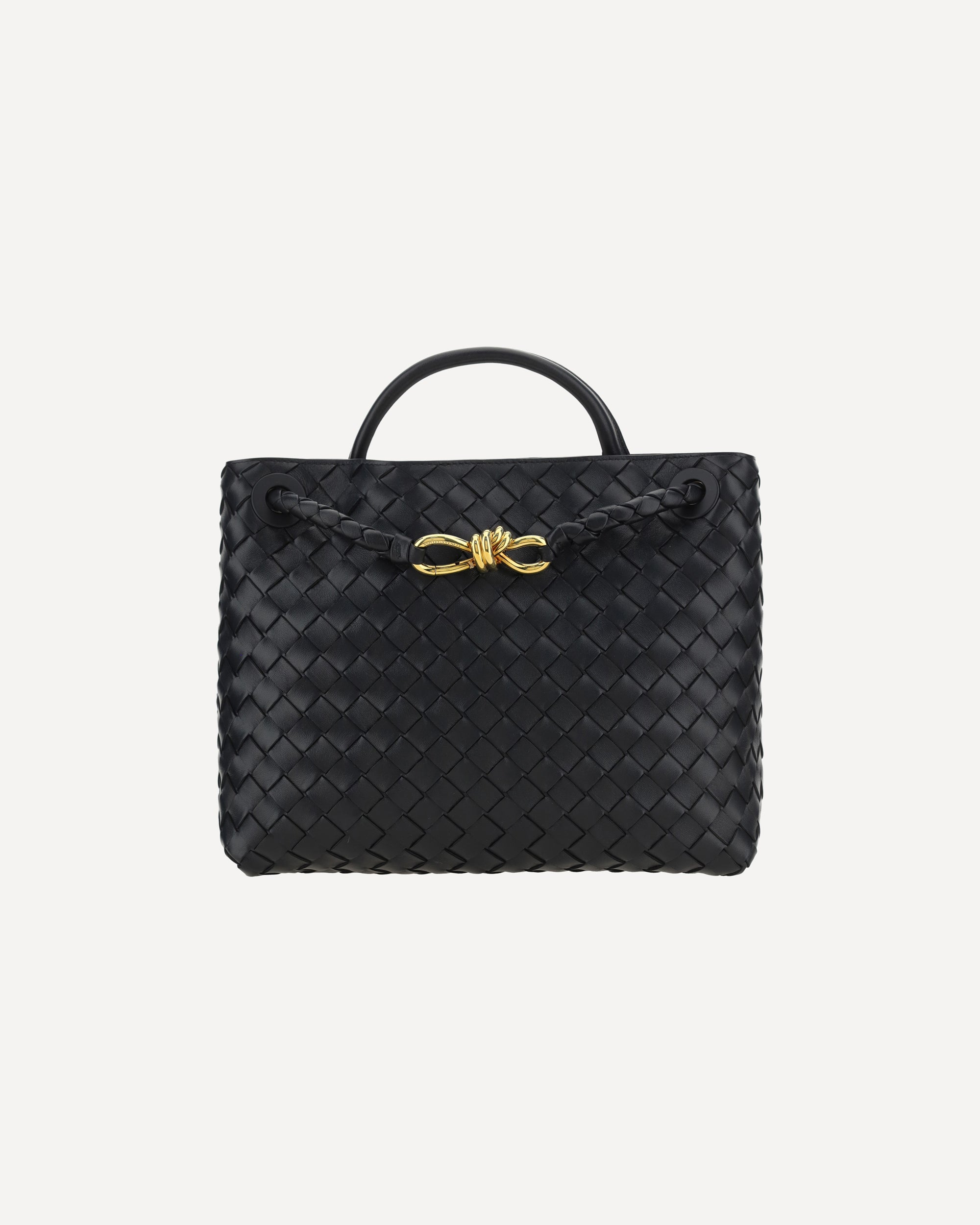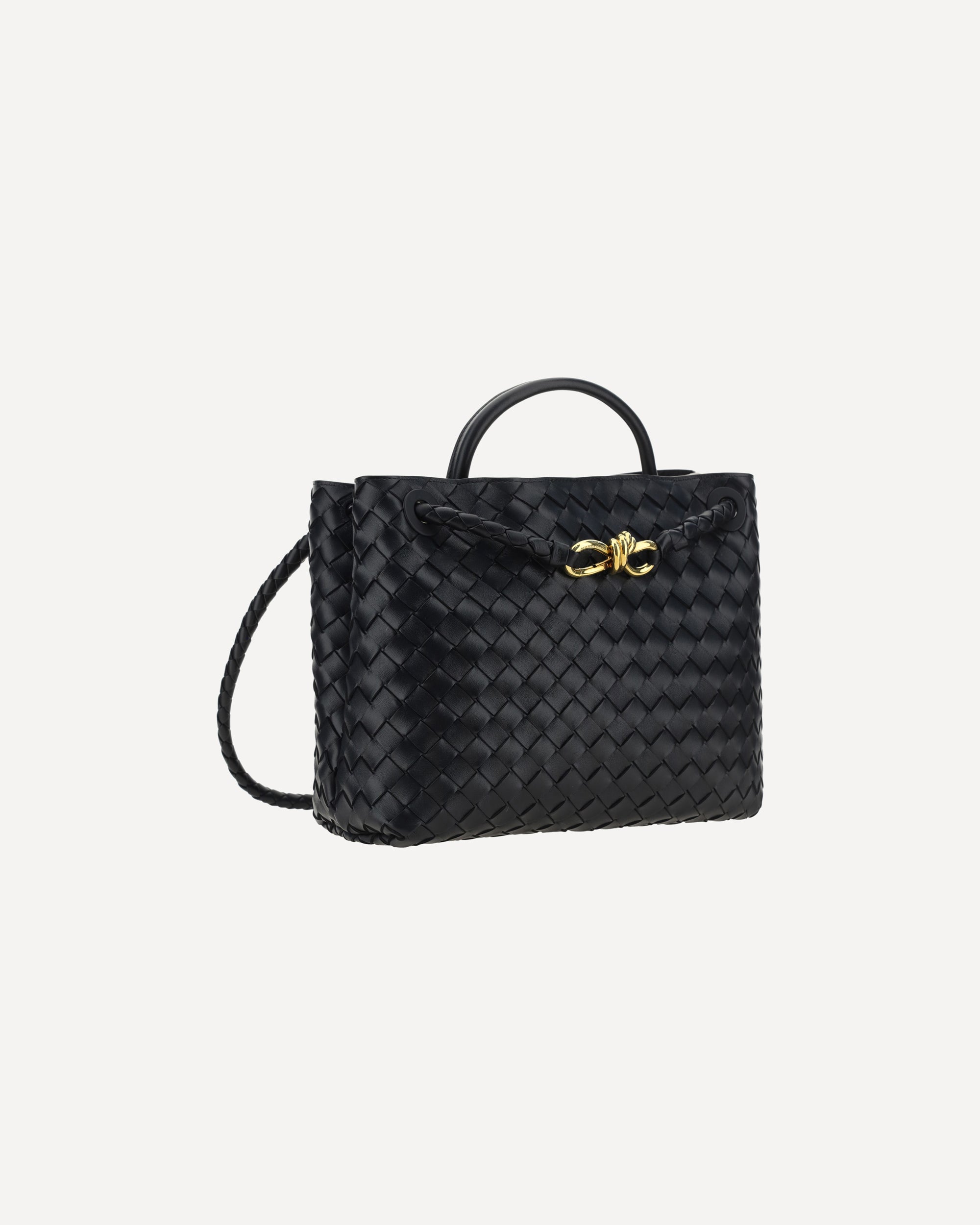 The Andiamo Shoulder Bag by Bottega Veneta in lambskin features a single, stiff top handle for an elegant grip. The slim sliding shoulder strap is embellished with the iconic antique brass knotted detail on the front. The design features the brand's iconic all-over repeated weave. Inside, the bag offers a single interior compartment, ideal for simple and elegant organization.