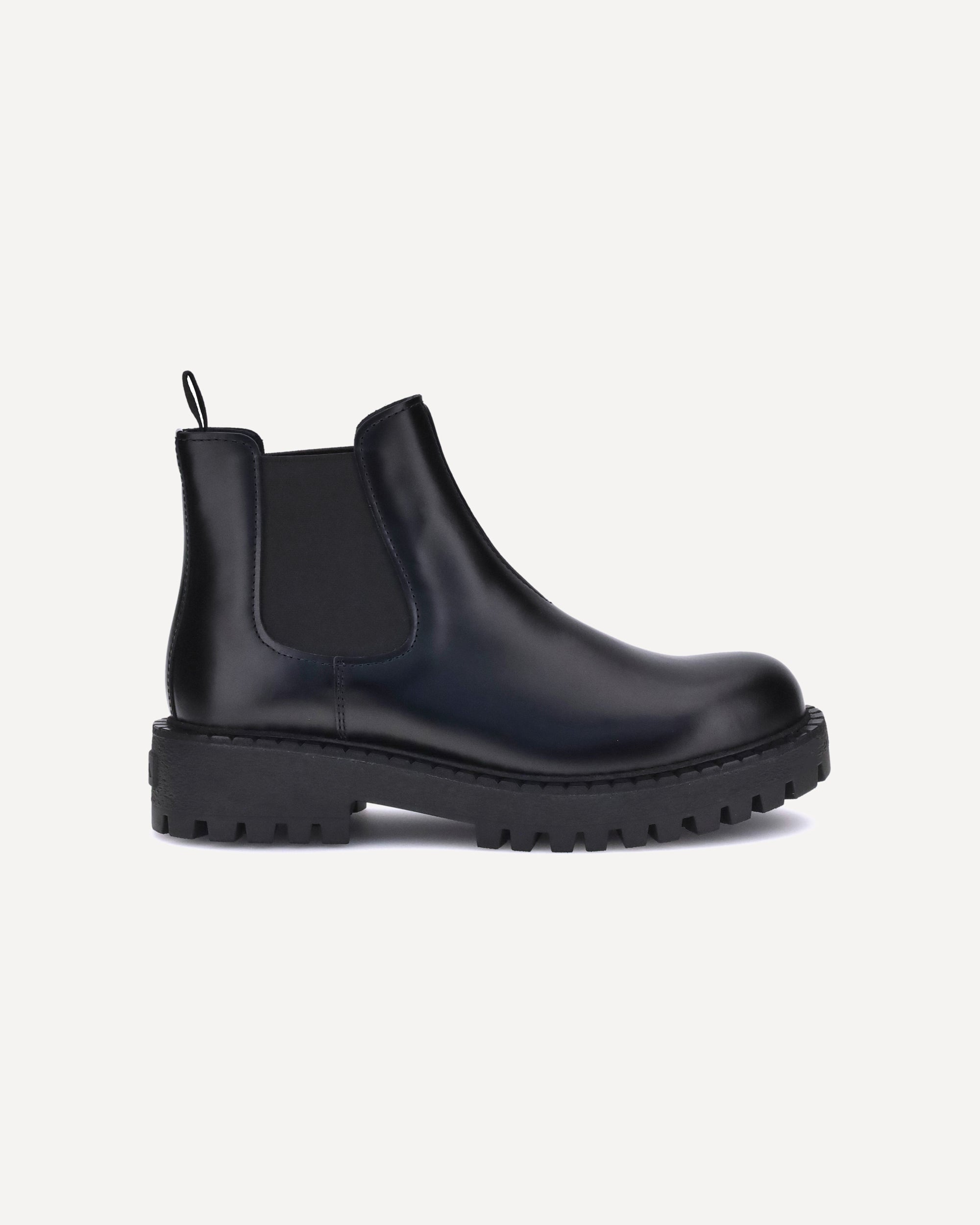 Prada's Chelsea Boots are a contemporary and versatile interpretation of a timeless classic. Made of fine leather, these boots combine elegance with a practical design thanks to the model's signature side elastic band. The volume rubber soles, enhanced by a double welt and a lightweight lug tread, provide grip and a modern touch. The design is complemented by essential details, such as the tone-on-tone imprinted lettering logo, which discreetly underscores the brand's identity.