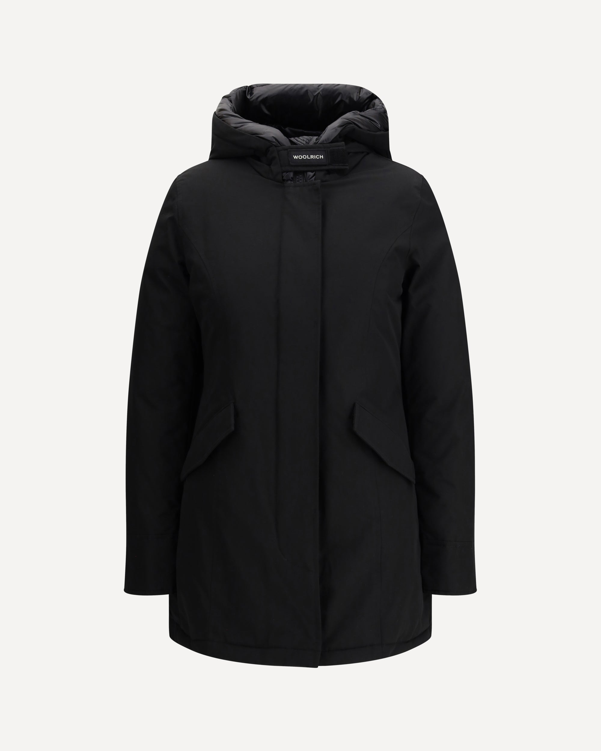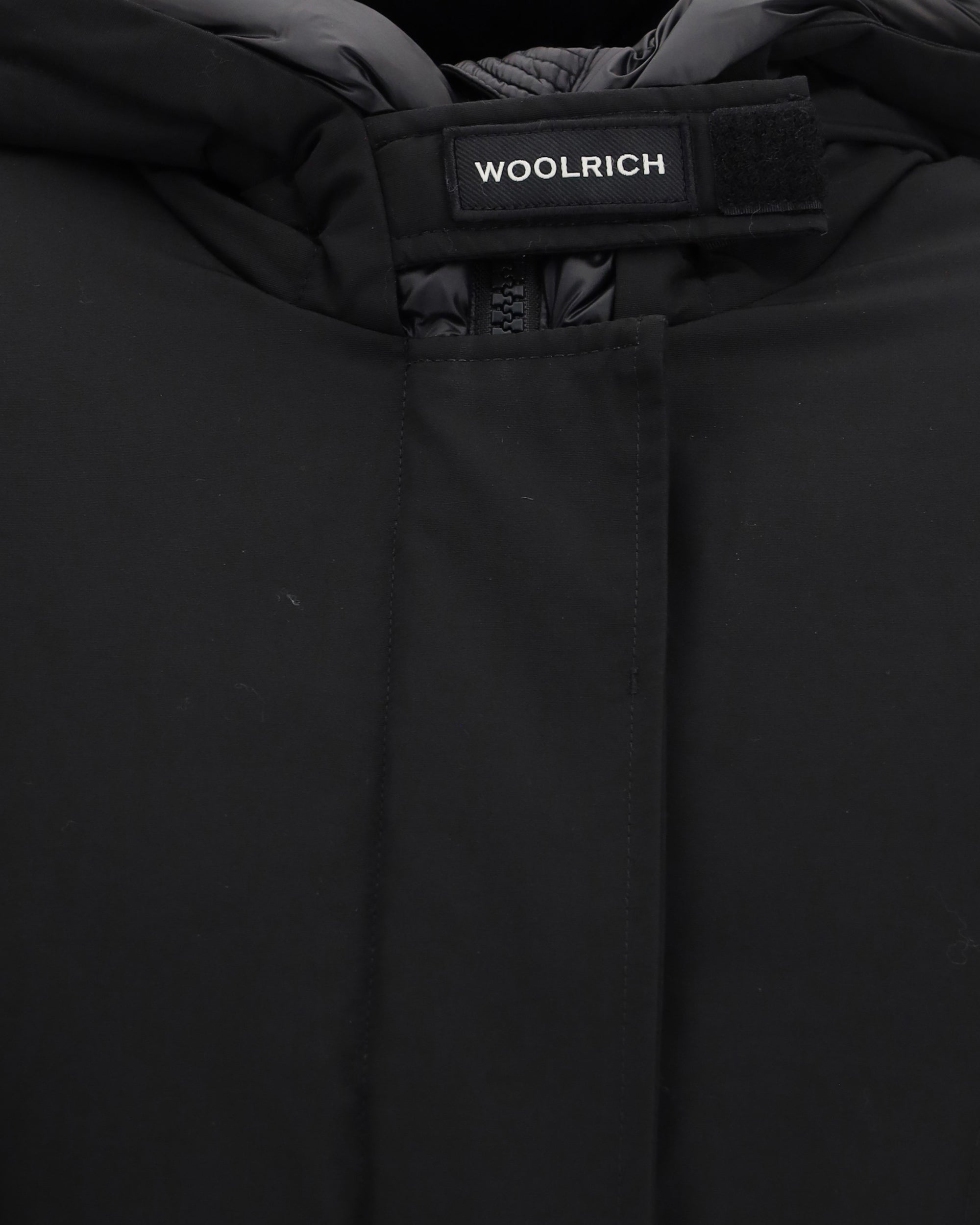 Arctic parka Jacket by Woolrich is made of durable Ramar Cloth fabric, treated with Teflon coating to provide protection from water and wind. Featuring a front zipper and concealed button closure, it has a protective hood, Velcro closure with logo on the collar and slanted flap pockets. Ribbed inner cuffs provide additional comfort and insulation, making the garment ideal for colder days.