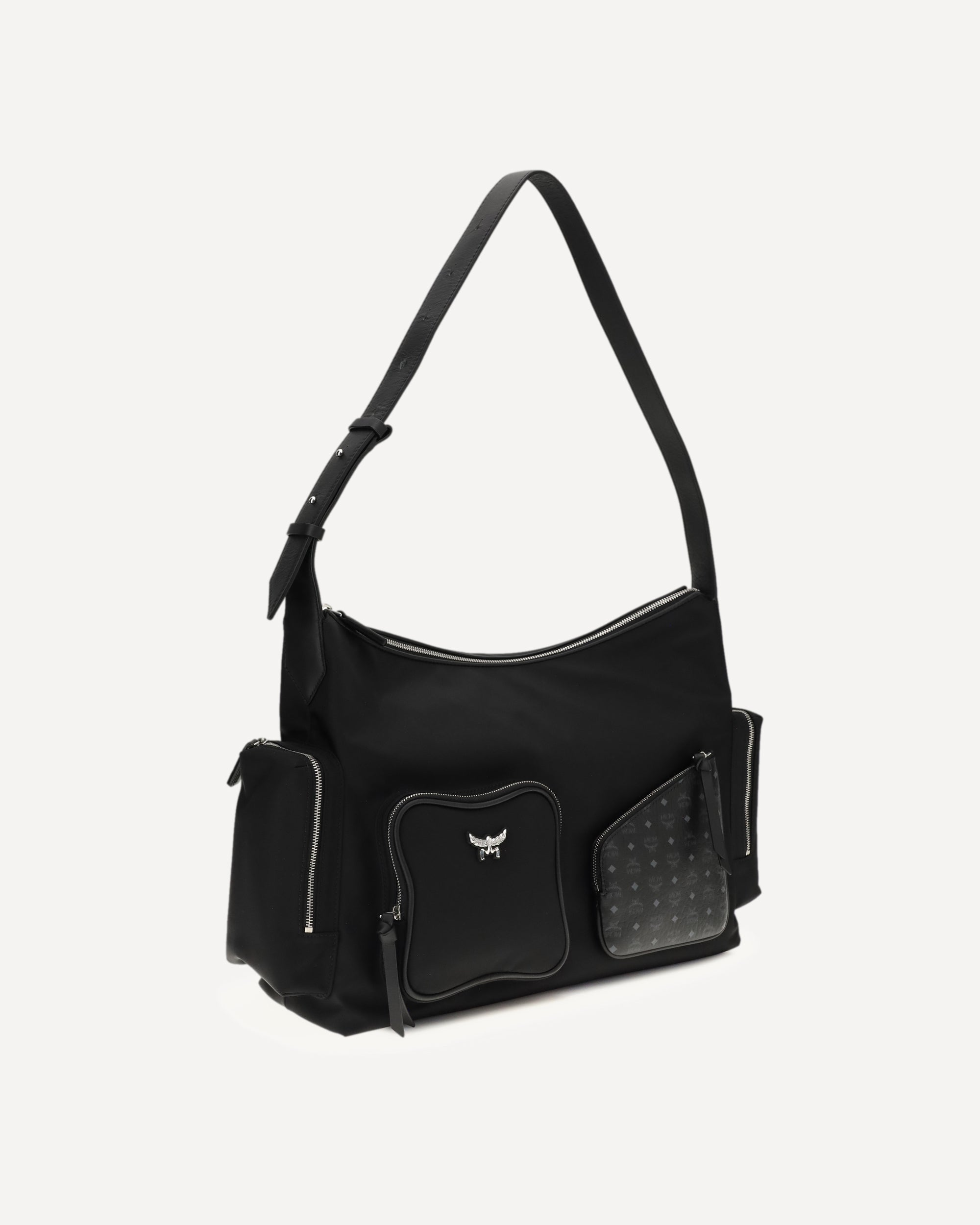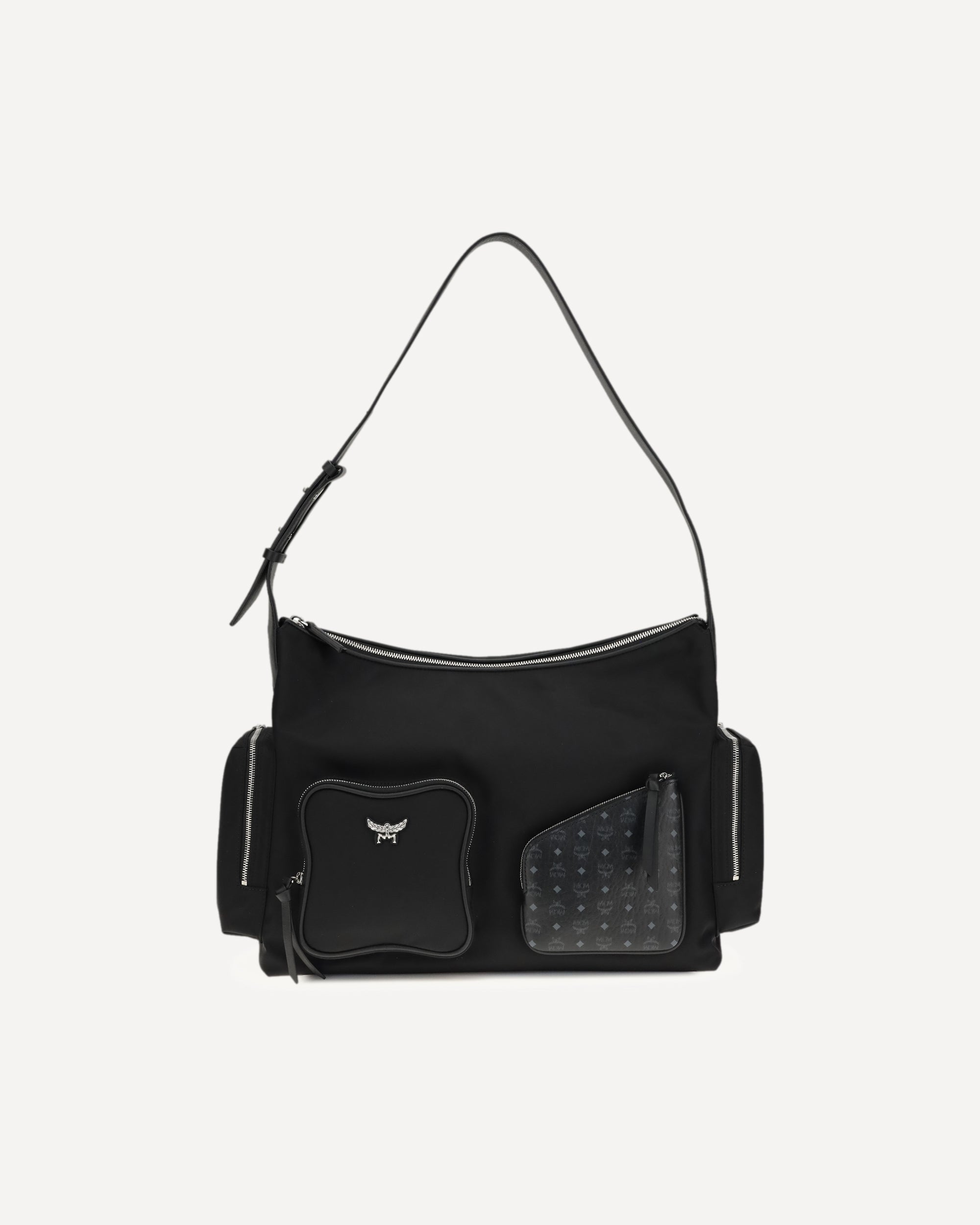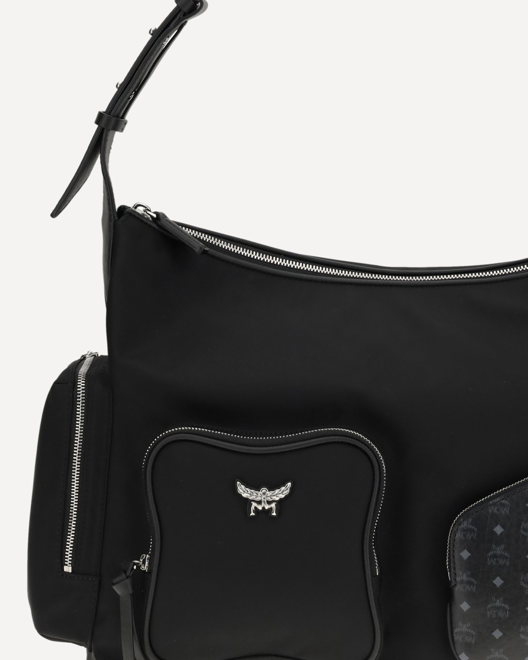 Aren medium Shoulder Bag by MCM is made of ECONYL nylon, a sustainable material, and features a leather pocket with the Visetos monogram and a pocket with the metallic "Laurel" logo on the front. It has an adjustable handle for versatile portability, a top zipper closure for added security and side pockets for extra convenience. A stylish and functional accessory perfect for everyday wear.