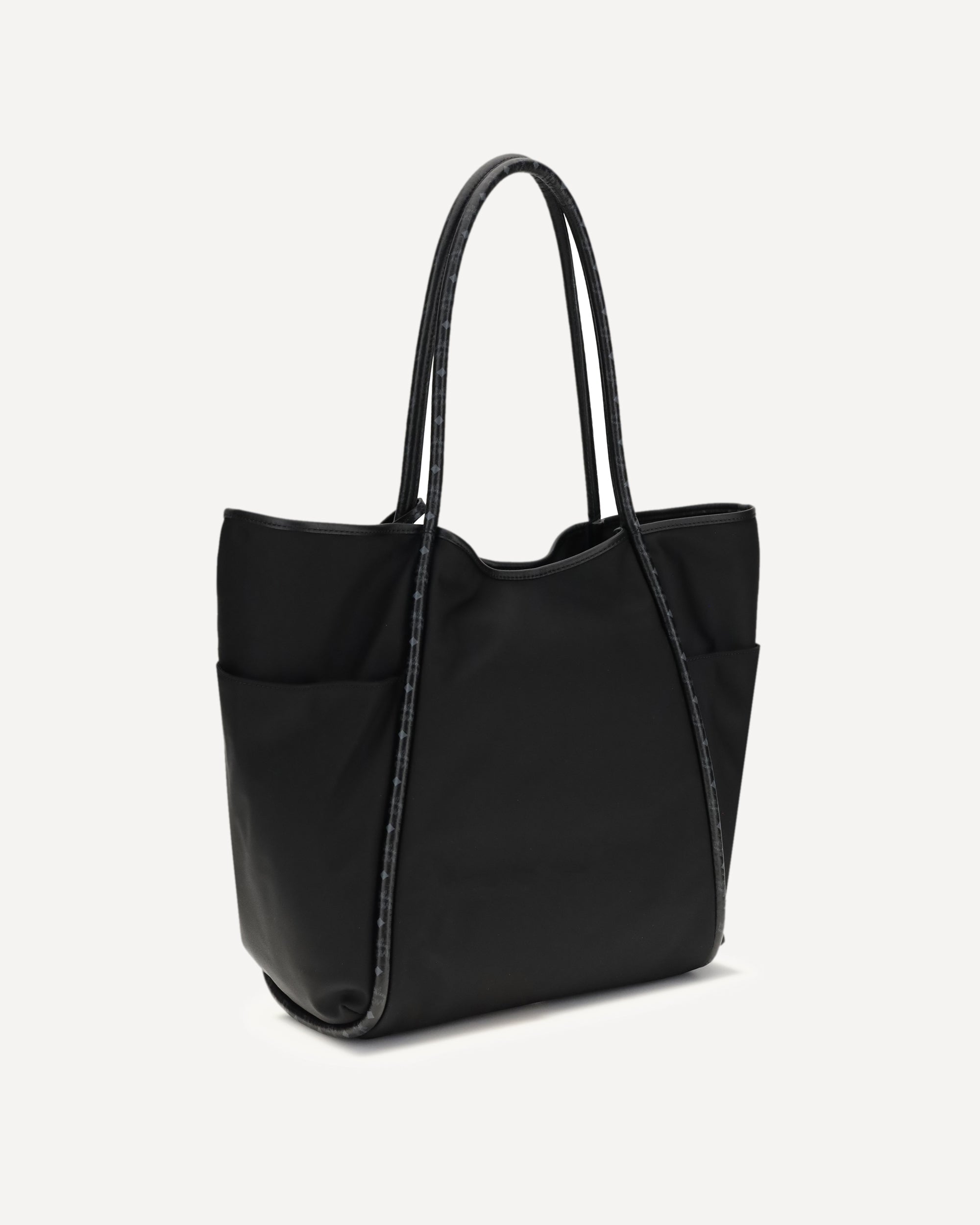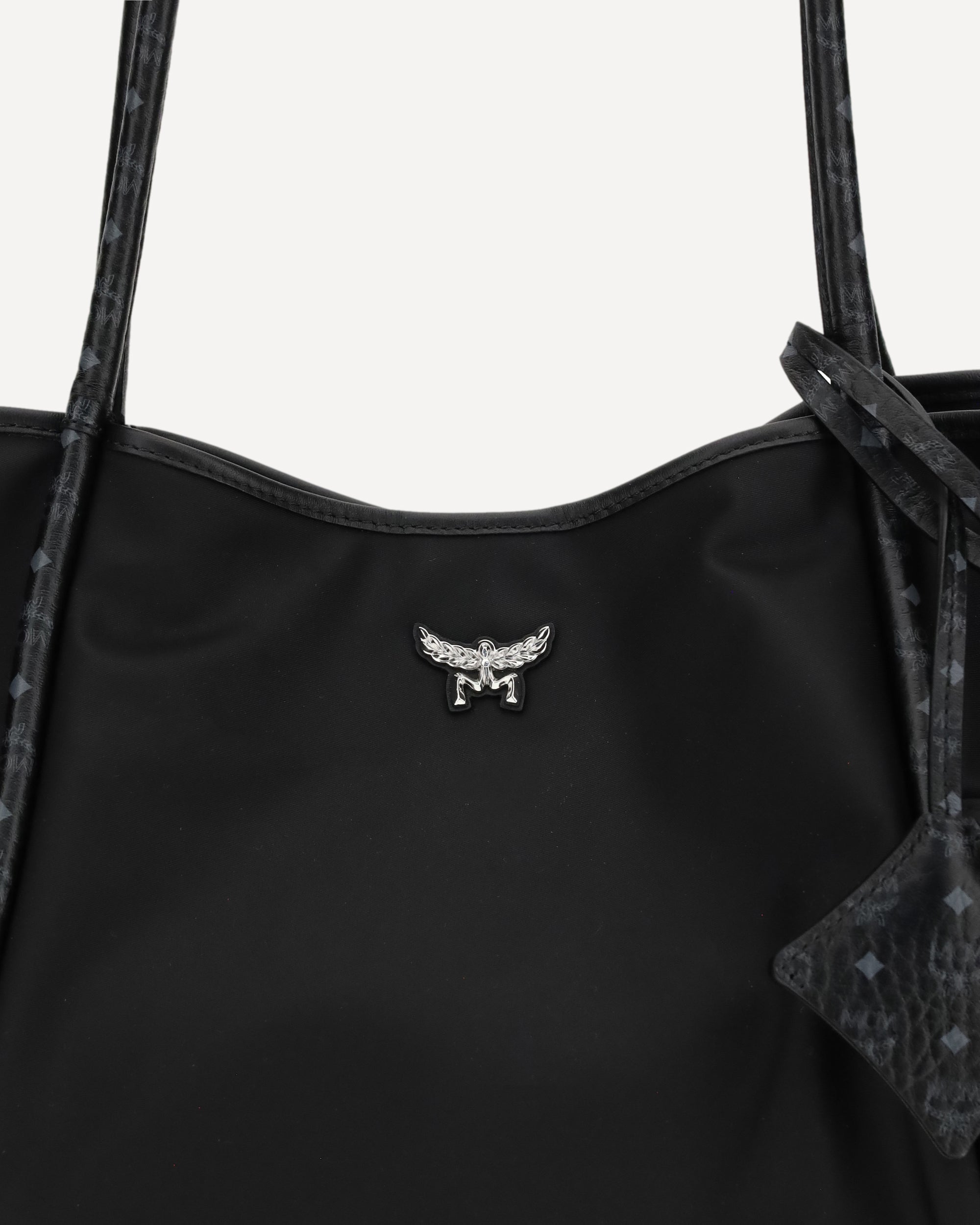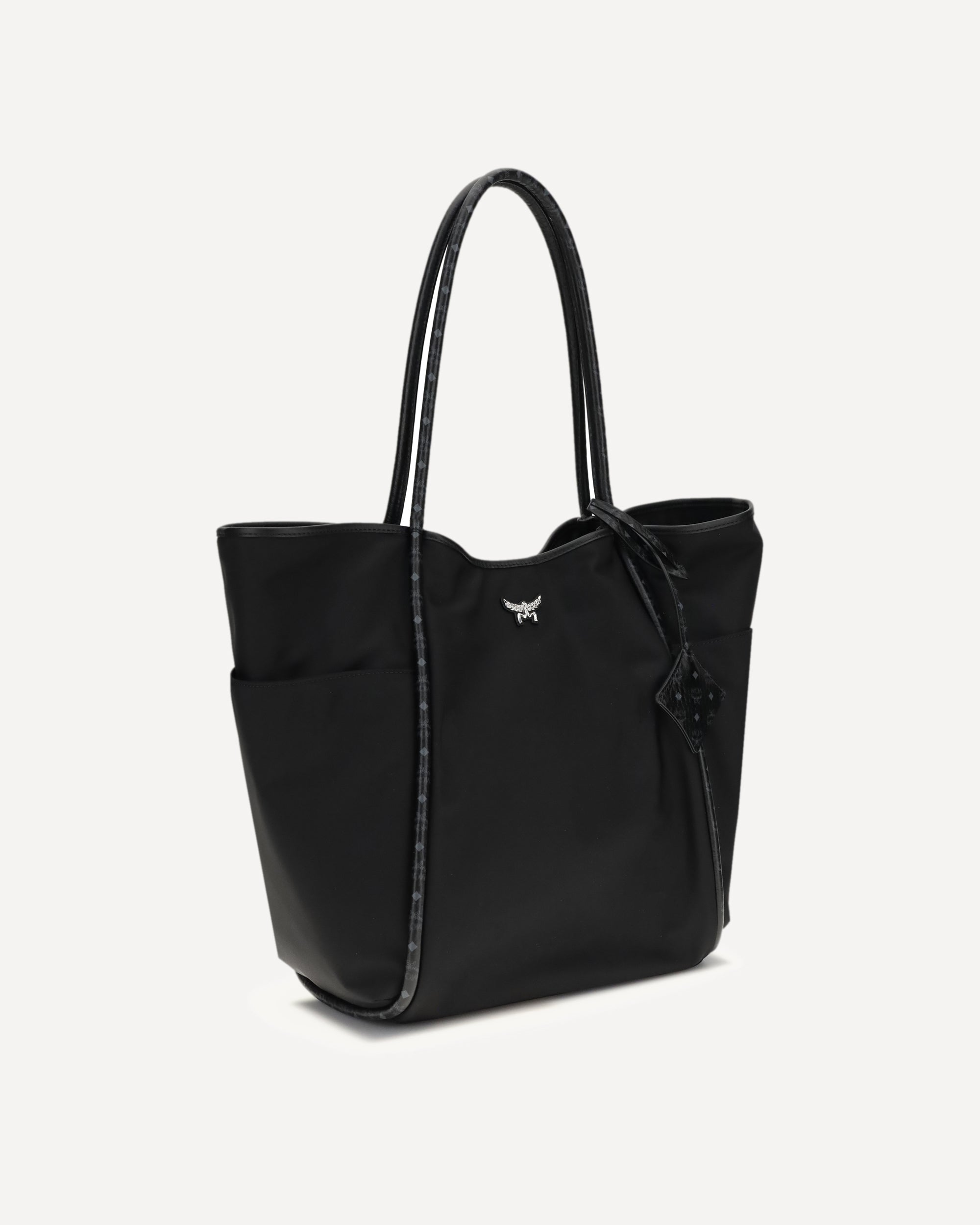Aren Tote Bag by MCM combines elegance and sustainability in a sophisticated design. The ECONYL® reclaimed nylon body reflects the brand's commitment to the environment, while leather top handles and a detachable diamond pendant with Visetos monogram print add a distinctive touch. The metal Laurel logo on the front enhances the identity, while exterior side pockets offer practicality. The magnetic tab closure, along with the zippered interior compartment with hook and loop, provides security and organization. Protective leather feet protect the bottom of the bag, making it both stylish and functional. A perfect accessory for those seeking style and practicality every day.