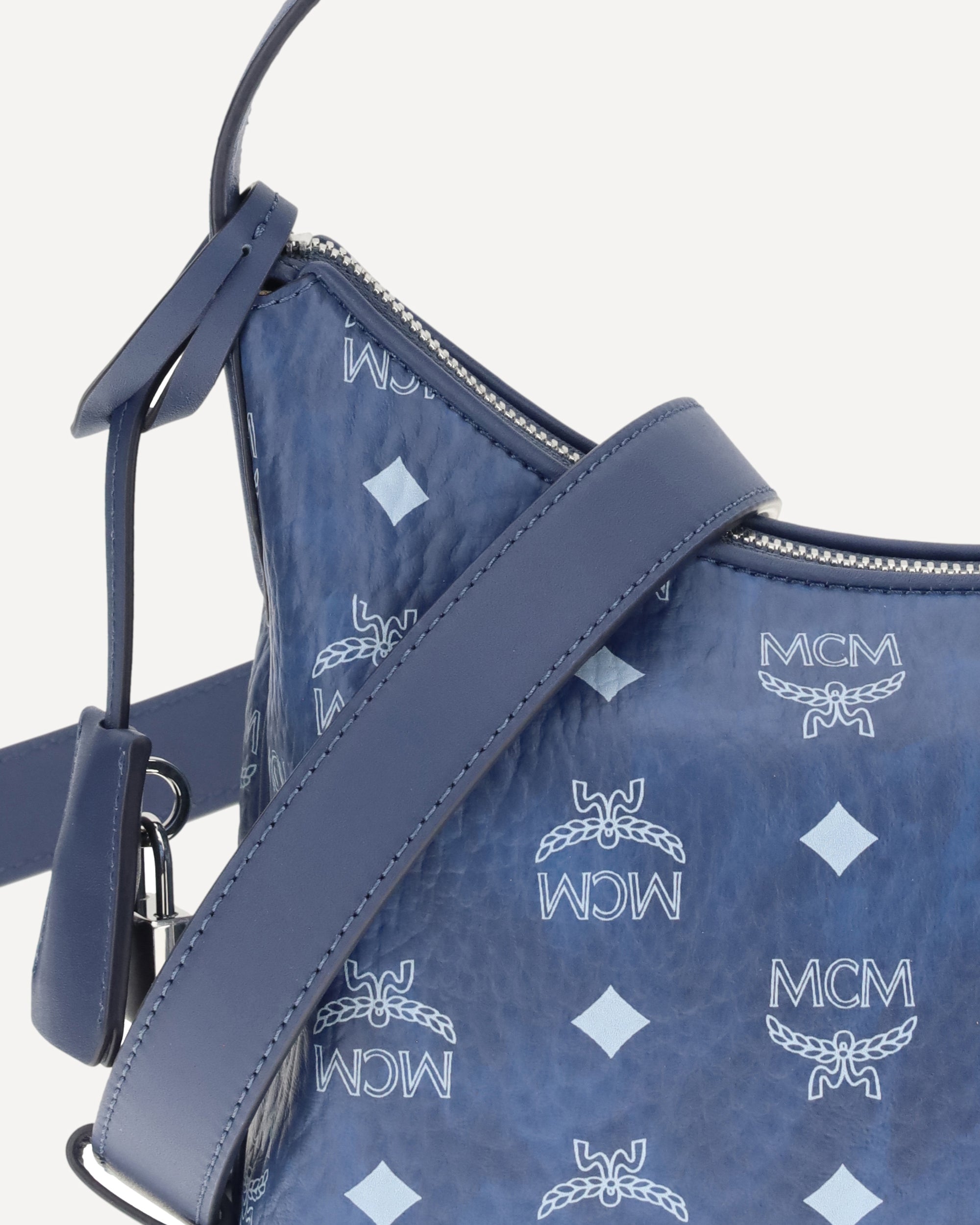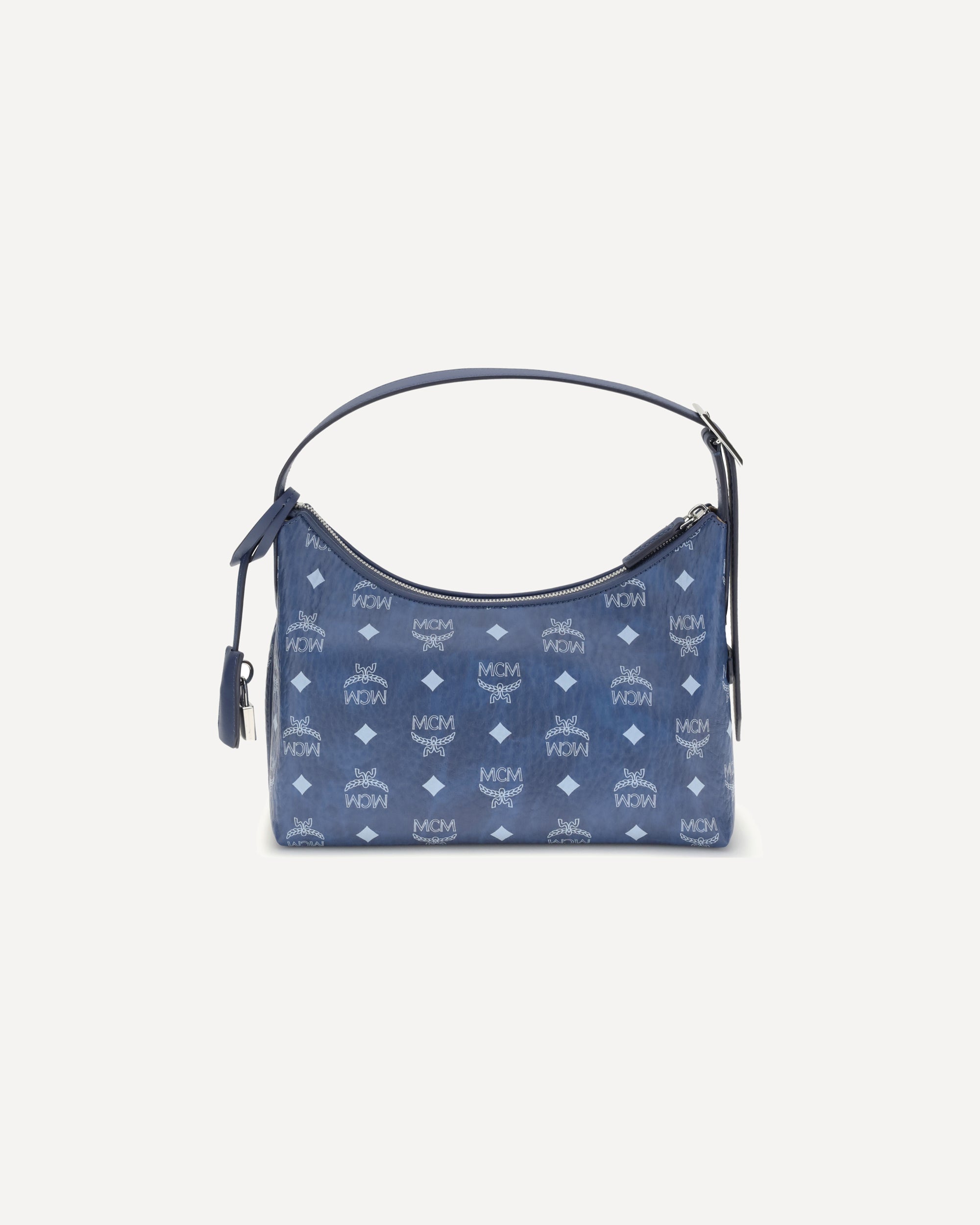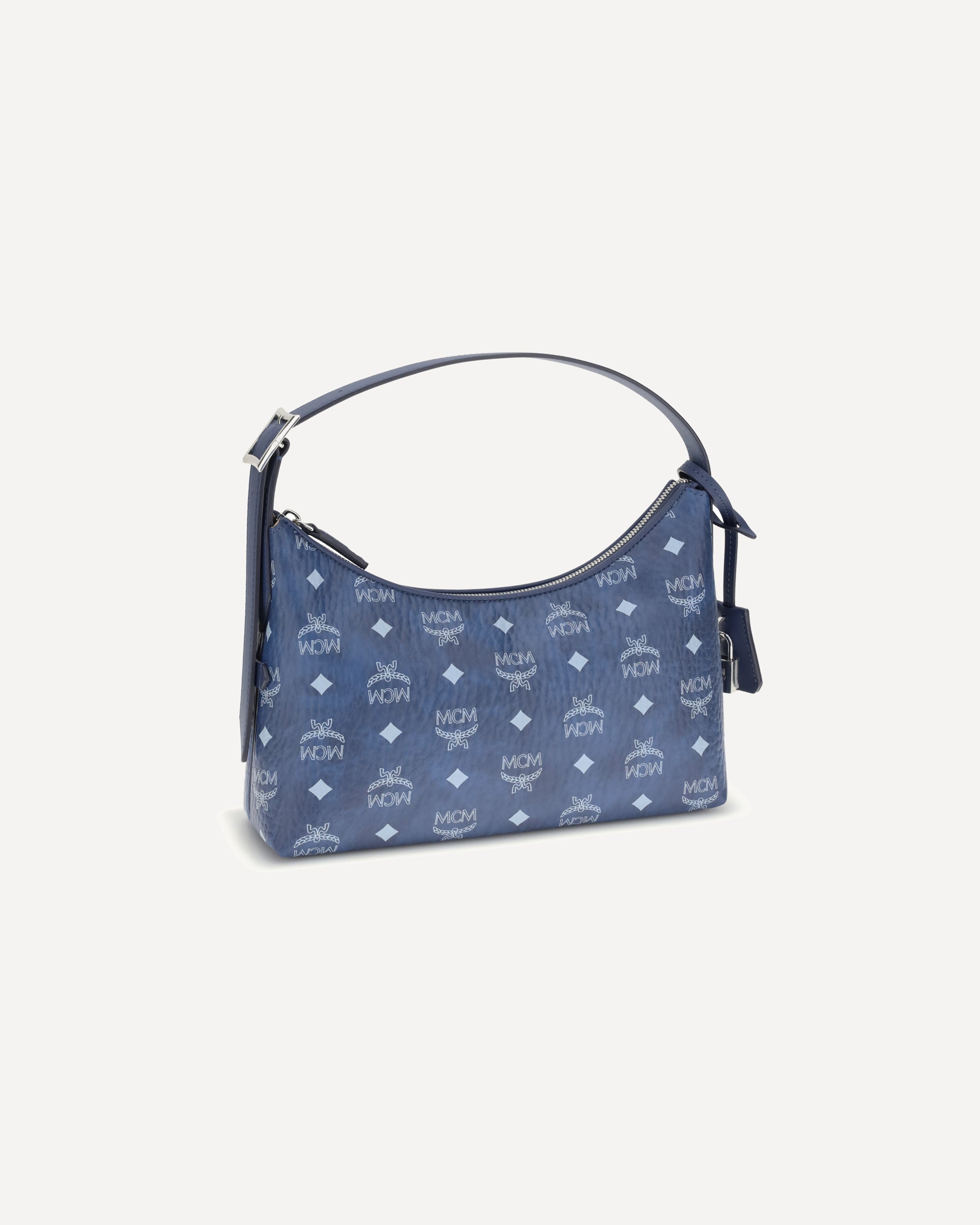 Aren Hobo Shoulder Bag by MCM, adjustable flat shoulder strap, zippered top closure, interior zippered welt pocket, single compartment, hammered weave, iconic brand monogram printed with all-over contrasting pressure print, padlock detail.