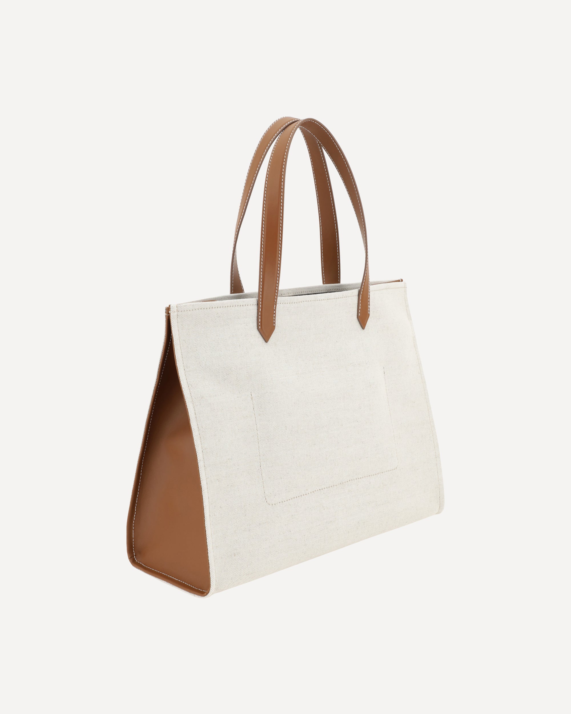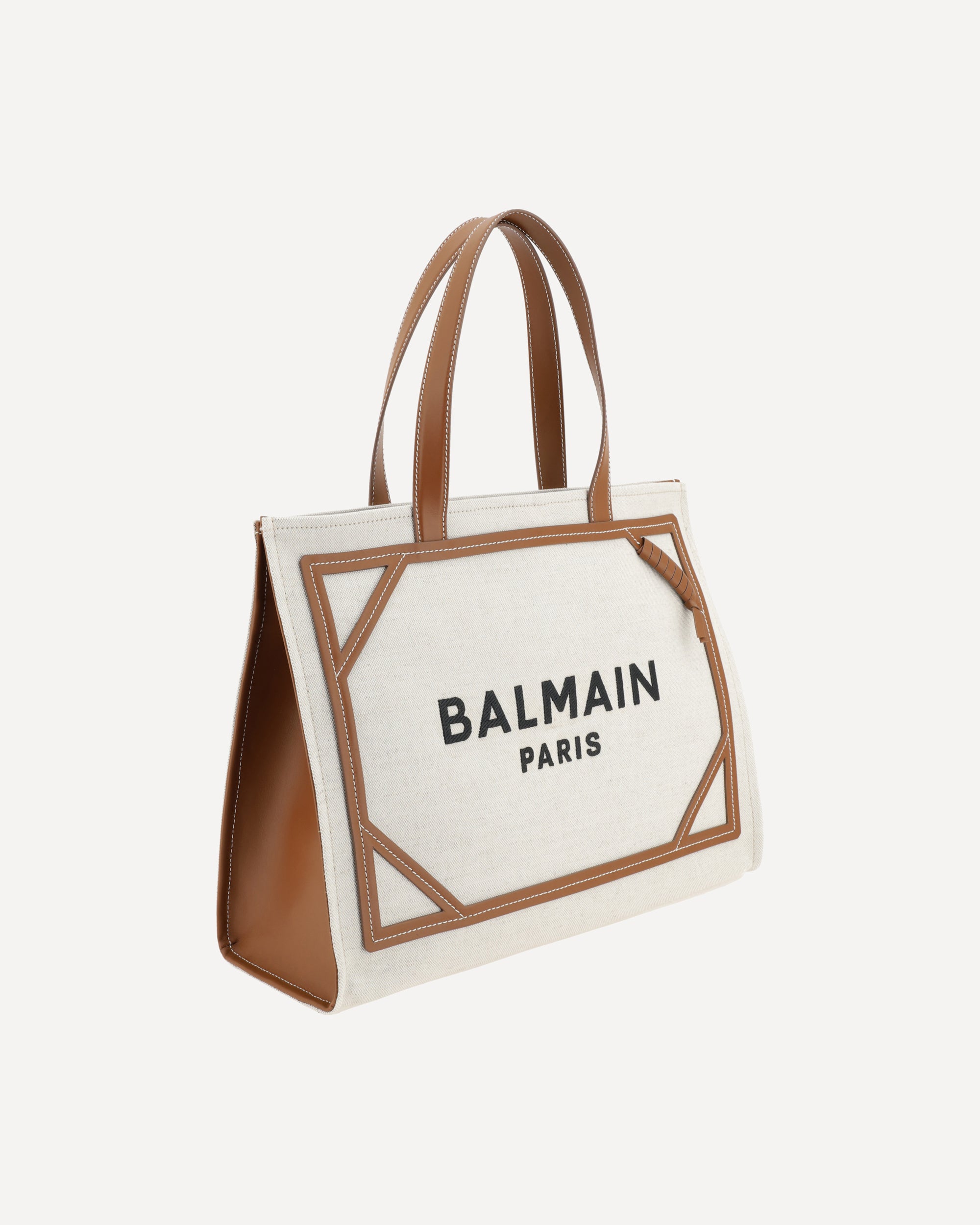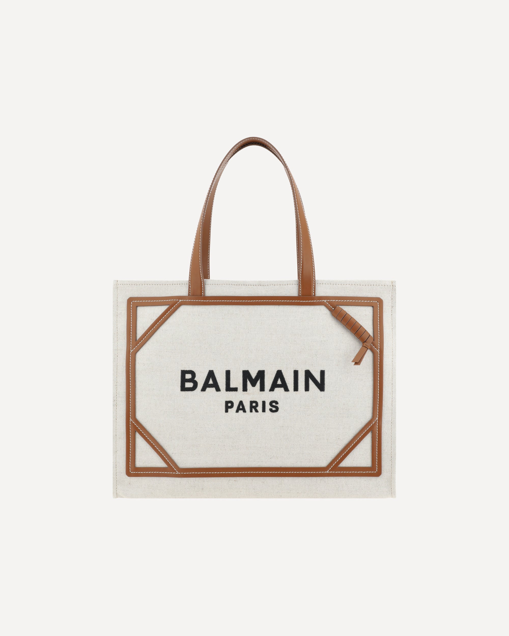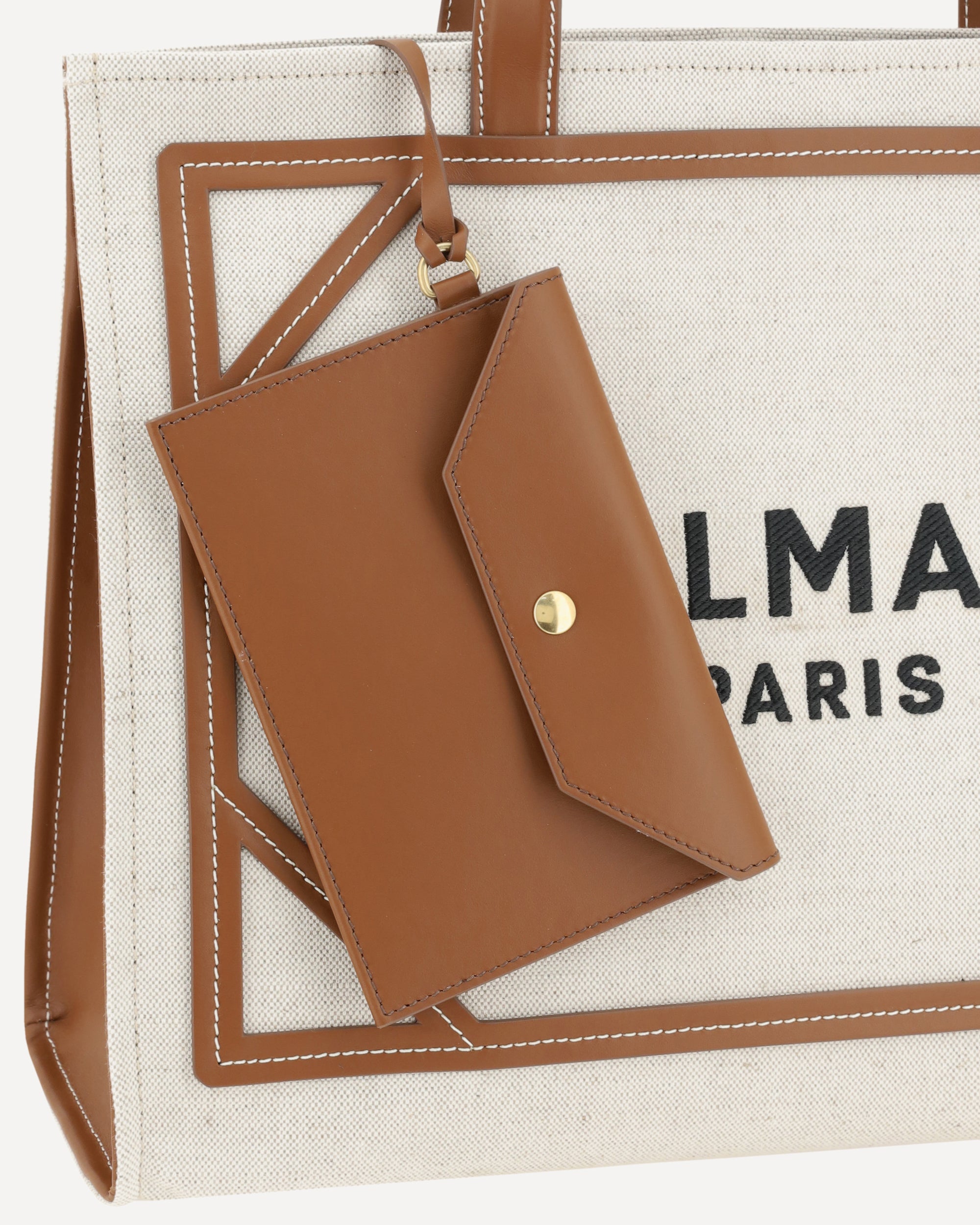 Cotton B-Army Medium Shoulder Bag by Balmain features flat top leather handles, contrasting embroidered iconic brand monogram at front, leather details, top hook closure, interior pouch, single interior compartment
