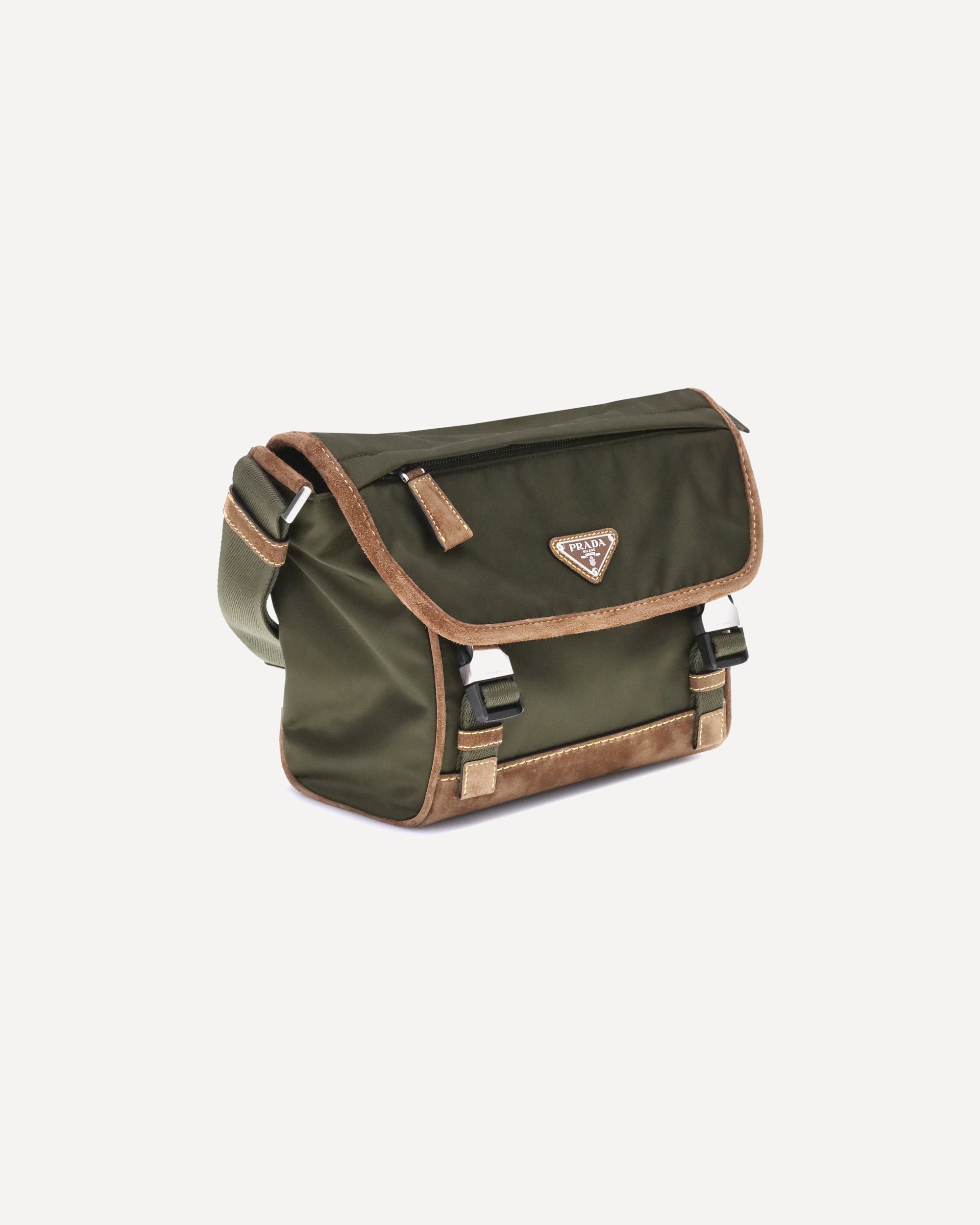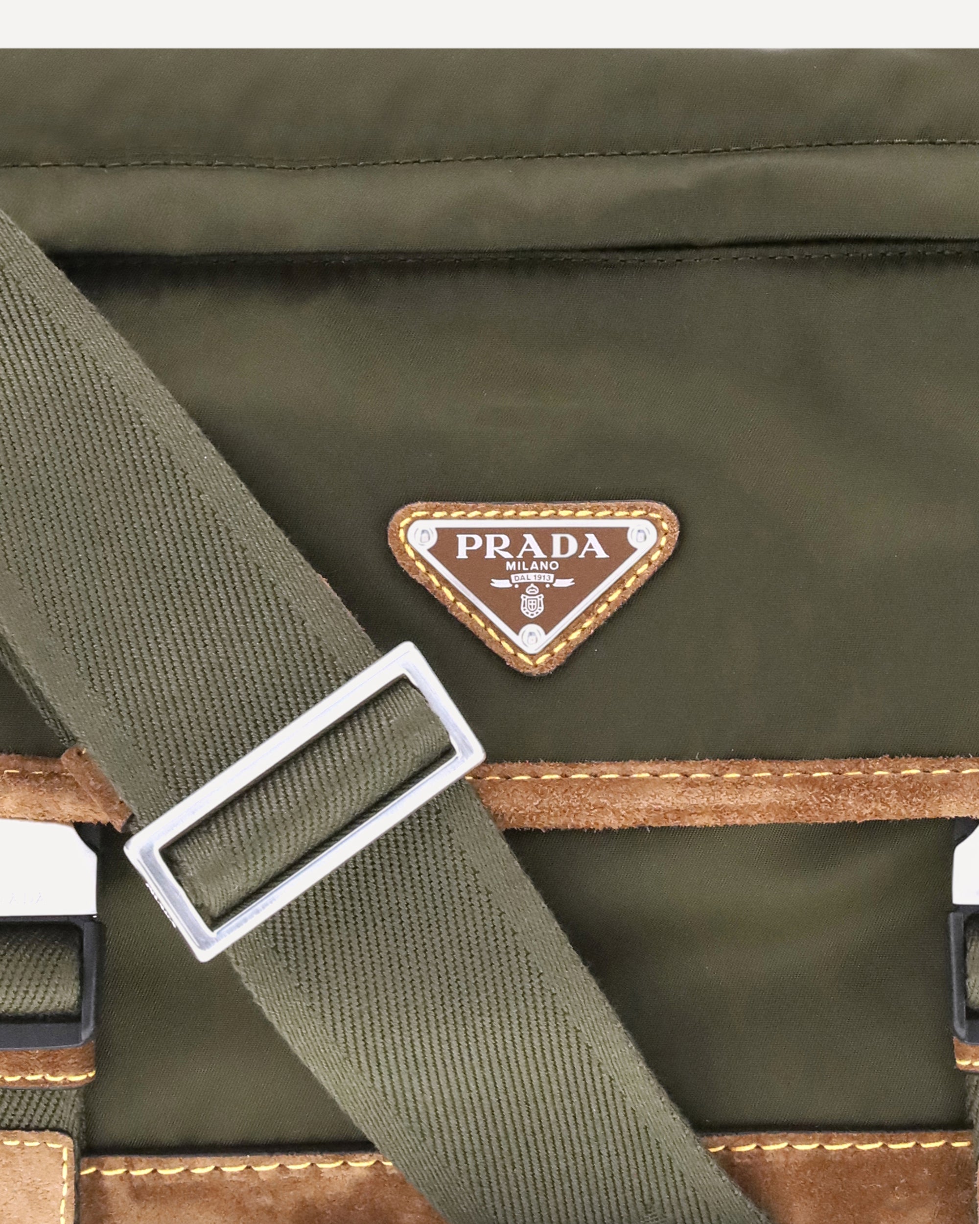 Prada's Medium Shoulder Bag, made of innovative Re-Nylon and suede leather, is a combination of style and functionality. The ribbon shoulder strap is adjustable, offering versatility in carrying it. The iconic enameled metal triangle logo stands out on the flap, which closes with a convenient snap system. It features an exterior zippered pocket, a zippered pocket on the back, and an interior zippered pocket, providing ample space and organization.