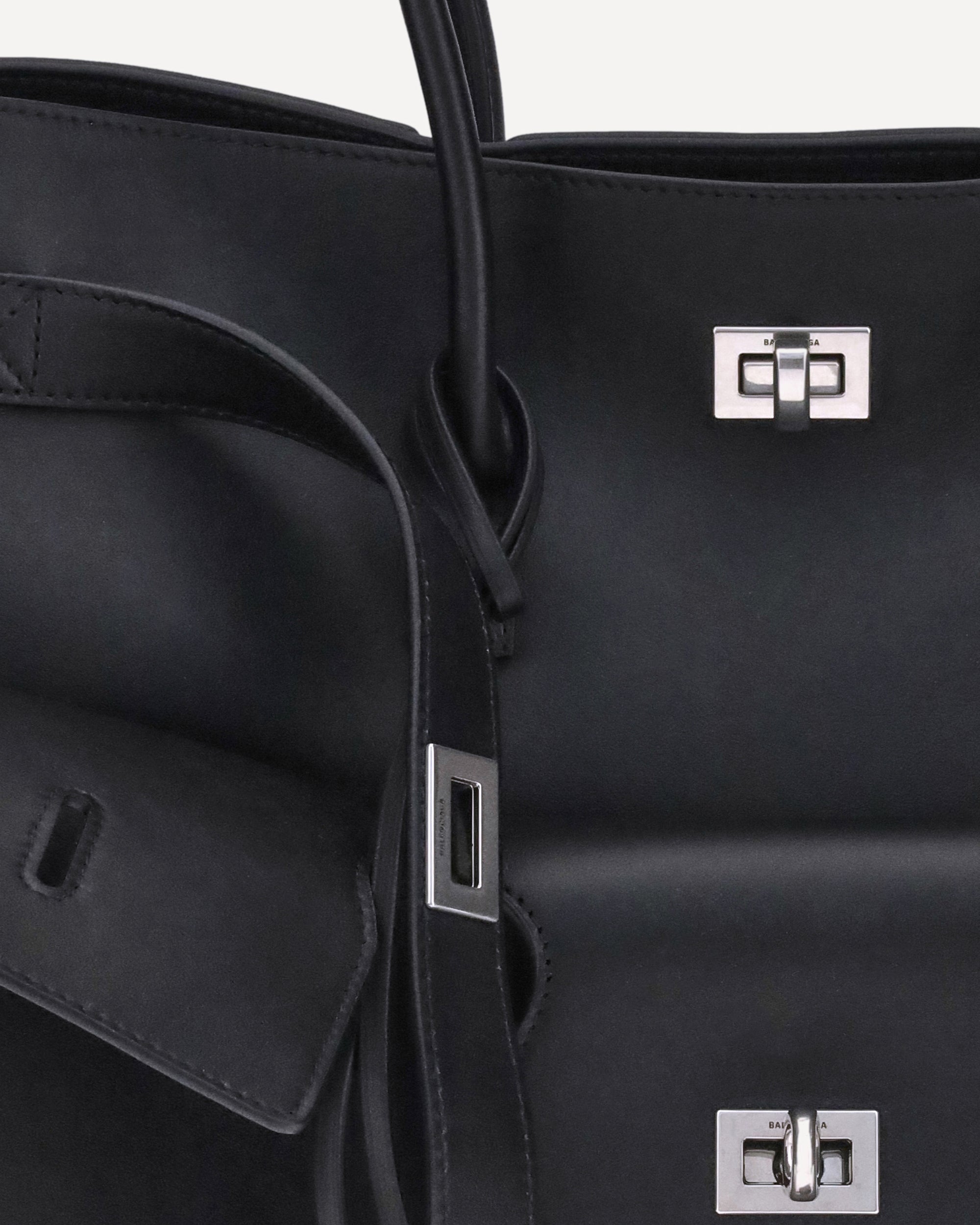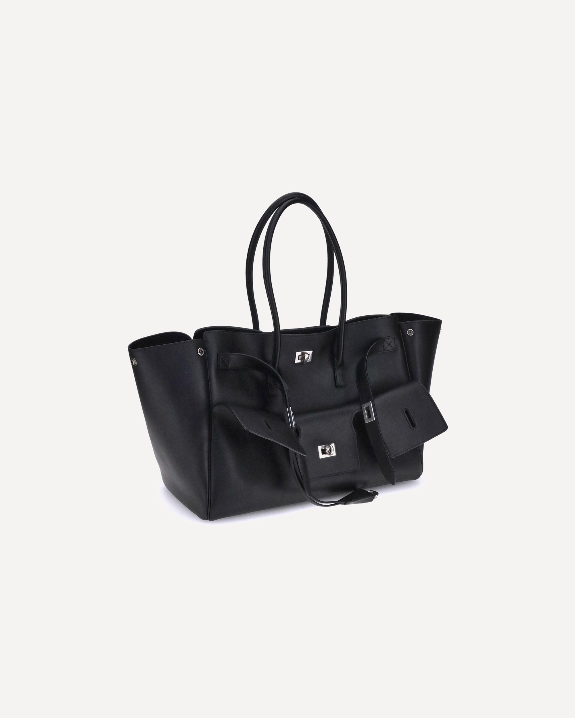 Balenciaga's Bel Air medium Shoulder Bag is a spacious and functional accessory with a versatile pouch design. It features two handles for convenient carrying and the Balenciaga Paris logo embossed with silver lamination on the back, attesting to its authenticity. Enhanced with silver hardware and a removable key ring with double spiral loop, this bag is designed for organization: it includes snap buttons on the sides to modulate the shape, a swivel closure, and belts on the front with engraved logo. The interior features a large front pocket, an open main compartment, two interior zippered pockets and two interior flat pockets, offering practical solutions for every need.