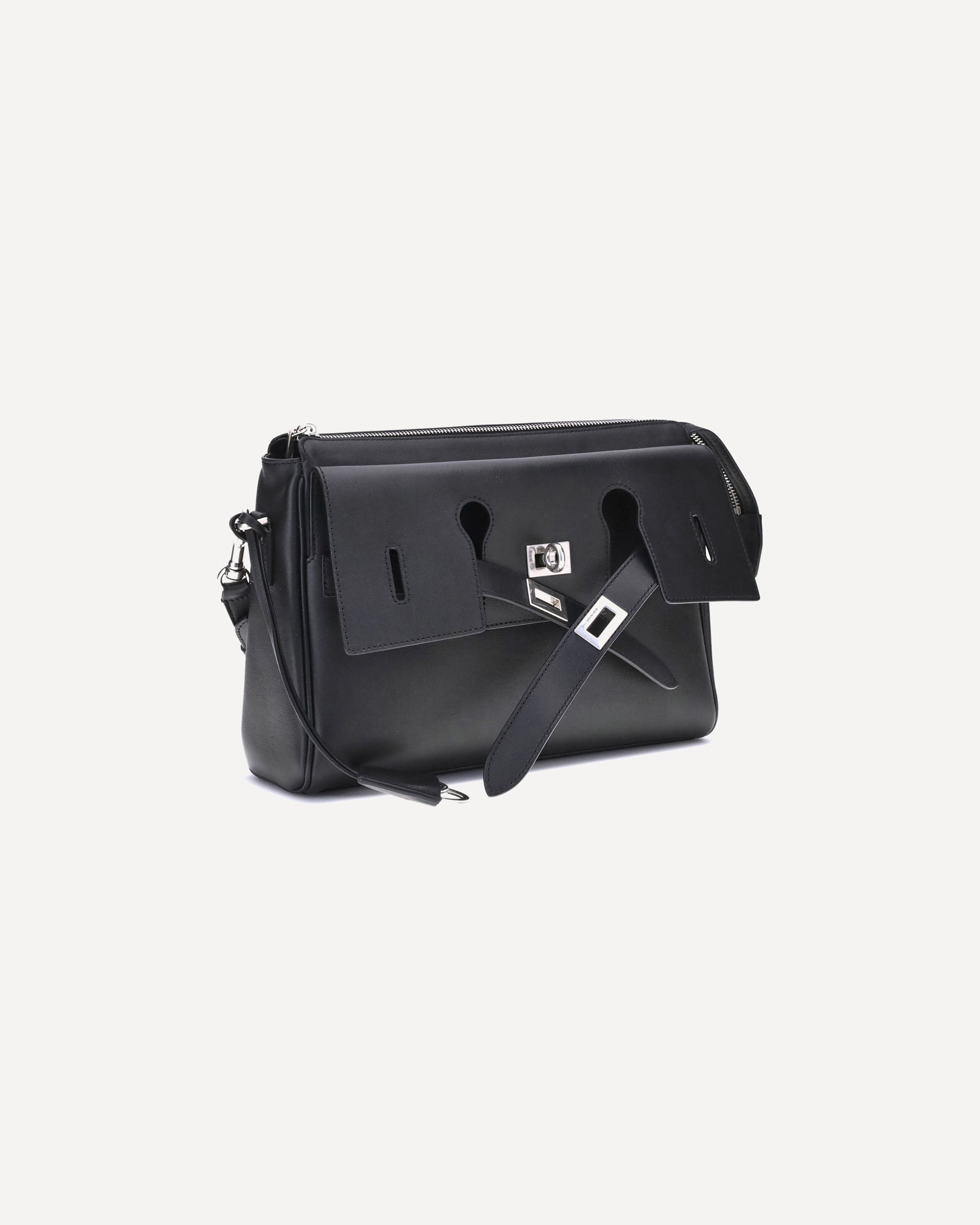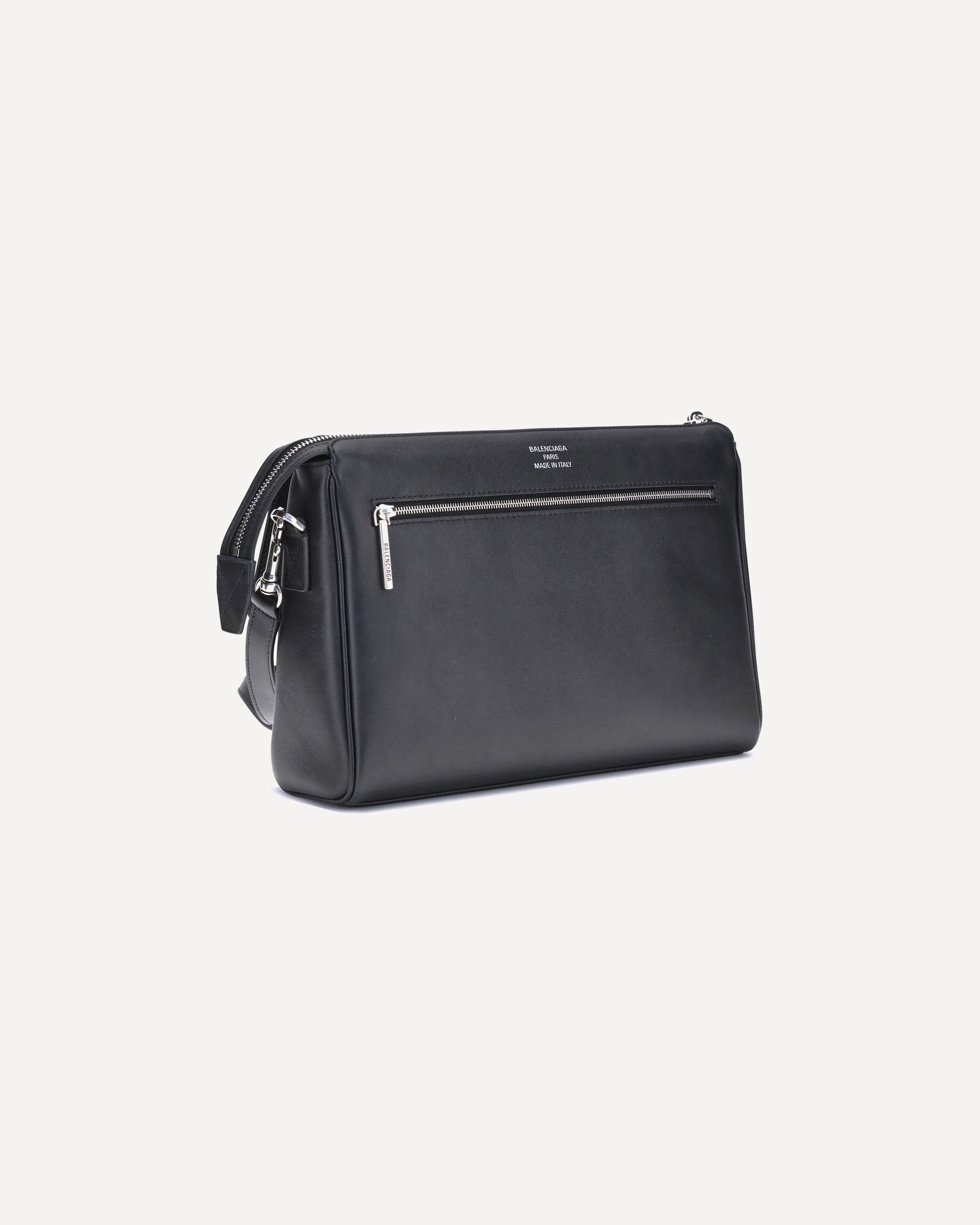 Balenciaga's Bel Air small Shoulder Bag combines functionality and contemporary style in a compact and versatile design, perfect for carrying on the shoulder or cross-body. Crafted with thoughtful details, it features a foil-embossed Balenciaga Paris logo on the back and a removable double-ring spiral key ring. Antique silver hardware adds a vintage touch, while the structure includes a front flat pocket, a back zip pocket, a main zip compartment and an interior flat pocket. The engraved logo on the closure system completes the iconic aesthetic of the model.