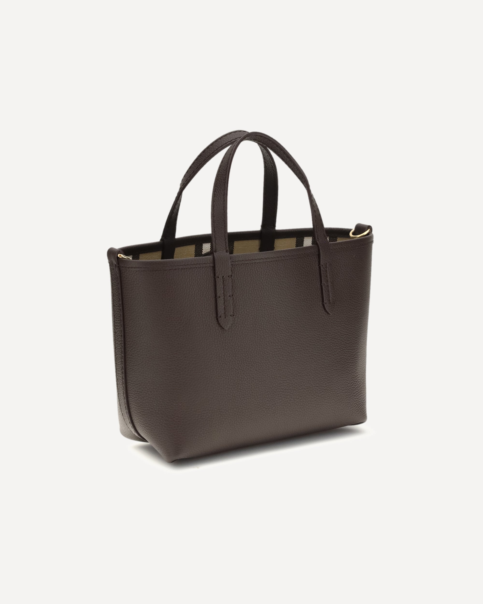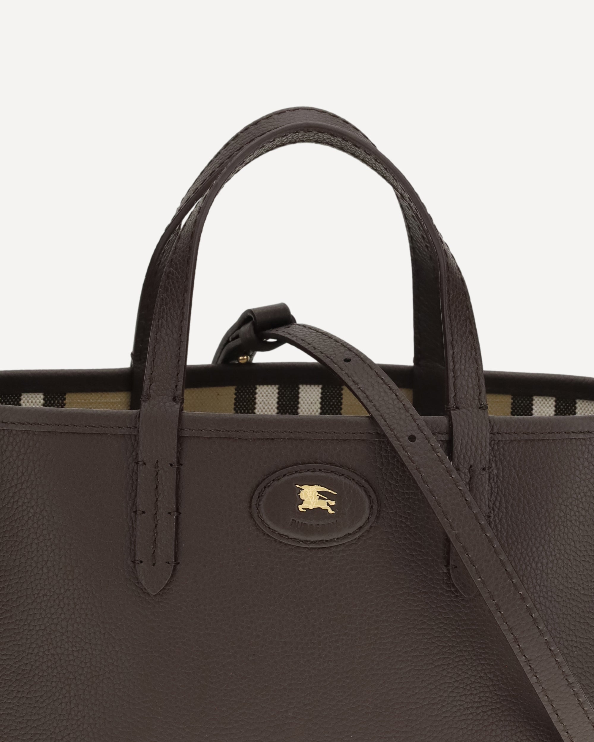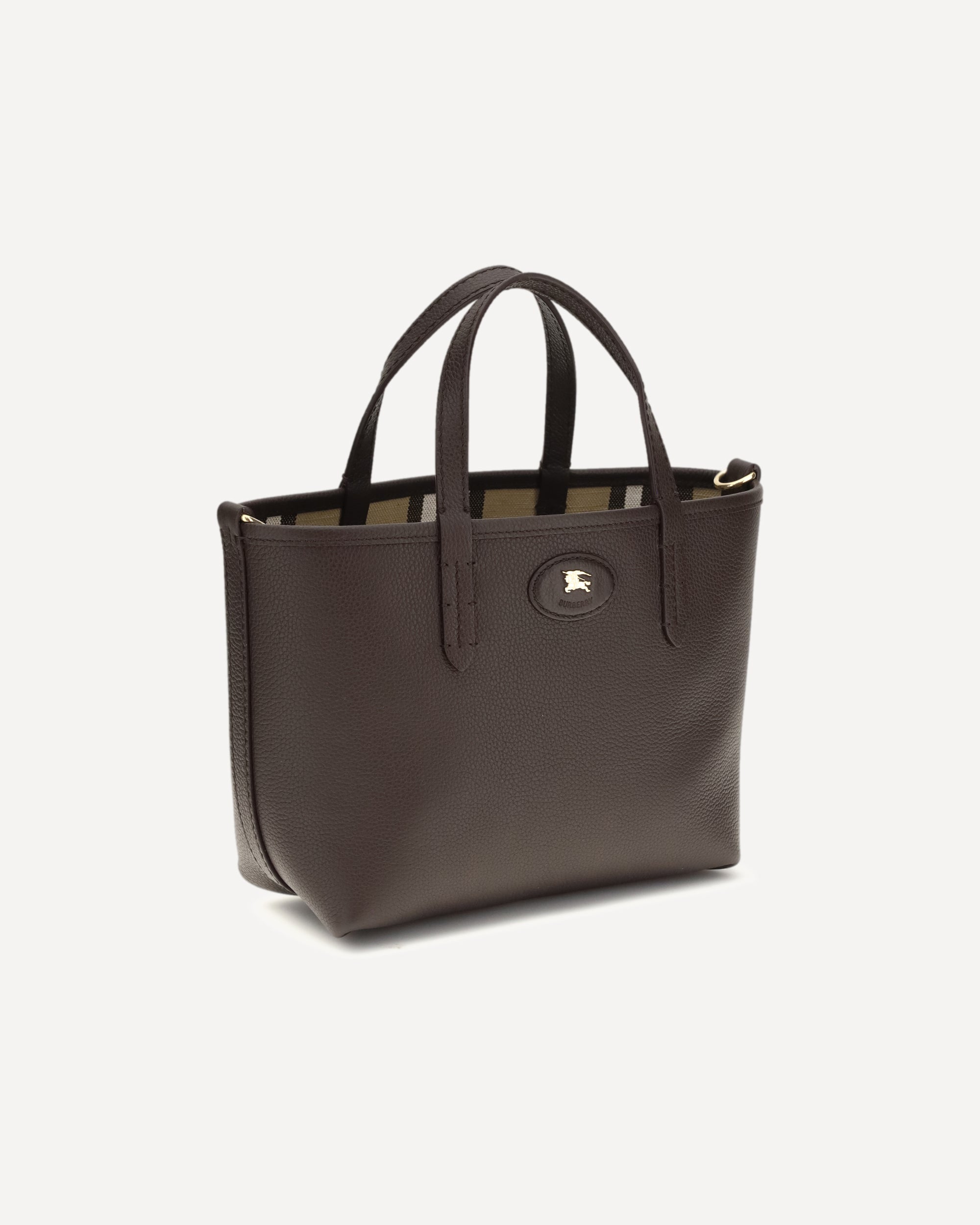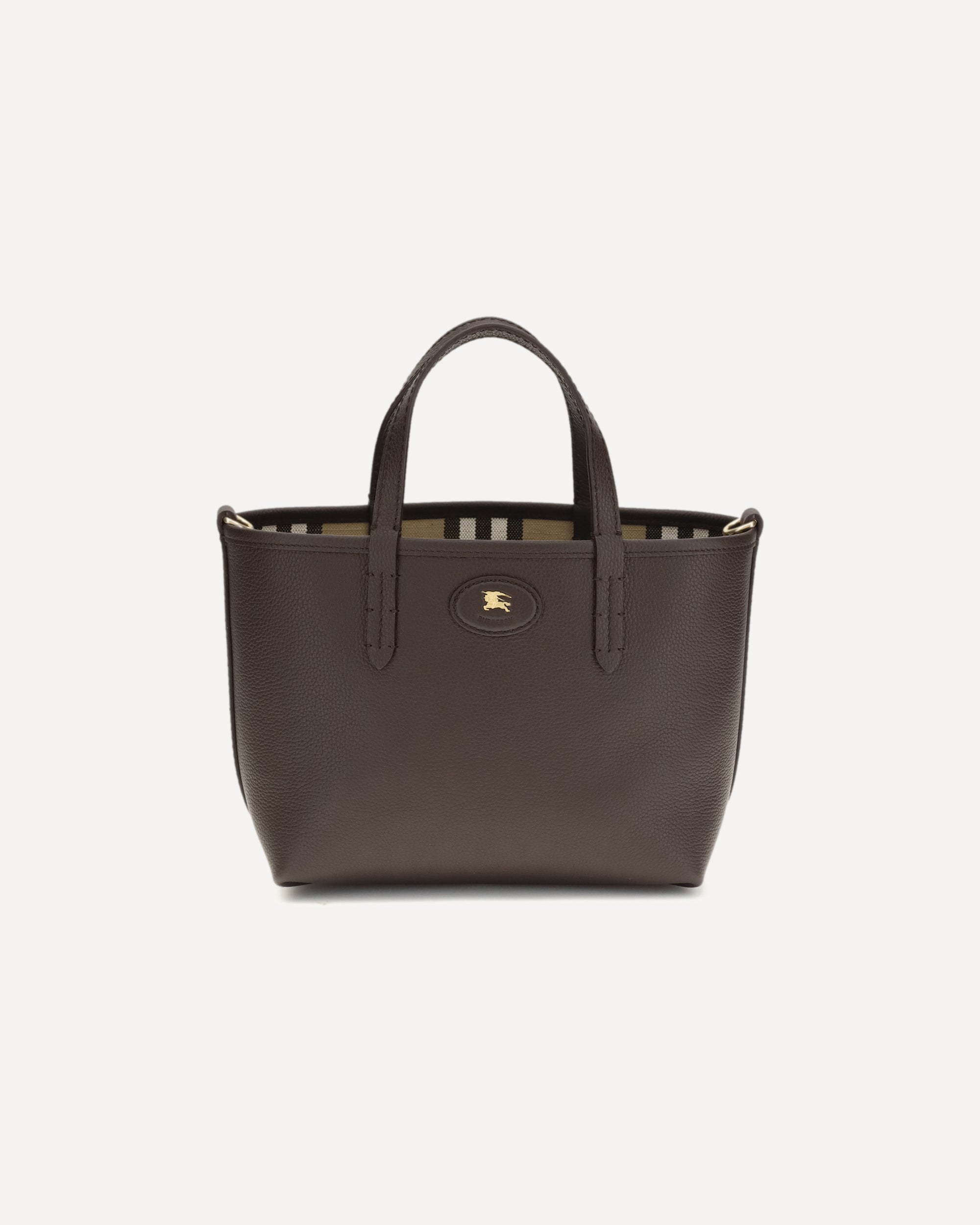 The Bloomsbury Mini Reversible Tote Bag by Burberry stands out for its versatile and refined design. Featuring top handles and an adjustable, detachable shoulder strap, it offers multiple carry options. The hand-painted edges and brushed metal detail enhance the craftsmanship, while the leather label with Equestrian Knight Design on the front adds an iconic and recognizable touch.