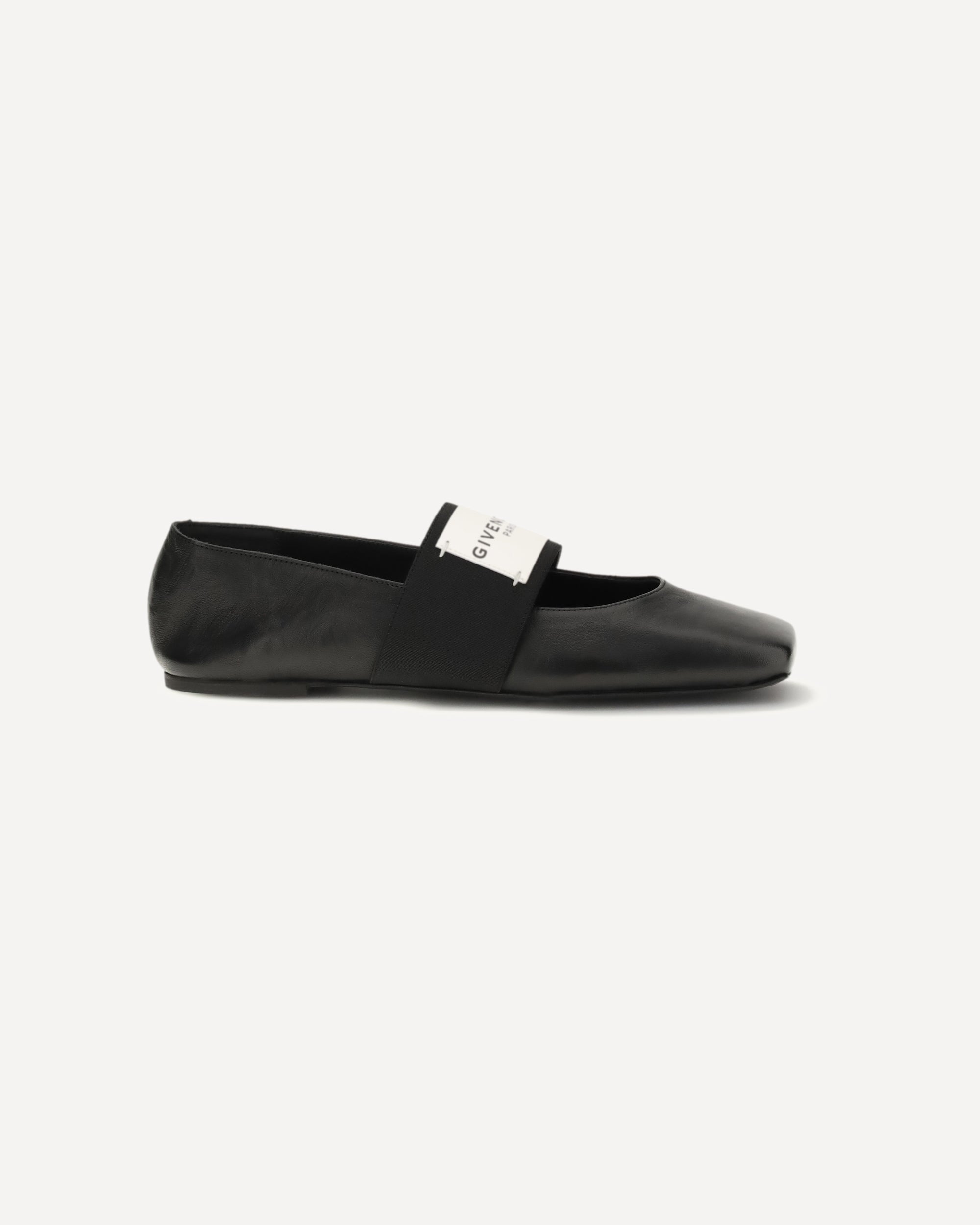 The Sliced Square Ballerinas by Givenchy are crafted from textured lambskin leather and feature the Sliced Square line's sleek, modern design. The elastic band with leather label ensures a secure fit, while the signature stamped leather insole ensures comfort. The square toe and soft construction make for a comfortable fit, complemented by the water-repellent and washable label.