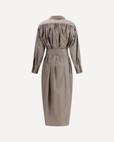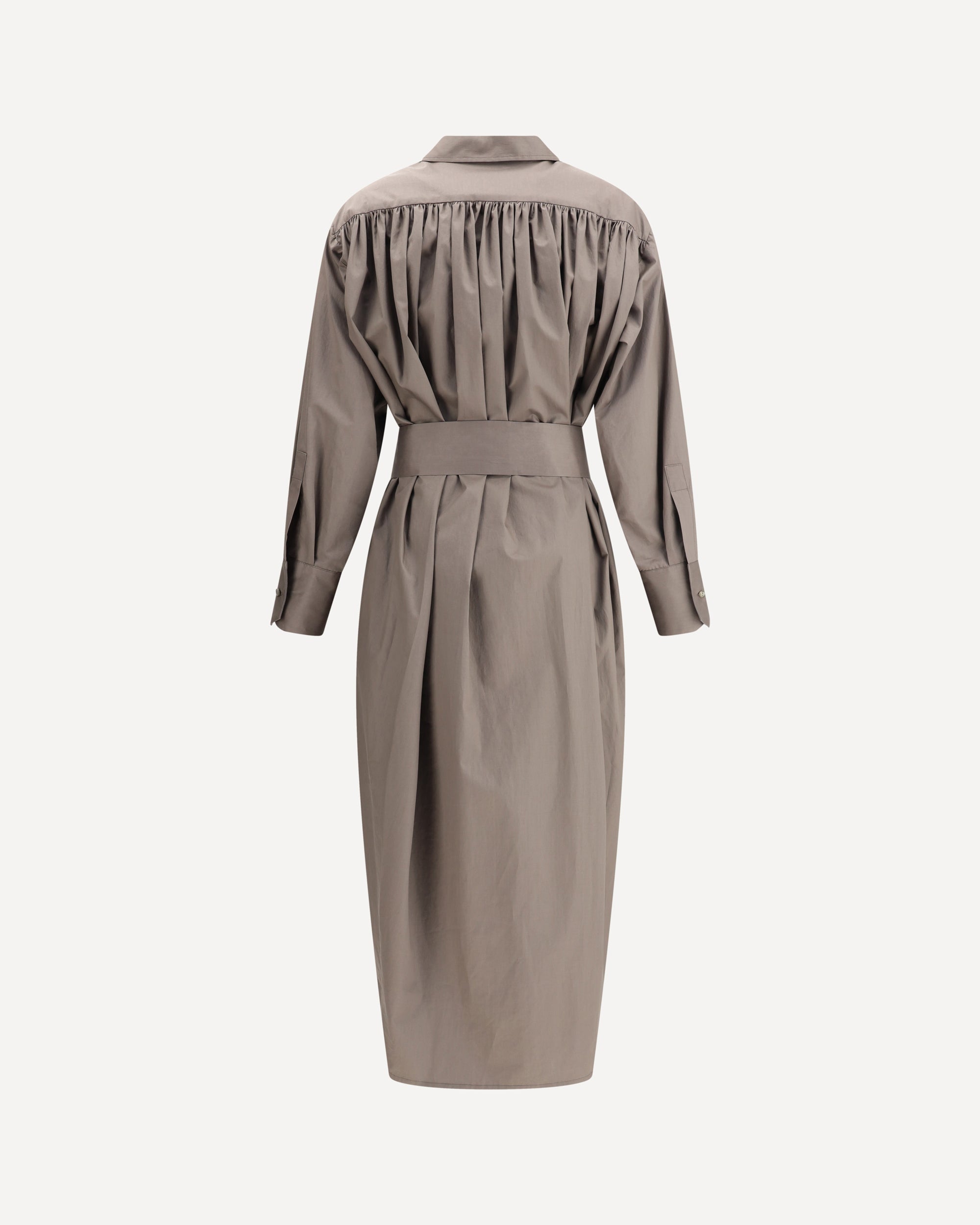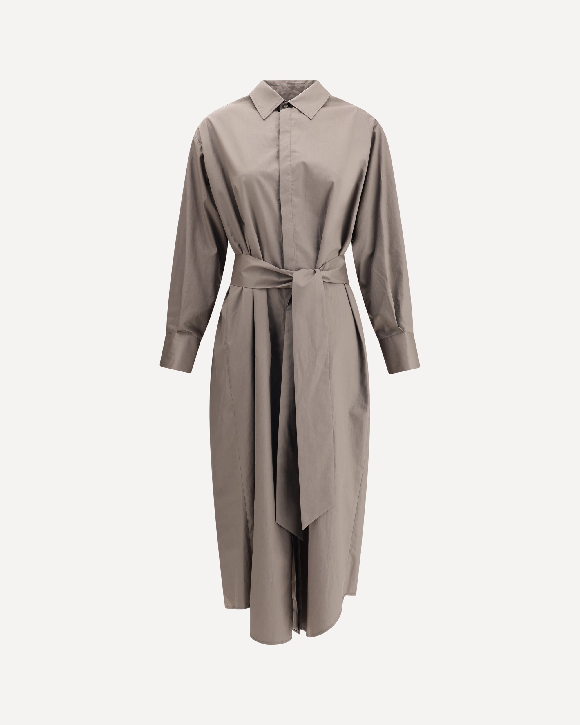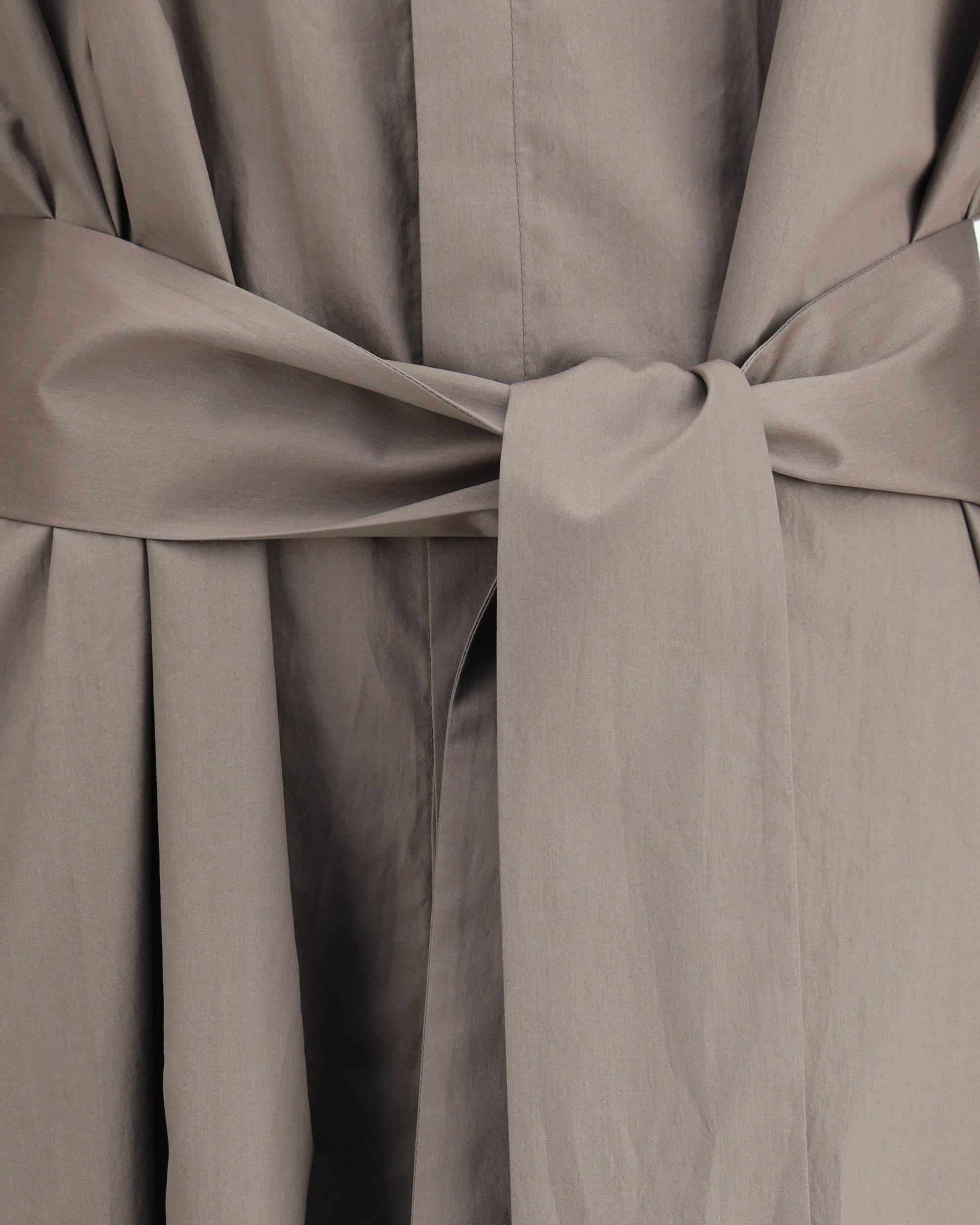The Balloon Dress by Sa Su Phi fine breathable cotton is distinguished by its elegant volume that drapes fluidly over the body, balancing structure and lightness. Gathered details at the back create a sculptural effect, adding depth to a minimalist and sophisticated design. The pointed collar and high cuffs lend a modern touch, while the two side welt pockets offer practicality. Slits on the side panels allow the matching belt to be looped through the front for a defined, feminine silhouette.