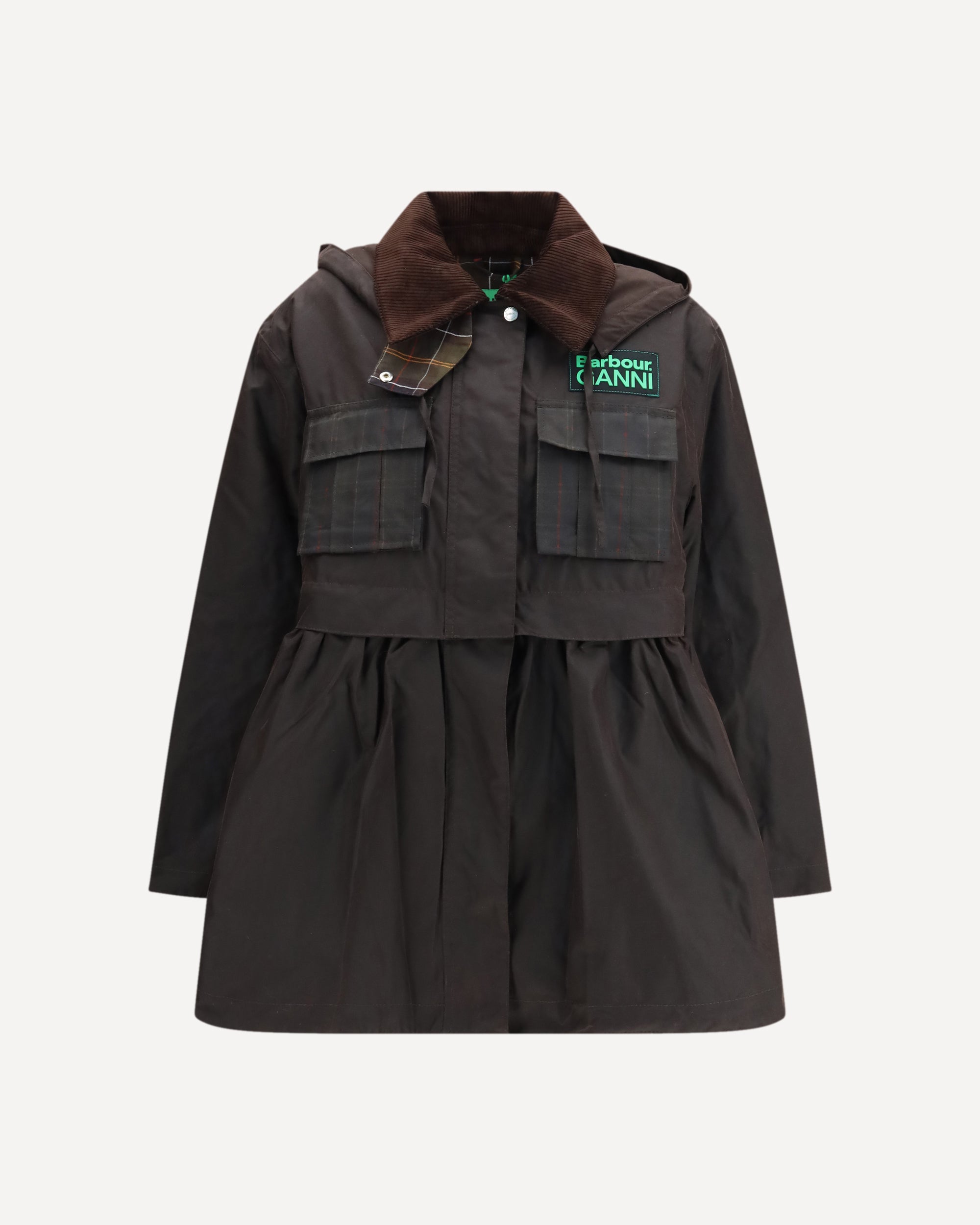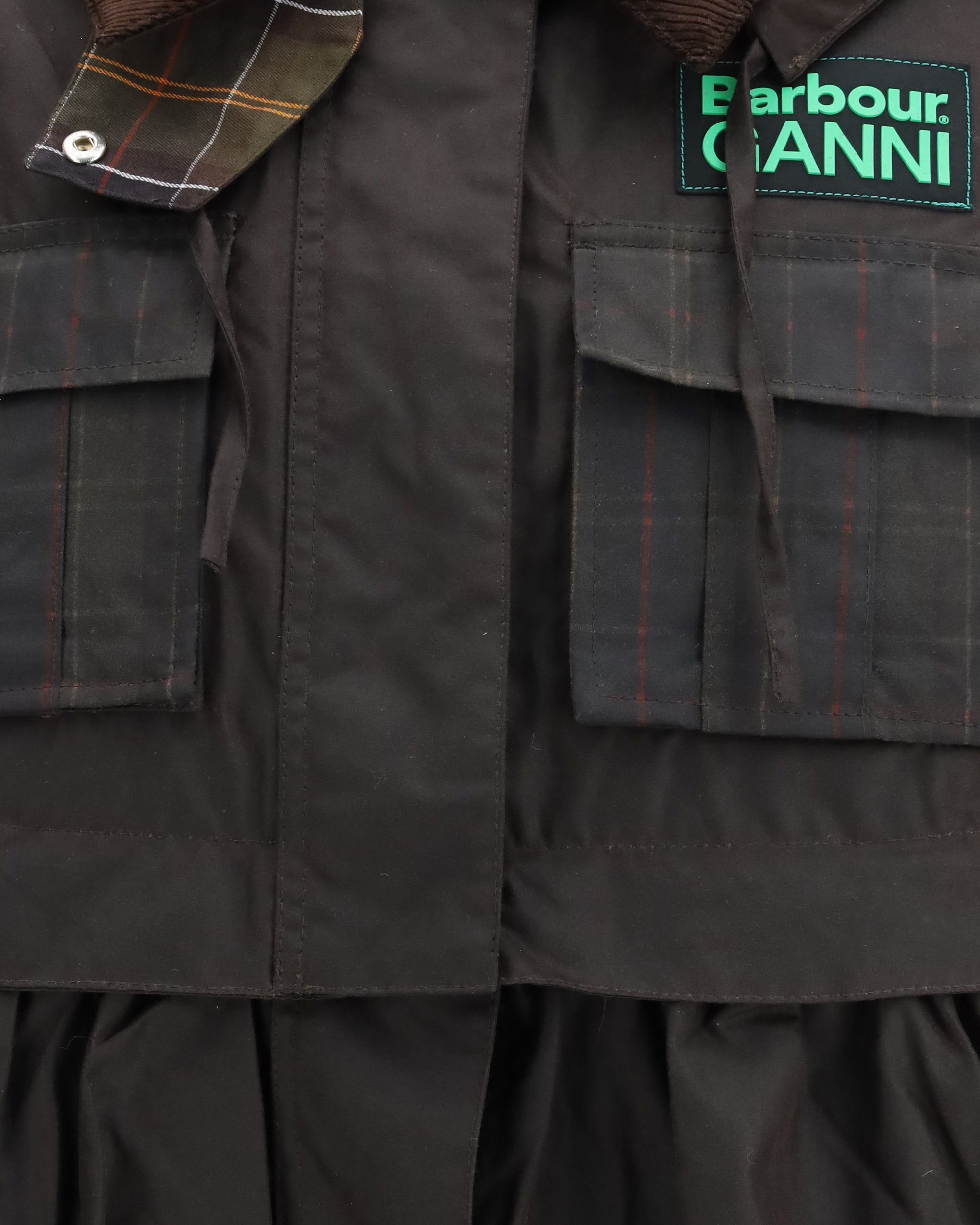 The waxed peplum Jacket by Barbour x GANNI blends British heritage with Scandinavian playfulness in a versatile, transformable design. The elongated silhouette features a detachable peplum skirt that zips off to reveal a shorter cropped shape, offering two looks in one. Barbour’s iconic waxed finish and tartan lining meet GANNI’s bold identity, highlighted by the dual-logo patch at the chest. A modern yet vintage-tinged piece, perfect for refreshing seasonal wardrobes with character and effortless style.