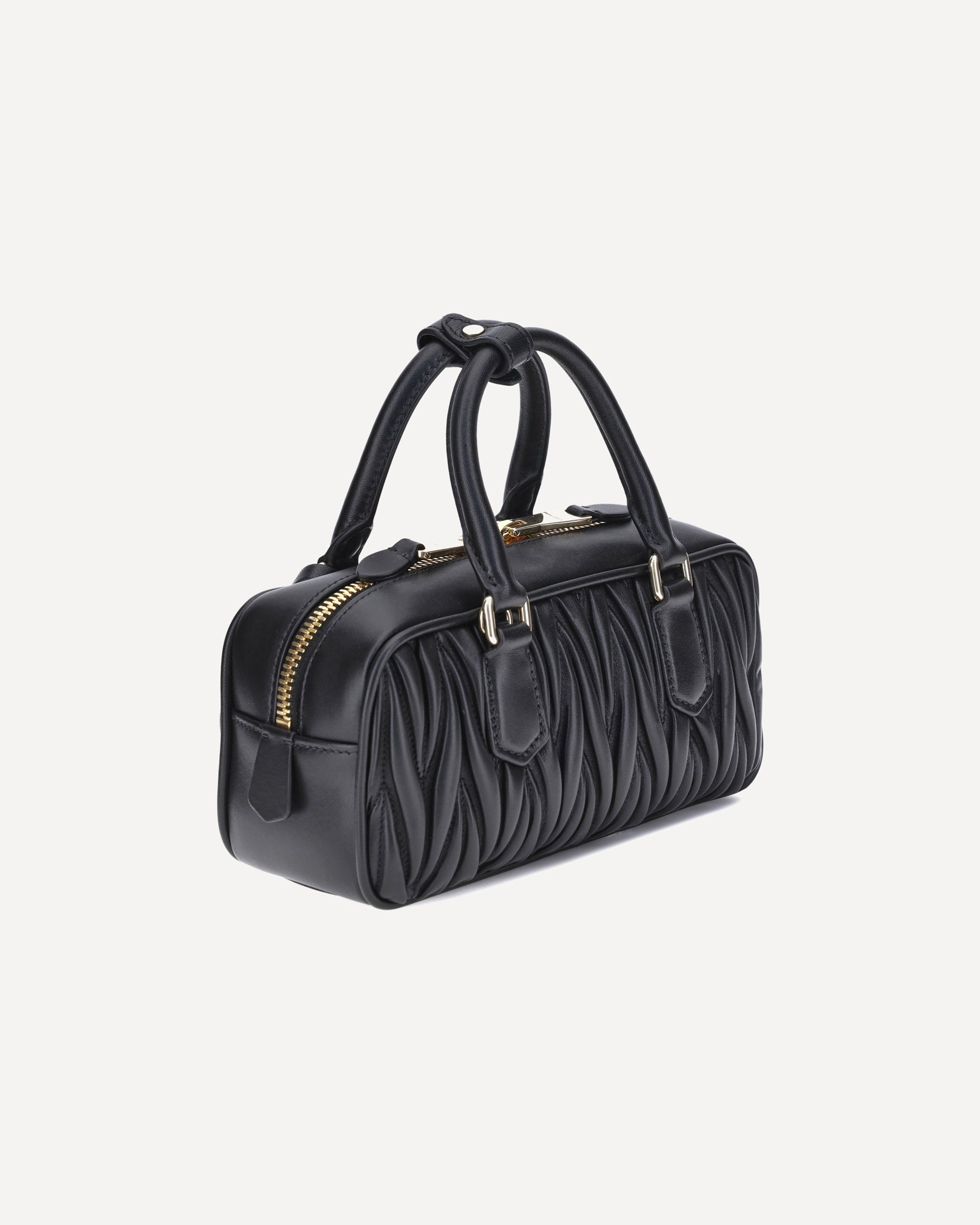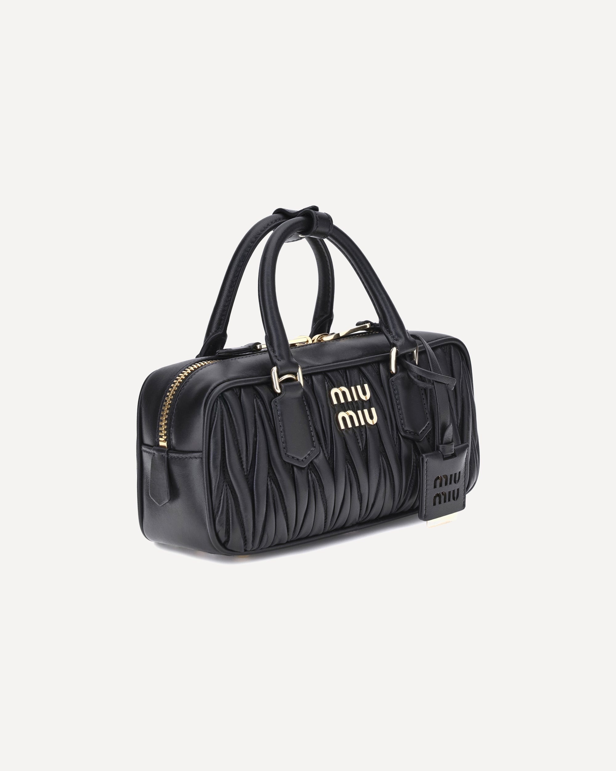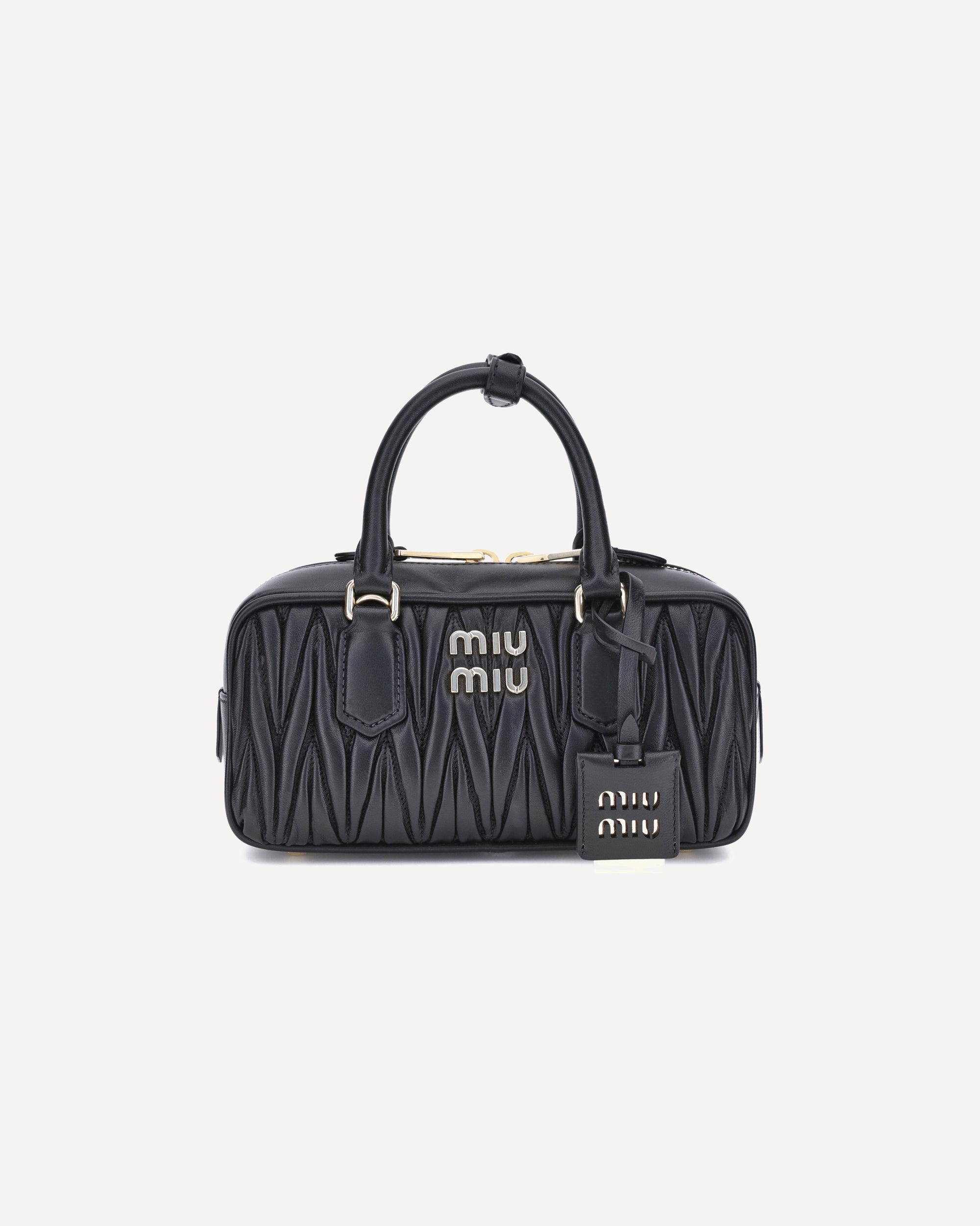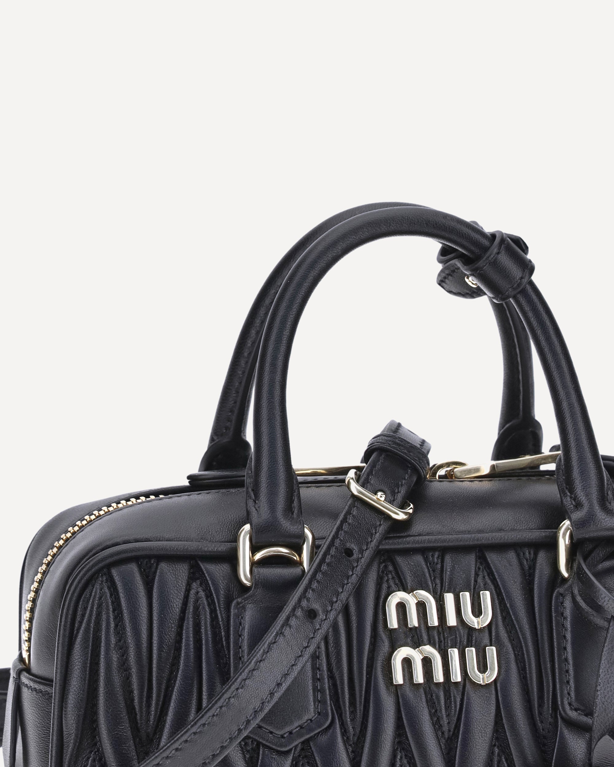 Miu Miu's Arcadie Shoulder Bag is an elegant and versatile accessory made of fine leather with the brand's signature iconic matelassé texture. Featuring a double top tubular handle, the bag has a top double-slider zipper closure for security and convenience. The adjustable and removable shoulder strap offers the option of carrying it by hand or over the shoulder. An iconic metal monogram plaque is applied to the front, adding a distinctive touch. The interior, with a single compartment, is perfect for holding essentials in style.