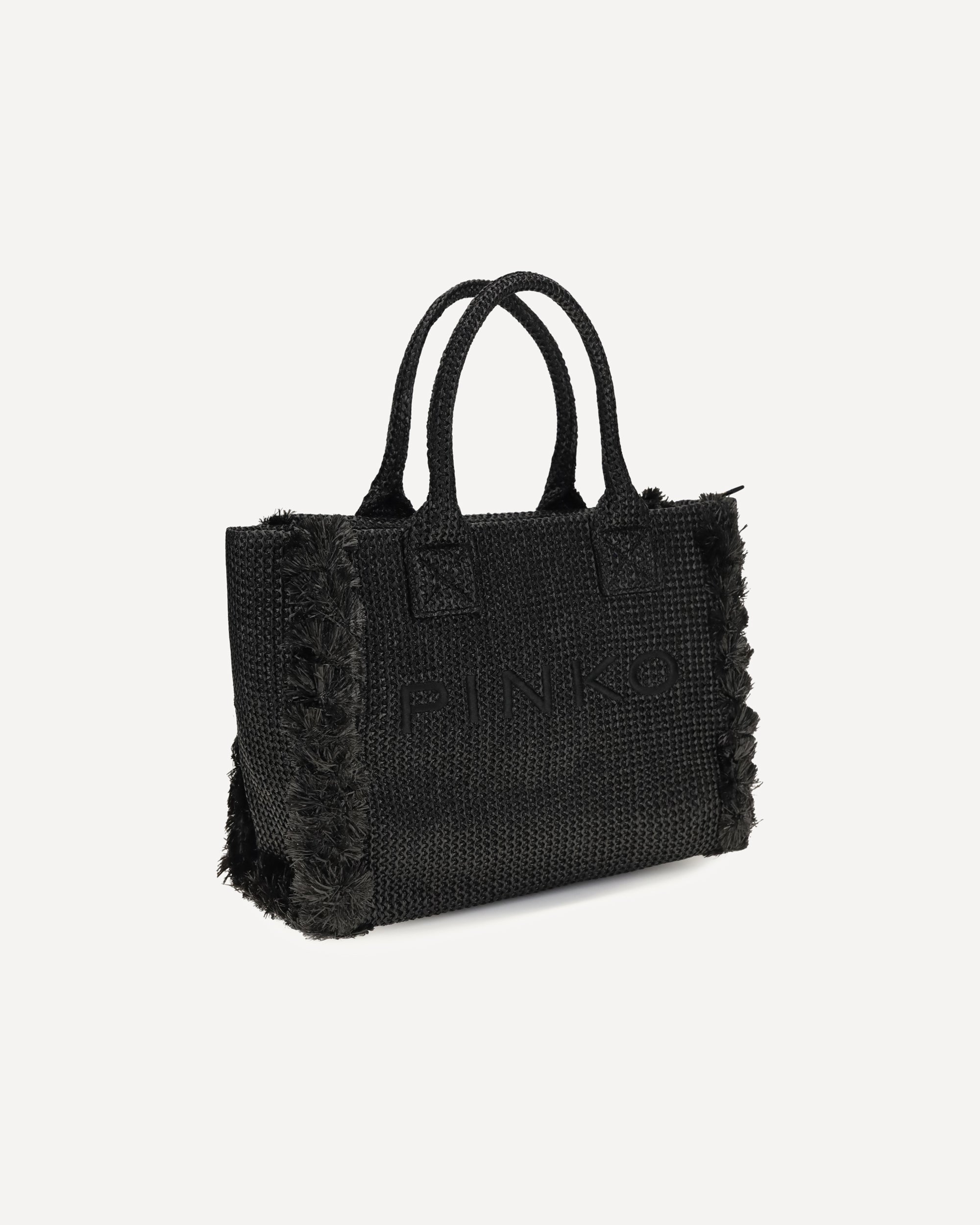The medium Beach Rafia Tote Bag by Pinko is a Beach Tote Bag with an elegant and functional design. Made from raffia with a slightly elongated rectangular shape, it features the embroidered tonal PINKO logo on the front and twisted, fringed side details. The top handle allows hand or shoulder carry, while the zip closure reveals a cotton-lined interior with a pocket.