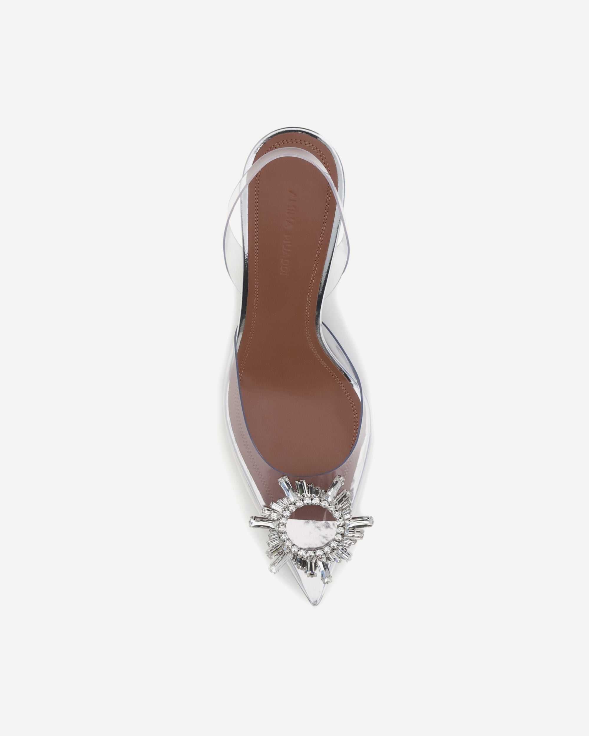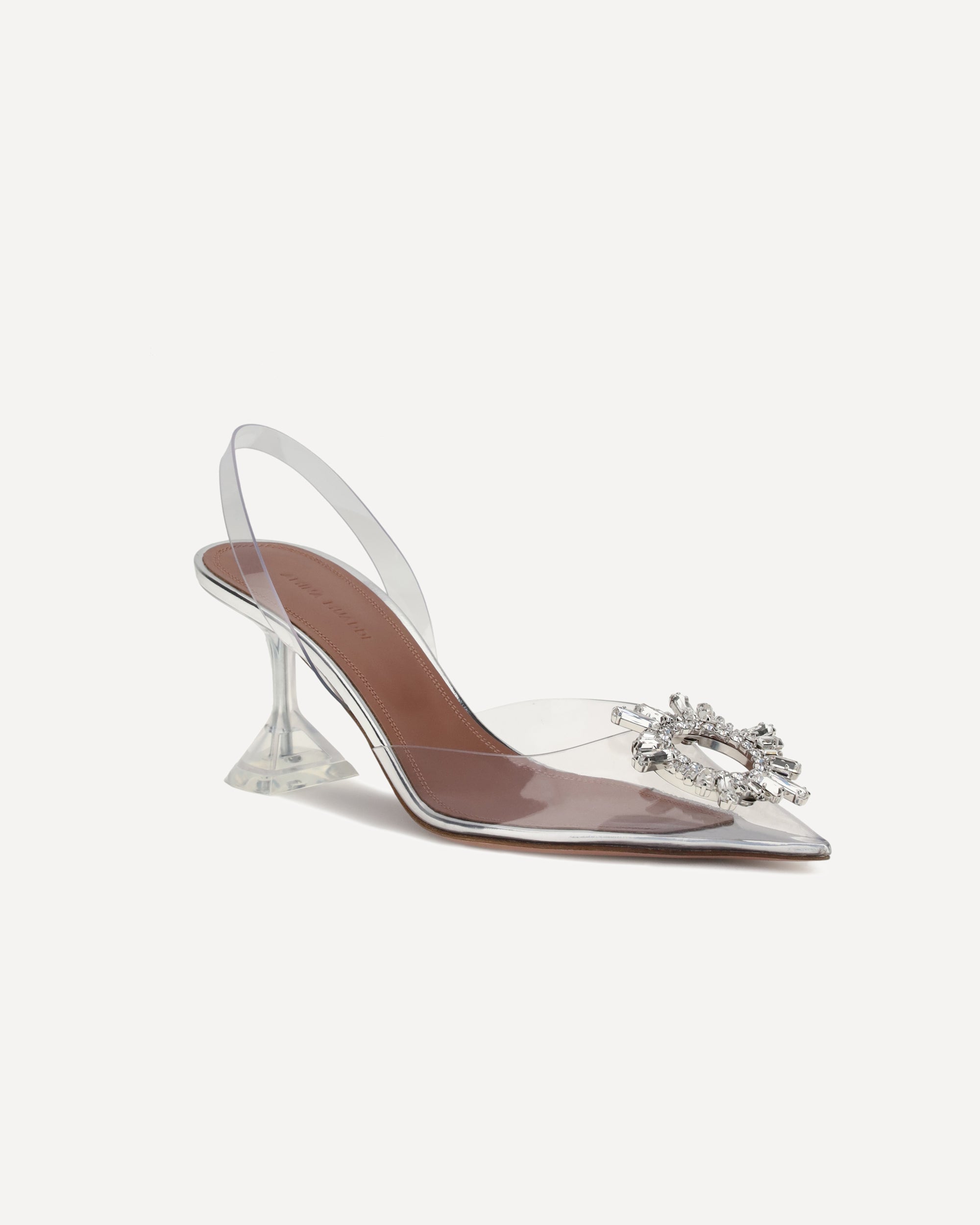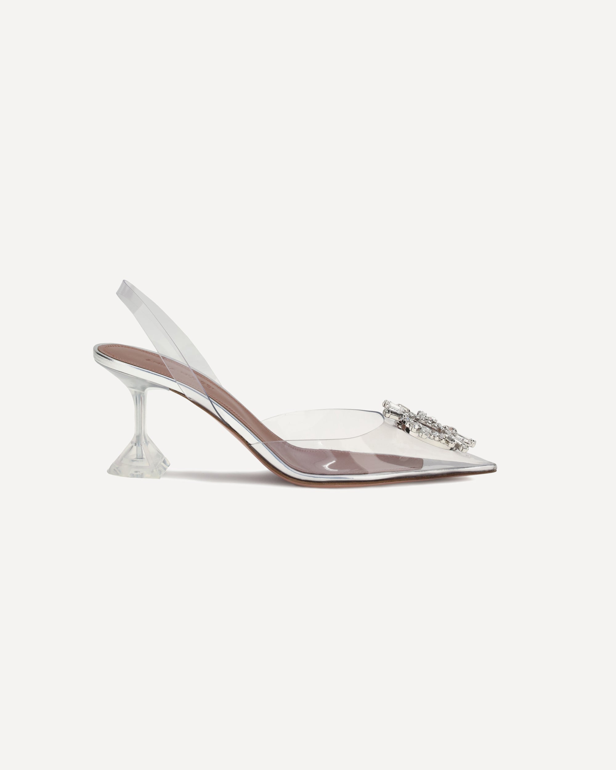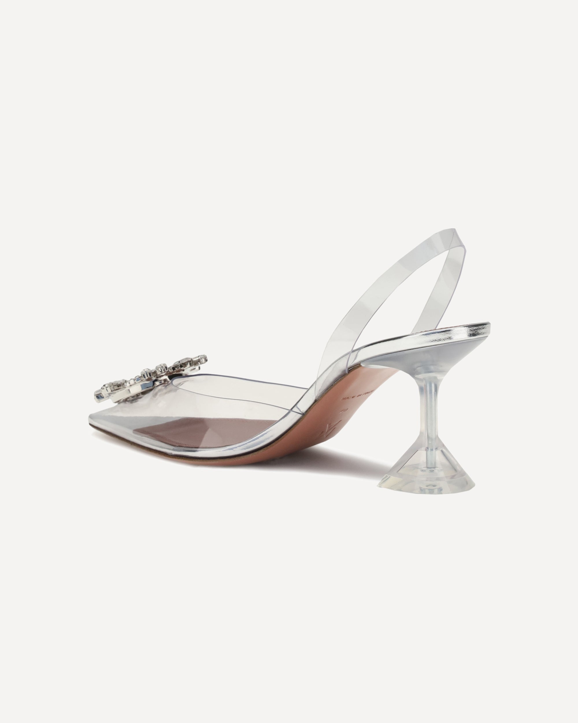 Begum Glass Pumps by Amina Muaddi captivate with a transparent and sophisticated design. Featuring an almond toe and a slingback detail on the heel, they are distinguished by a semi-transparent geometric kitten heel that adds lightness and modernity to the silhouette. A precious embossed jewel decorated with rhinestones and diamonds stands out on the toe, while the press-studded logo insole completes the model with an exclusive touch. Perfect for an elegant and dramatic look.