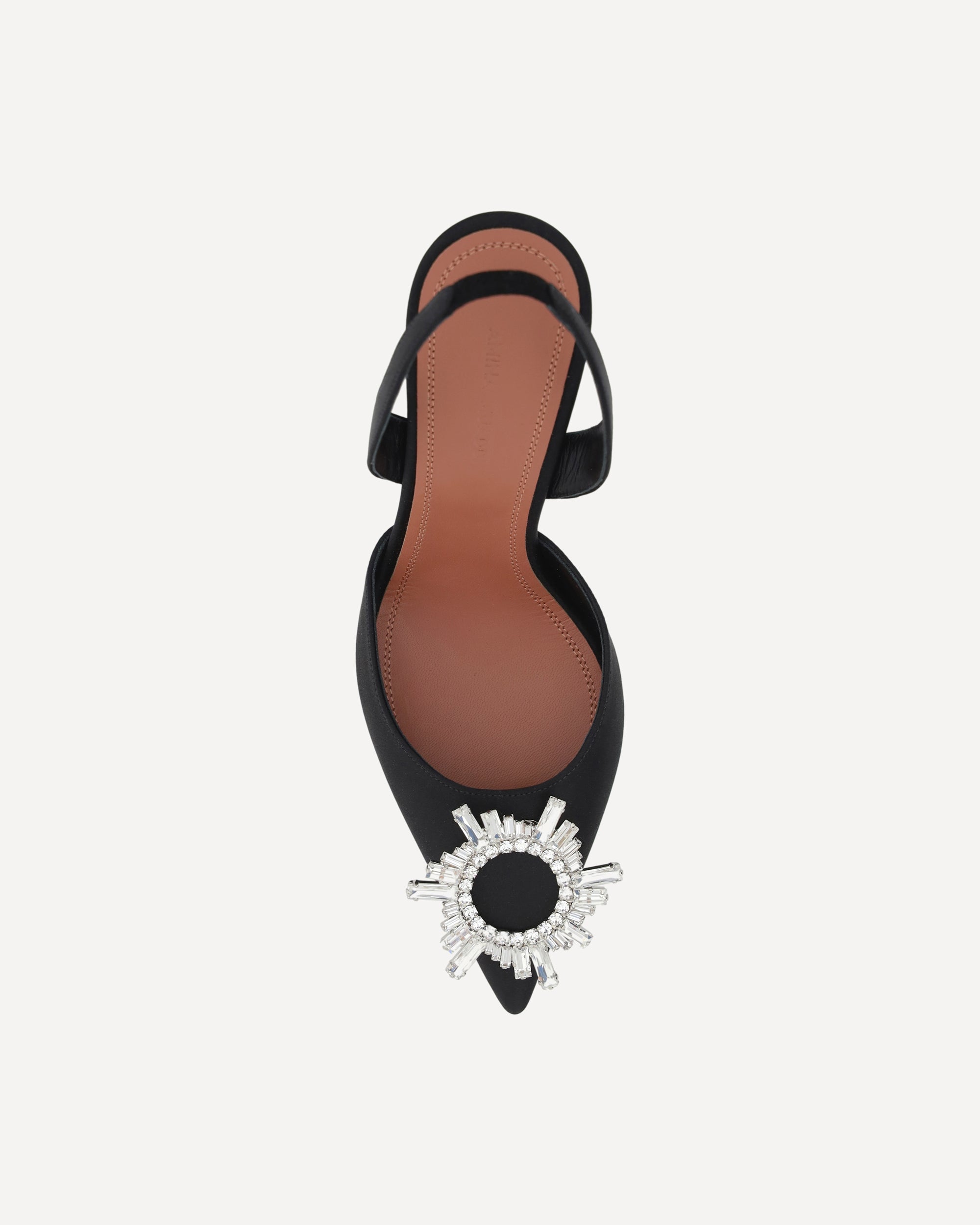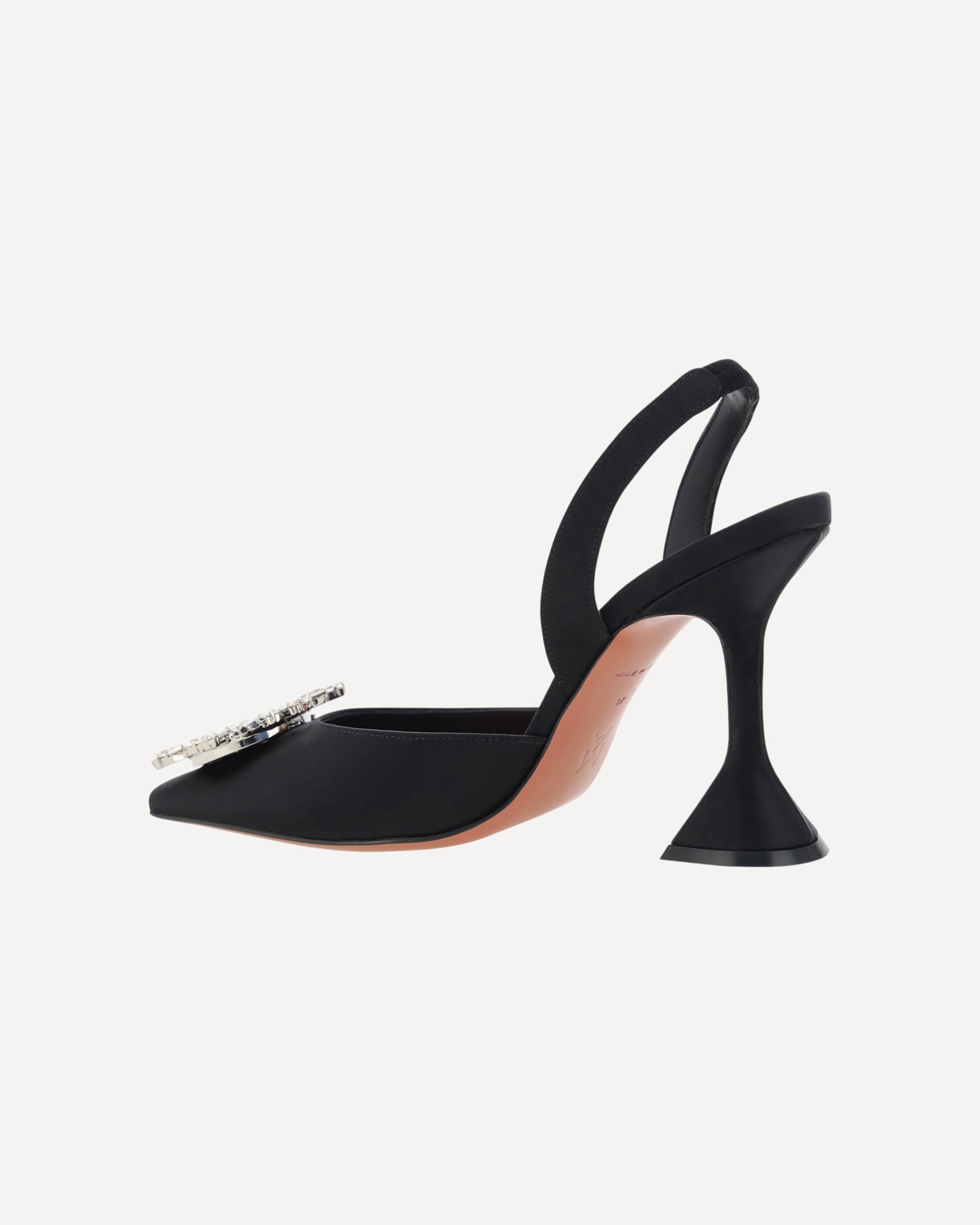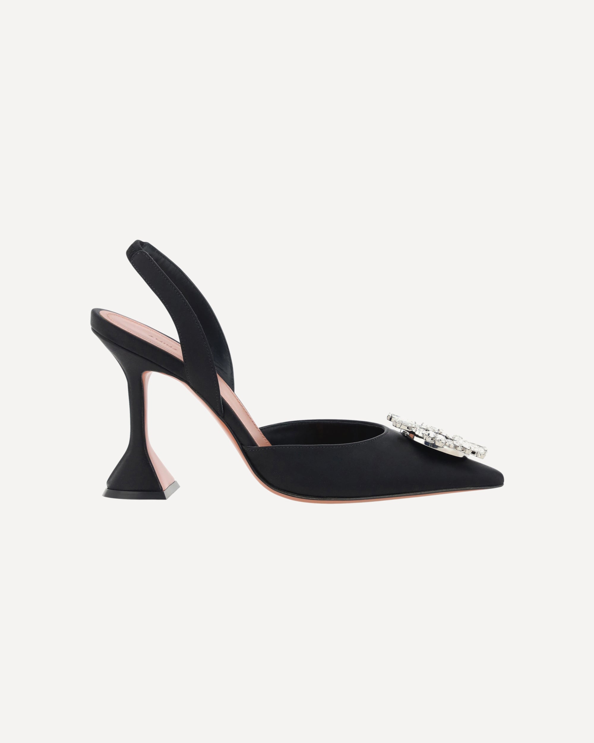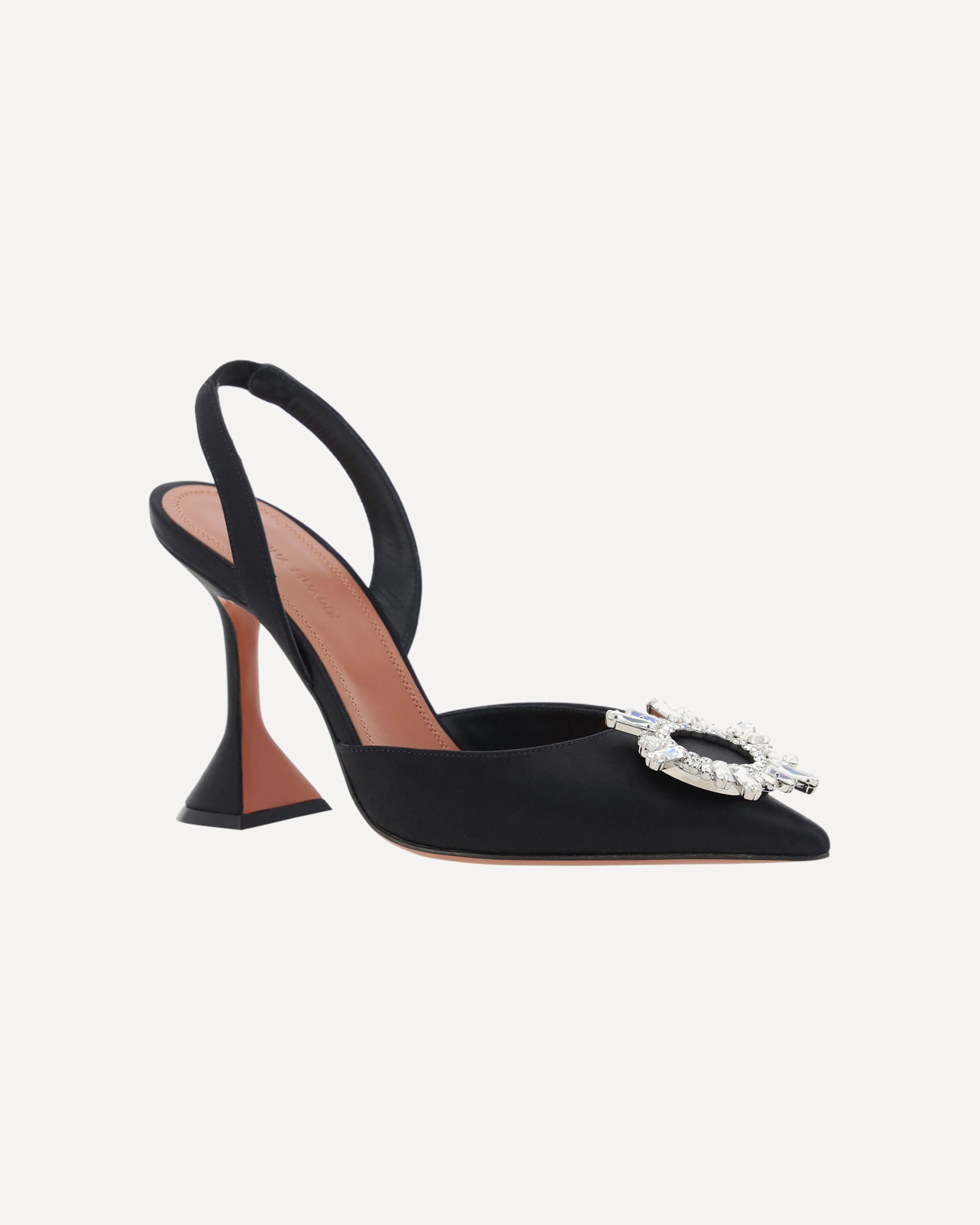 Begum Pumps by Amina Muaddi, elongated almond toe on front, geometric leather heel, slingback detail on heel, rhinestone and glitter jewel applied embossed on toe, press-on logo leather insole.