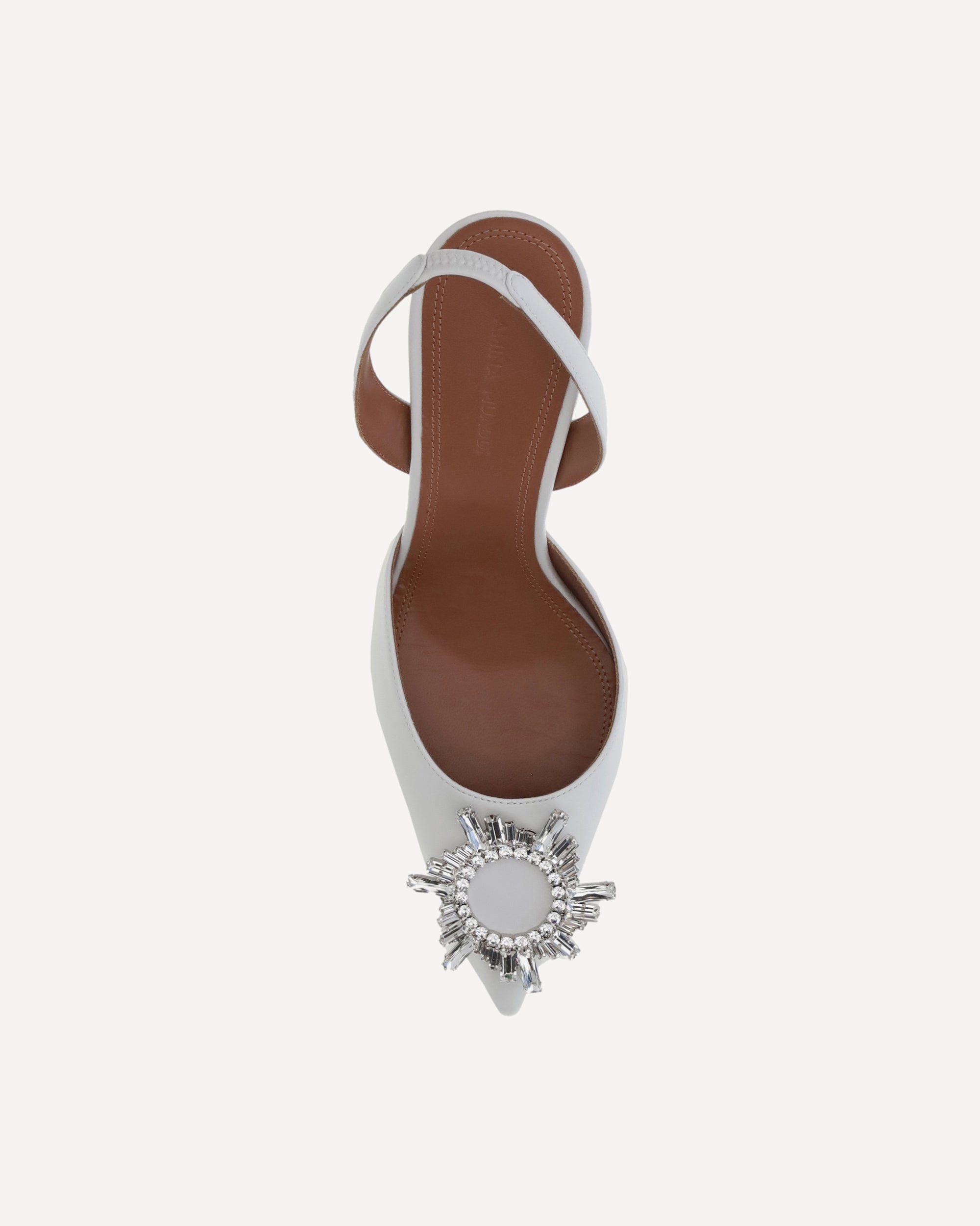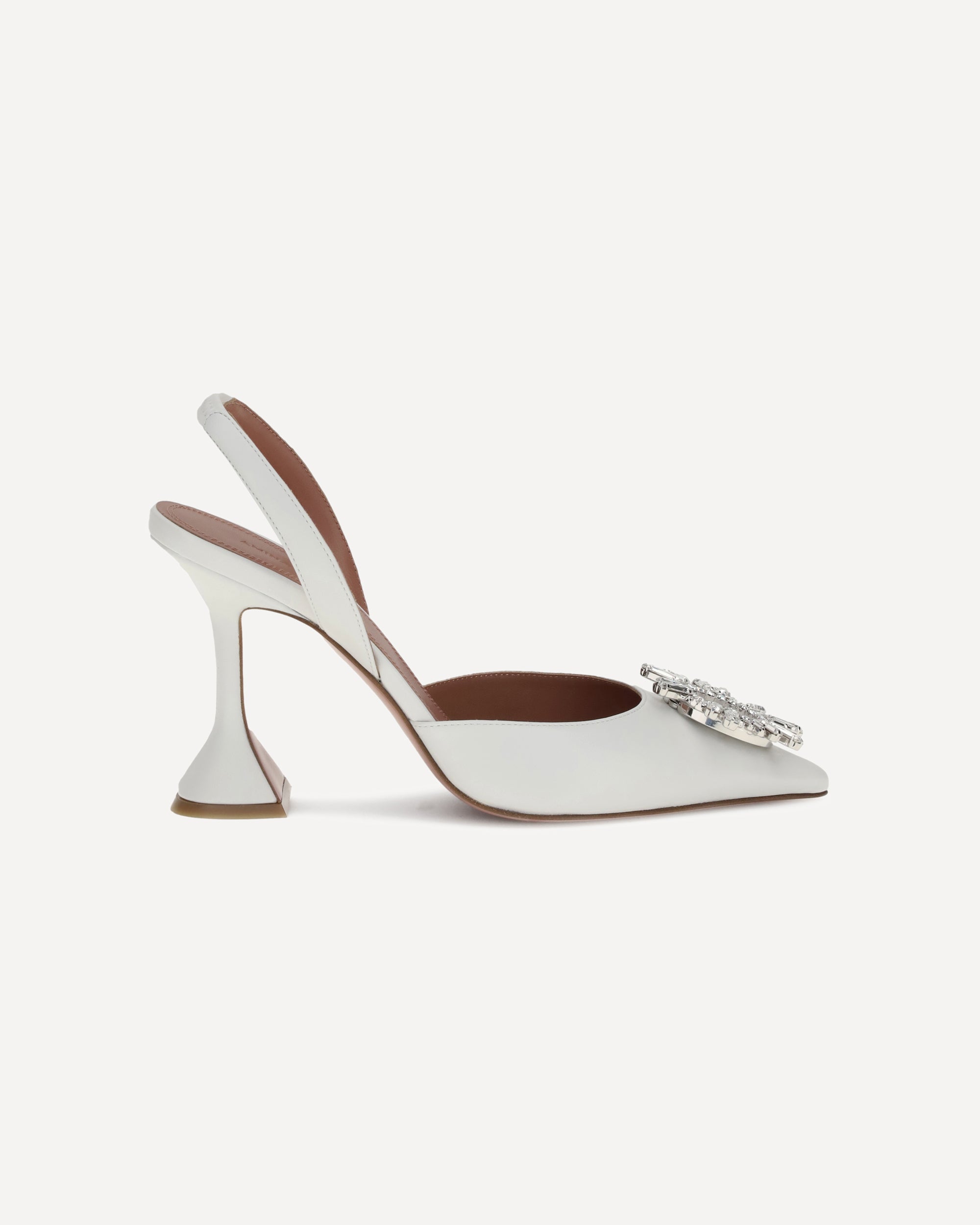Amina Muaddi's Begum Pumps are an icon of elegance and femininity. Characterized by an elongated almond toe and a refined slingback detail on the heel, they feature a geometric leather heel that expresses all the brand's distinctive aesthetic. An embossed jewel, studded with rhinestones and diamonds, stands out on the toe, lending light and character. Completing the design is a leather insole with a press-on logo for a final touch of understated luxury.