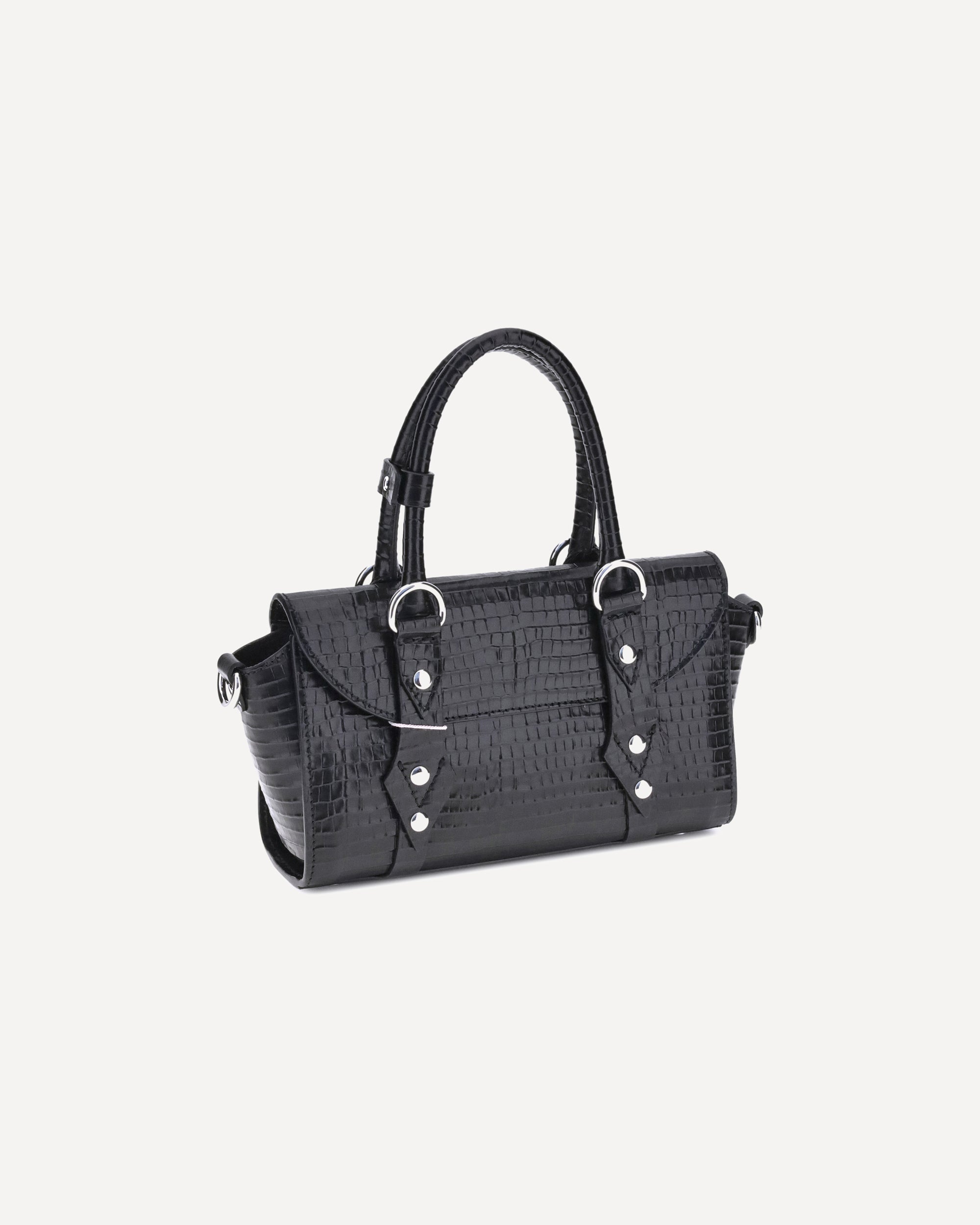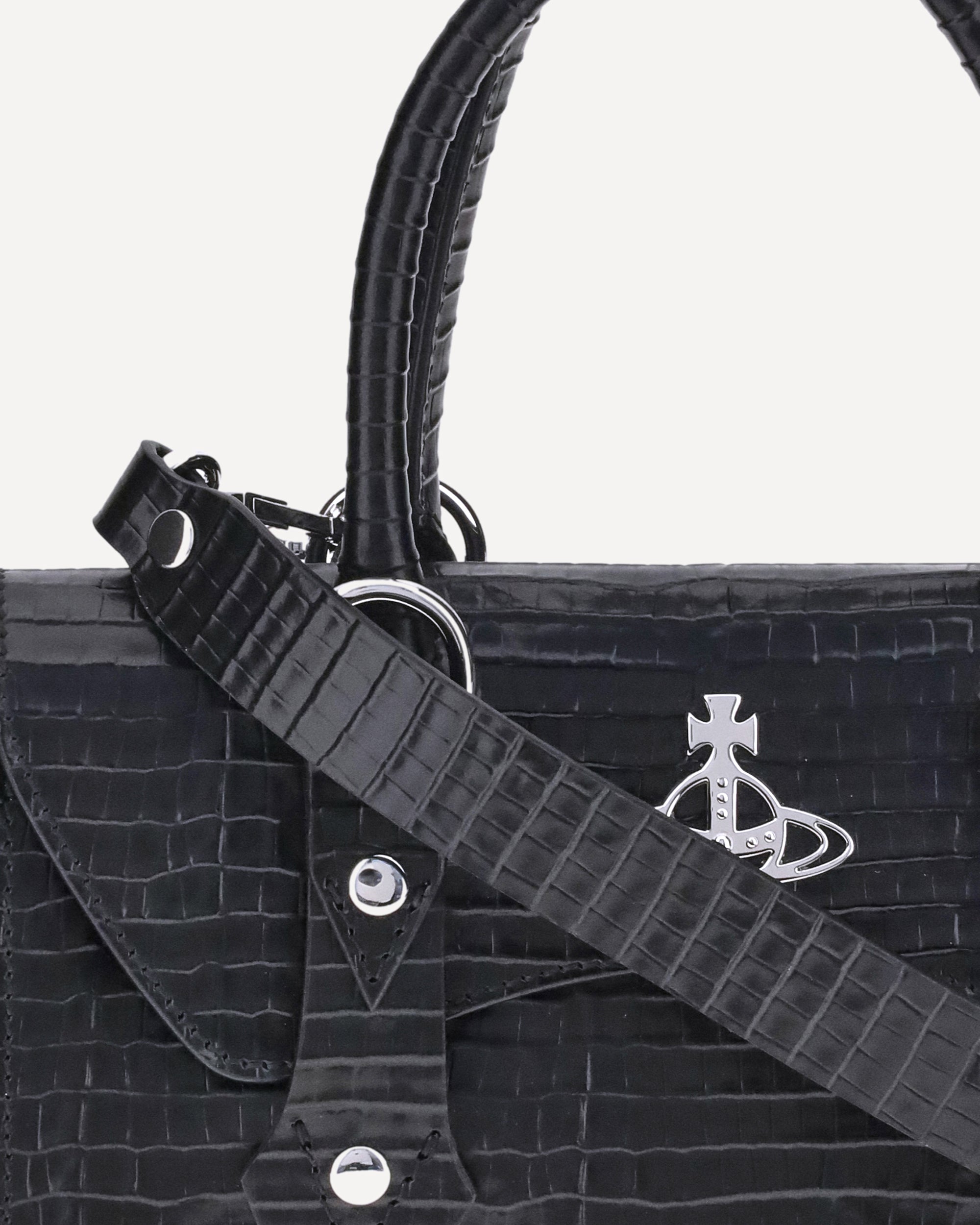 Vivienne Westwood's Bettina Shoulder Bag is an accessory with a strong character, made unique by the croco effect that enhances its sophisticated texture. Equipped with two tubular handles and an adjustable and removable shoulder strap, it combines style and versatility. The iconic Orb logo, the Maison's unmistakable signature, stands out on the front. Perfect for adding a gritty touch to any look.