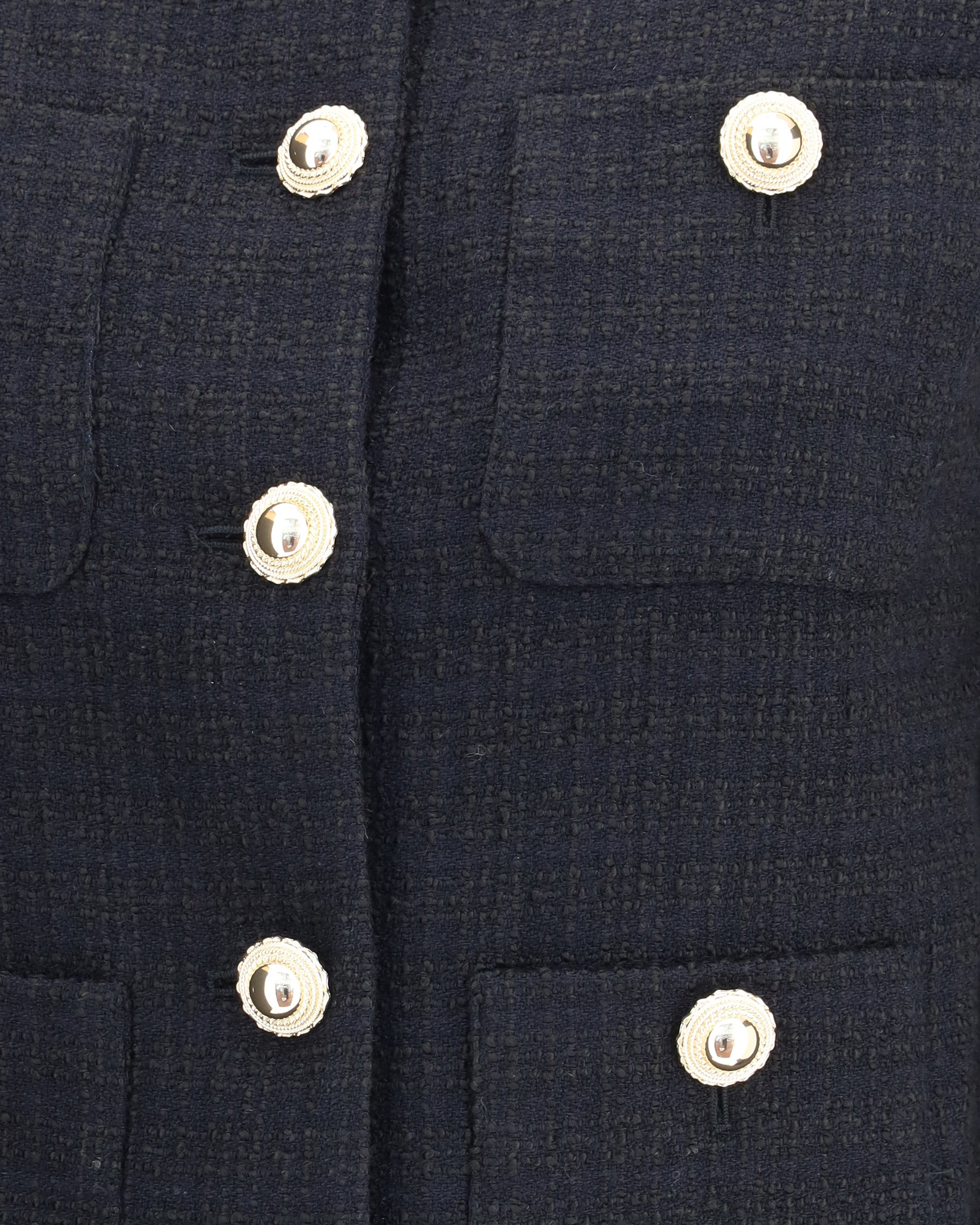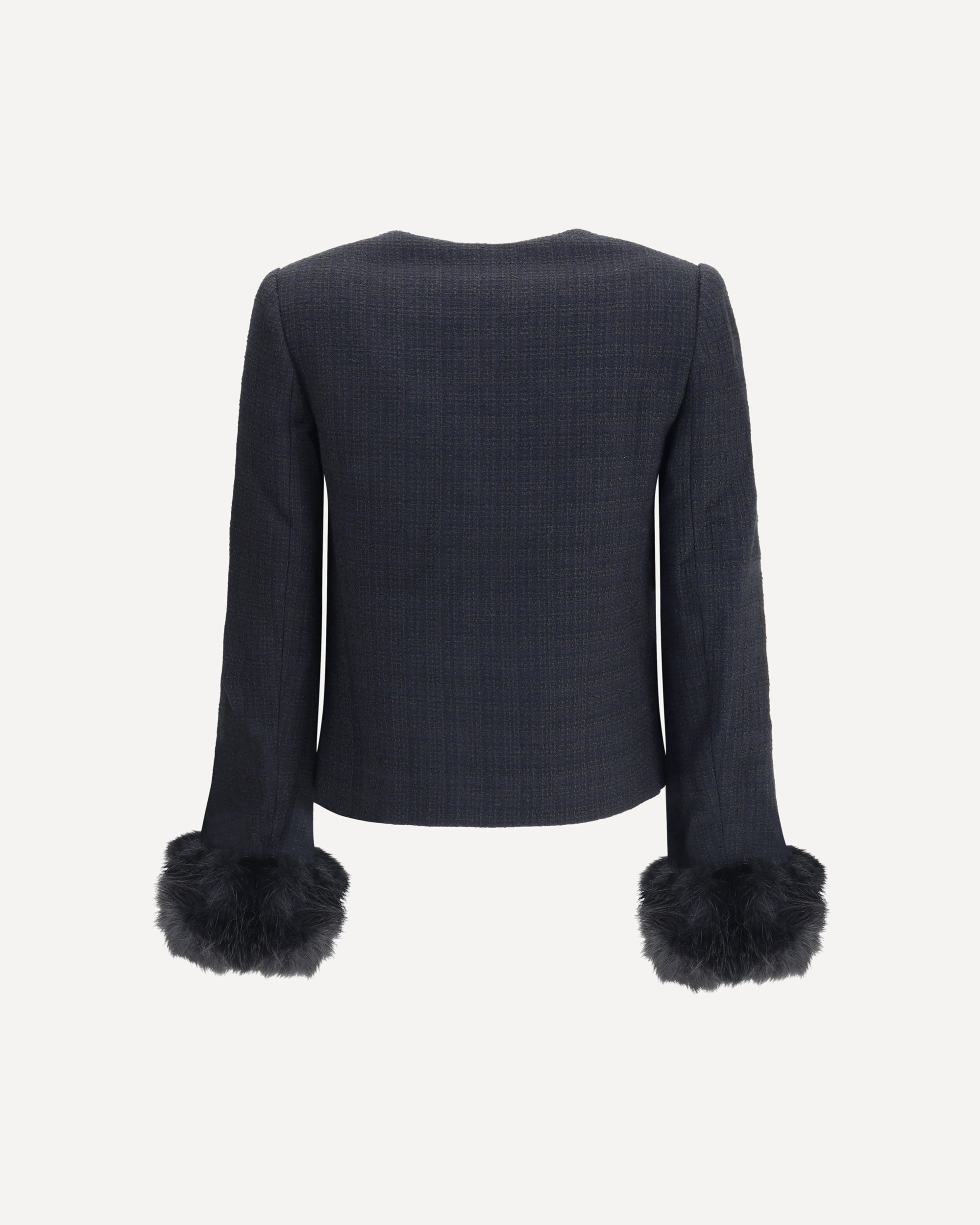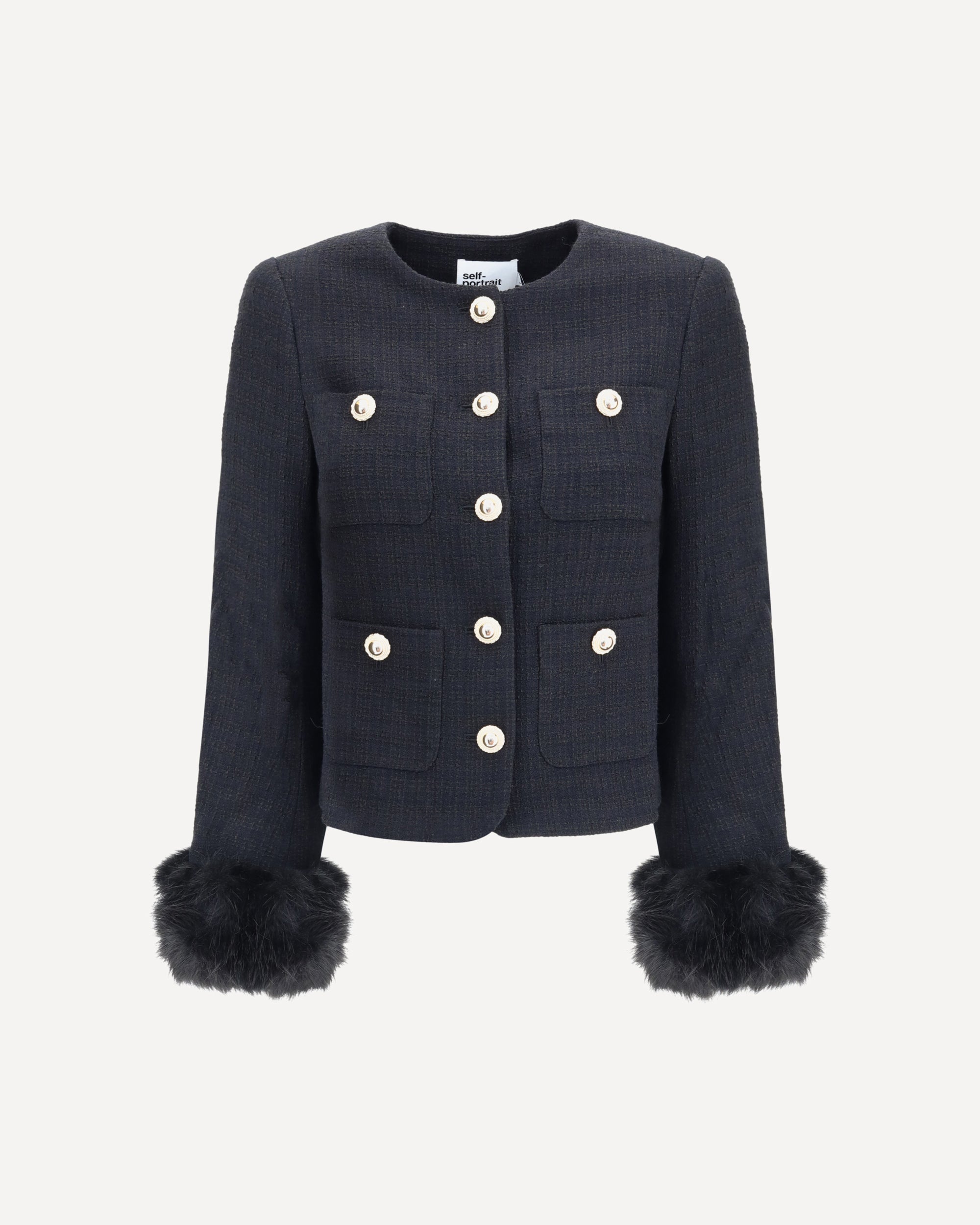 Self-Portrait's Fur cuffed Jacket is an elegant and sophisticated piece, perfect for completing evening looks with a sophisticated touch. Gold buttons add an opulent accent, while removable faux fur cuffs allow you to modulate the style to suit the occasion. Featuring a relaxed fit, front button closure and functional pockets, it pairs perfectly with a slip dress for effortless elegance. True-to-size fit.