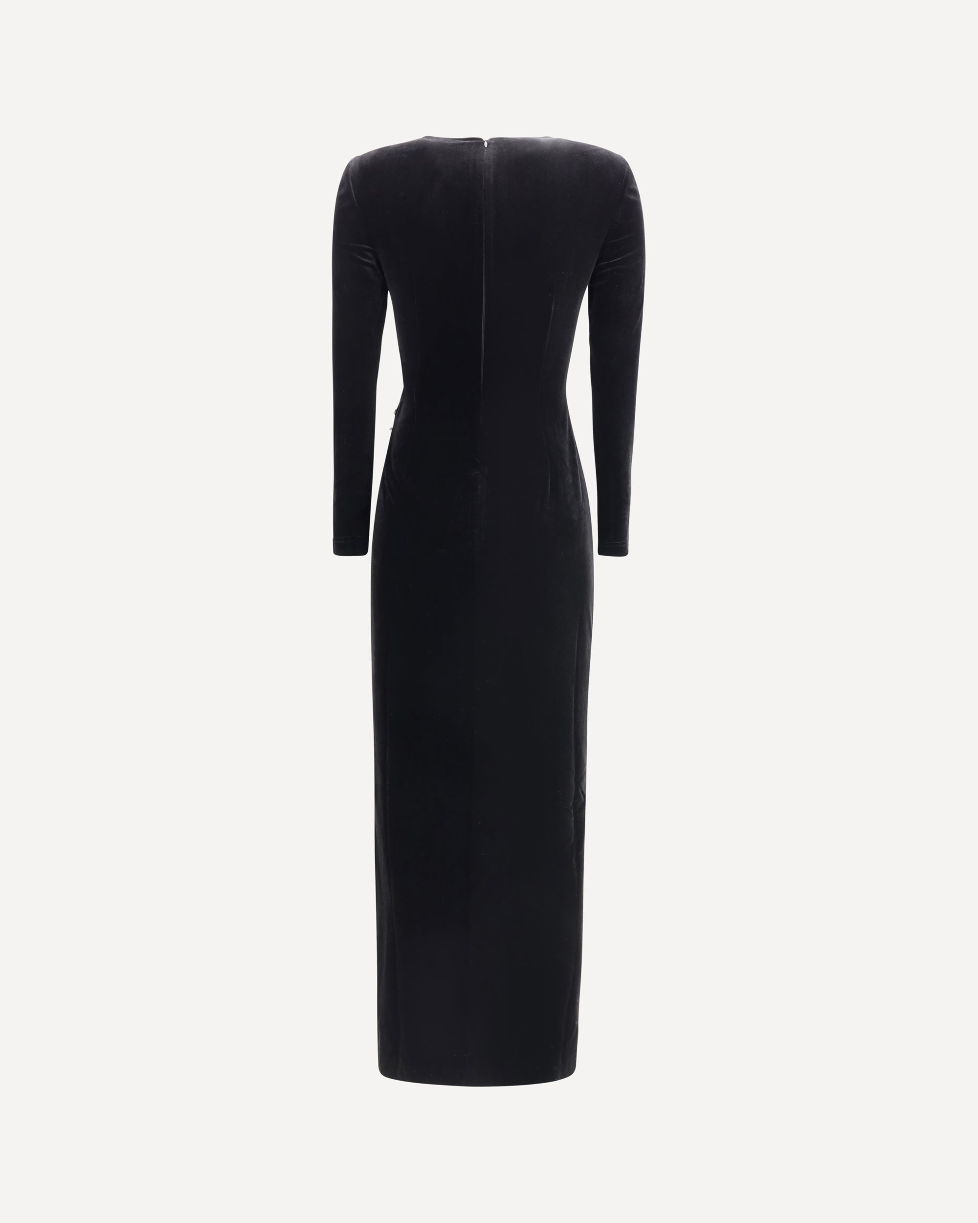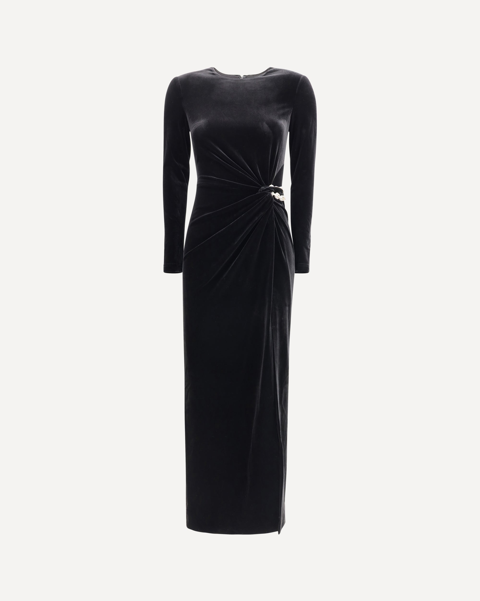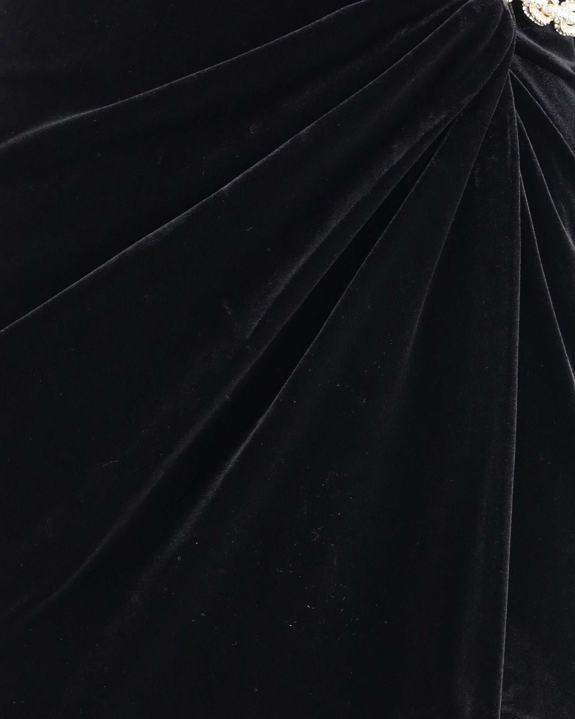 Self-Portrait's Embellished velvet midi Dress is a glamorous and bold piece of clothing perfect for special occasions. Made of black velvet, it features a fitted cut with a bold side slit and a cutout that elegantly enhances the silhouette. Gold chains embellished with rhinestones add a touch of sophisticated sparkle. A back zipper closure and removable straps complete the design for a versatile and striking look.