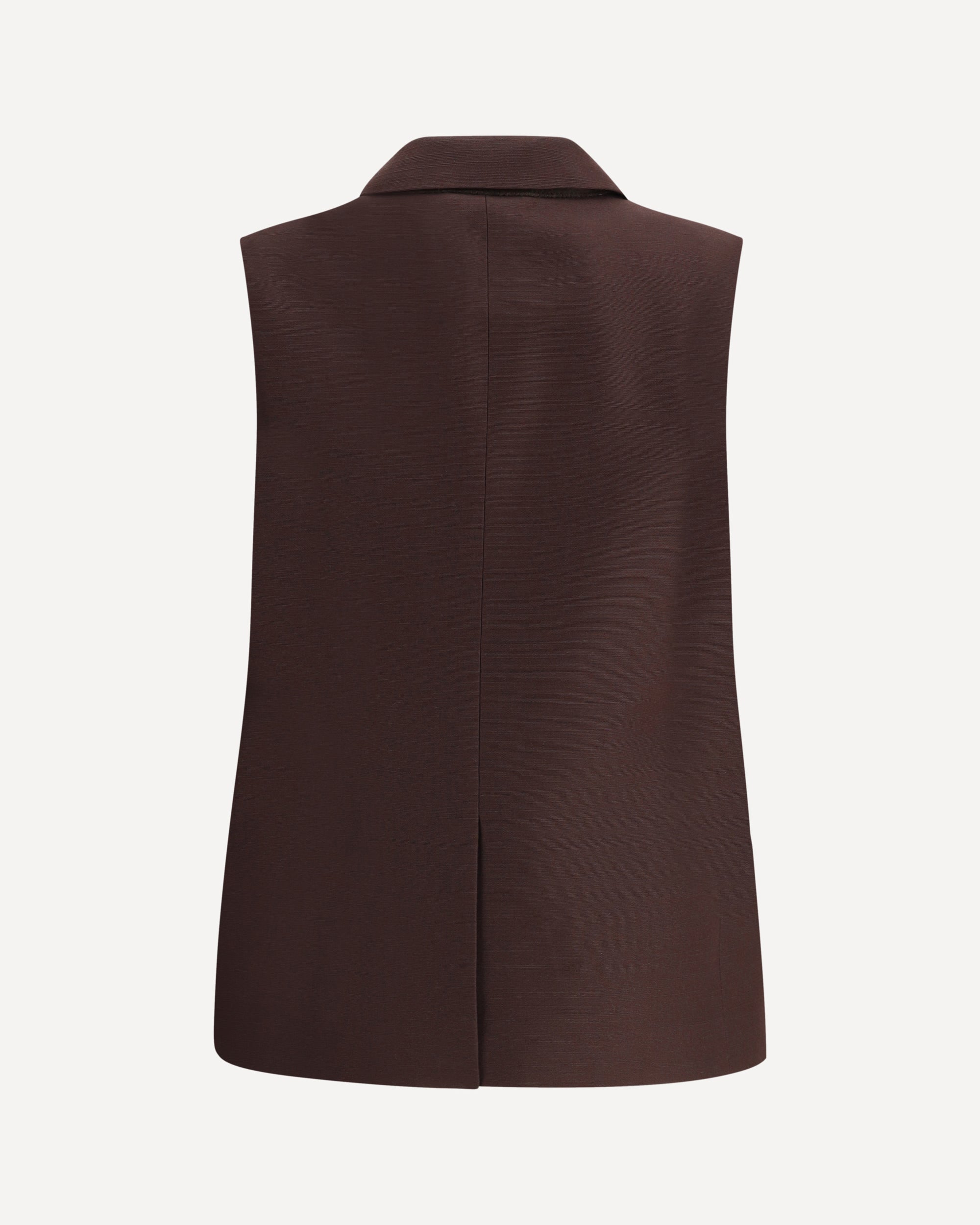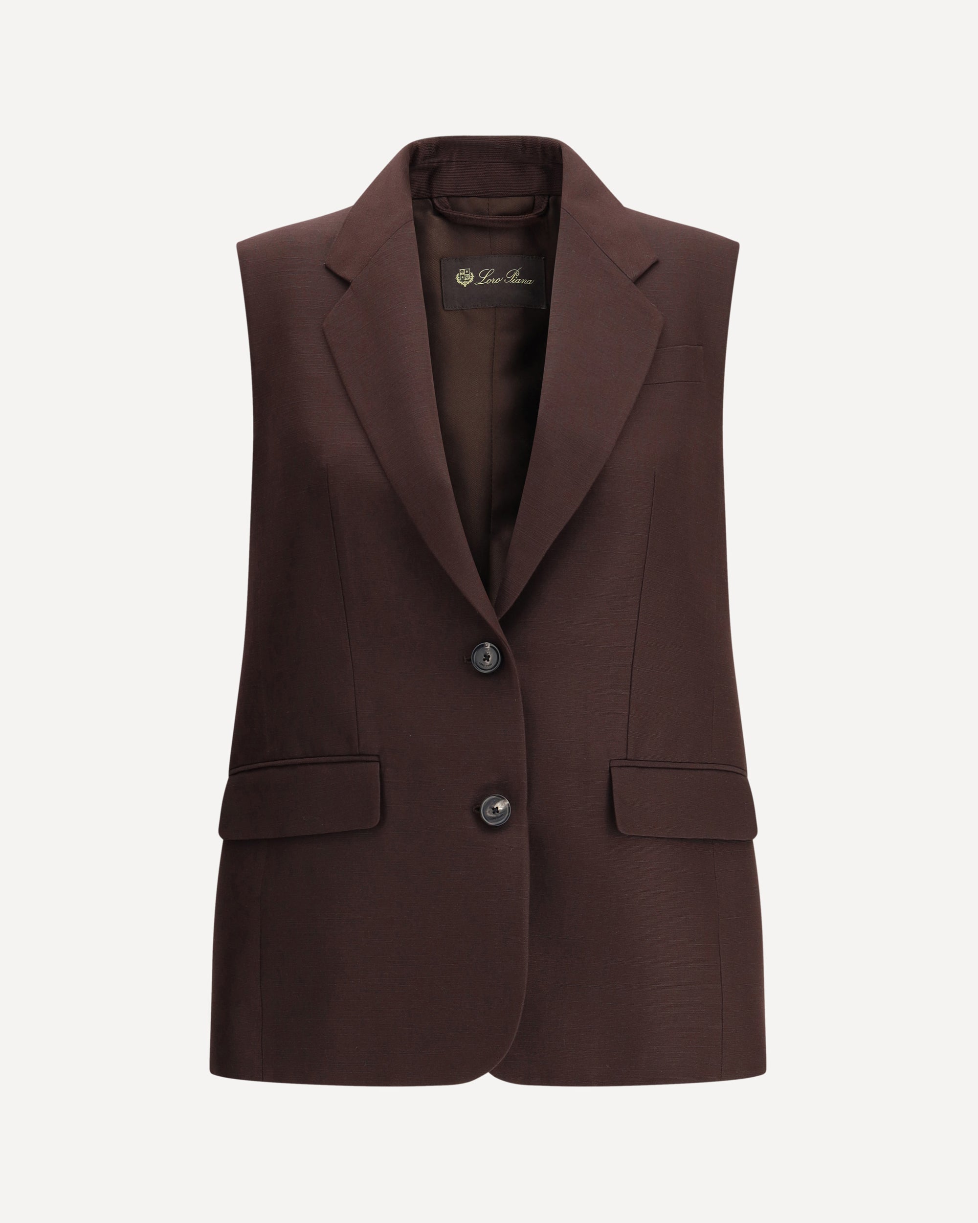 Loro Piana's silk Blazer Vest is a sophisticated garment that combines the elegance of a blazer with the lightness of silk. Featuring a classic lapel and front button closure, it has two flap welt pockets on the front panel and a back slit that adds movement and comfort. Perfect to wear alone or as a refined layer over shirts and tops for a formal yet modern look.
