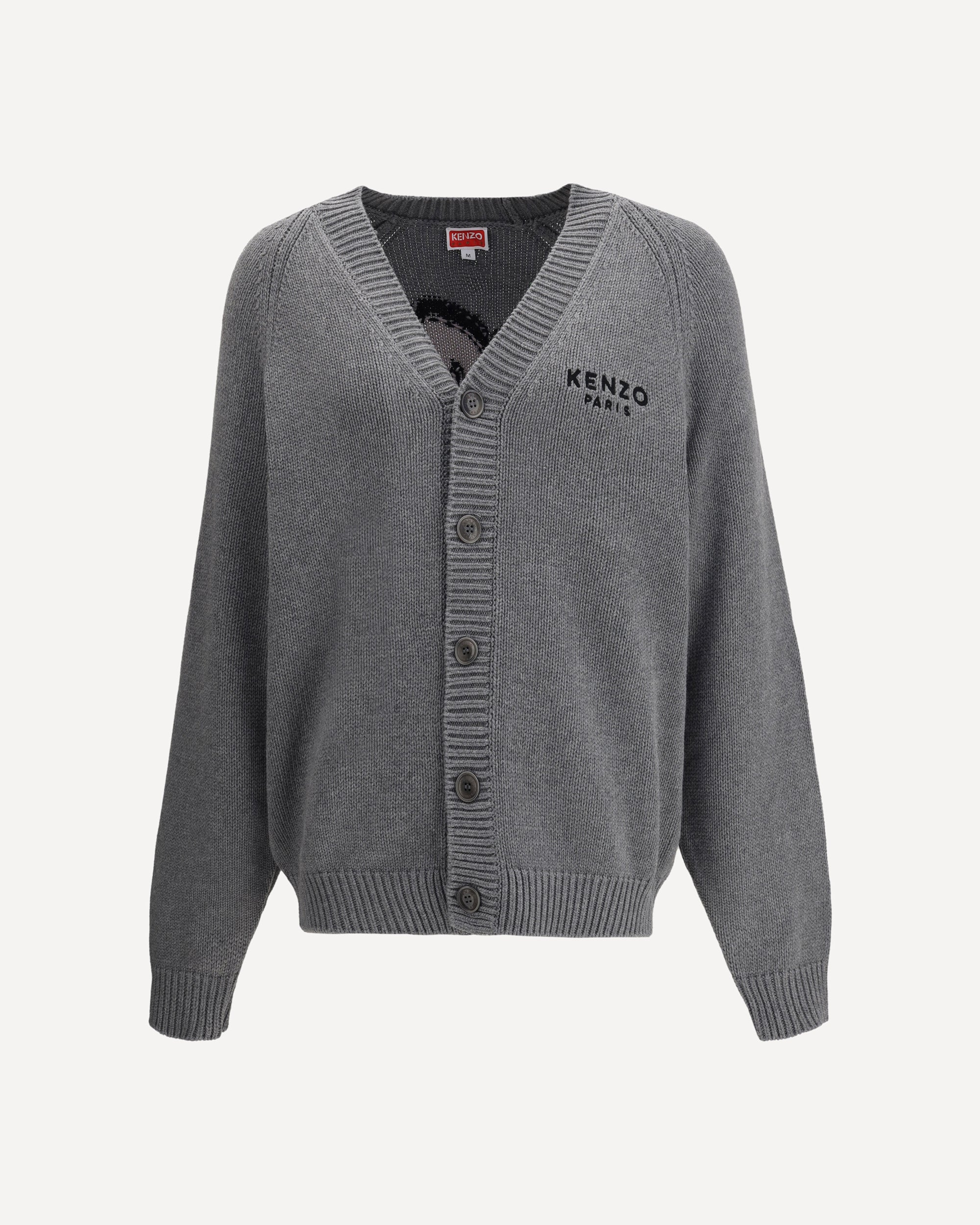 Kenzo's Boke Flower Cardigan, made from a fine blend of cotton and wool, combines tradition and modernity with a richly detailed design. Featuring a V-neckline and raglan sleeves, it offers a relaxed and comfortable fit. The front closure is complemented by personalized buttons with KENZO Paris branding, while the same logo is embroidered on the chest, accompanied by embroidered inserts and motifs that enhance the garment with a graphic and distinctive touch. A versatile and refined cardigan, perfect for adding personality to everyday looks.
