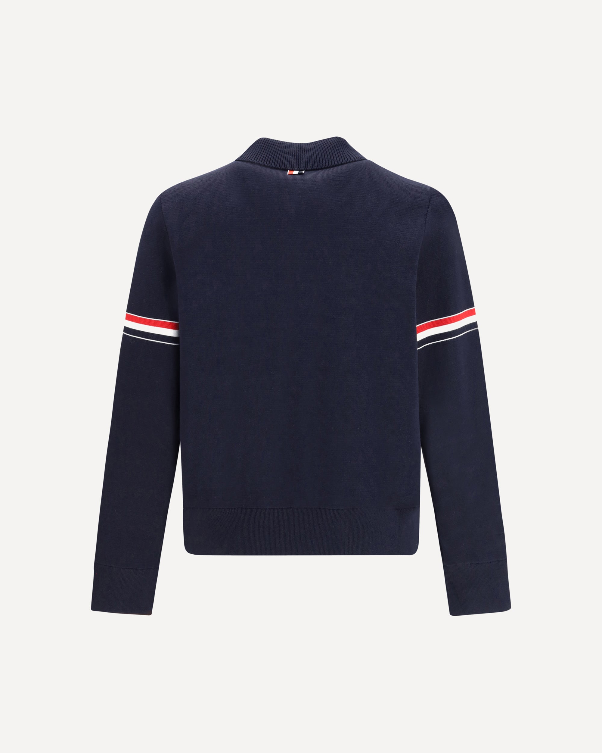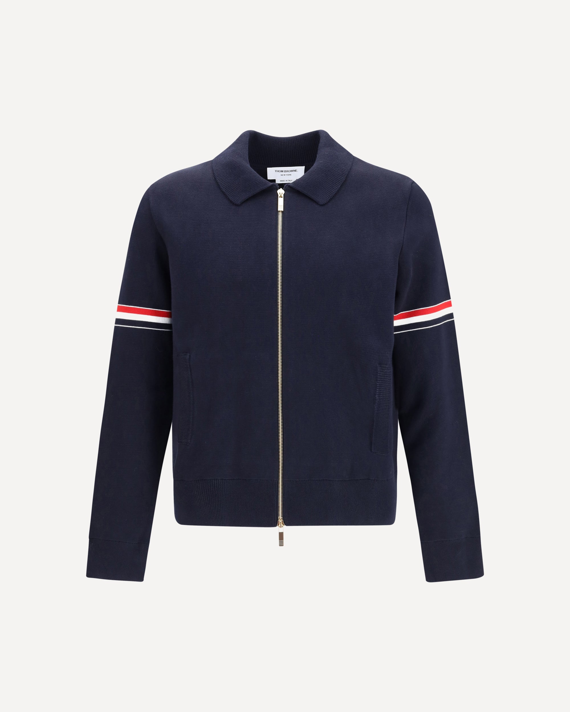 Zip Sweatshirt by Thom Browne features a ribbed collar and a double-slider front zipper closure. Ribbed cuffs and hem ensure a comfortable fit, while side welt pockets combine practicality and style. Completing the design is the iconic colorful band on the sleeves, a hallmark of the brand.