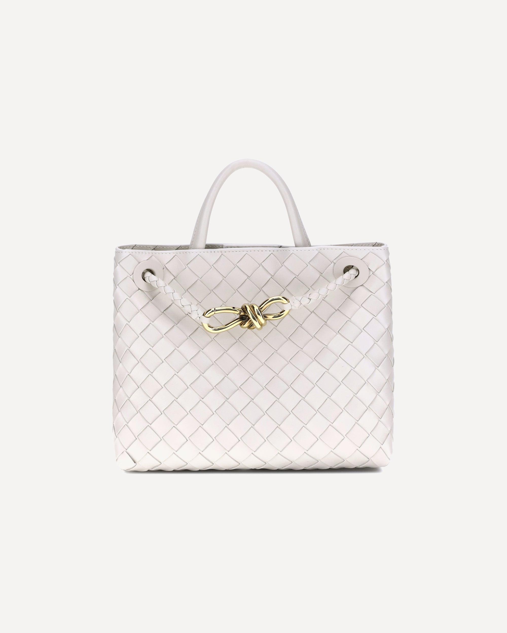 The Andiamo lambskin Shoulder Bag by Bottega Veneta features the brand's iconic intrecciato design covering the entire surface. It has a single rigid handle and a matching sliding shoulder strap, embellished with the iconic knotted brass Muse detail. The bag closes via a top magnetic flap. Inside, it features dual interior compartments and an interior welt pocket for optimal organization. A stylish and practical accessory for any occasion.