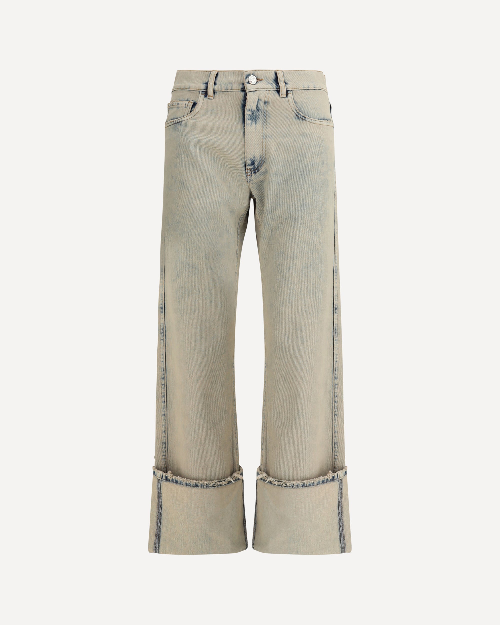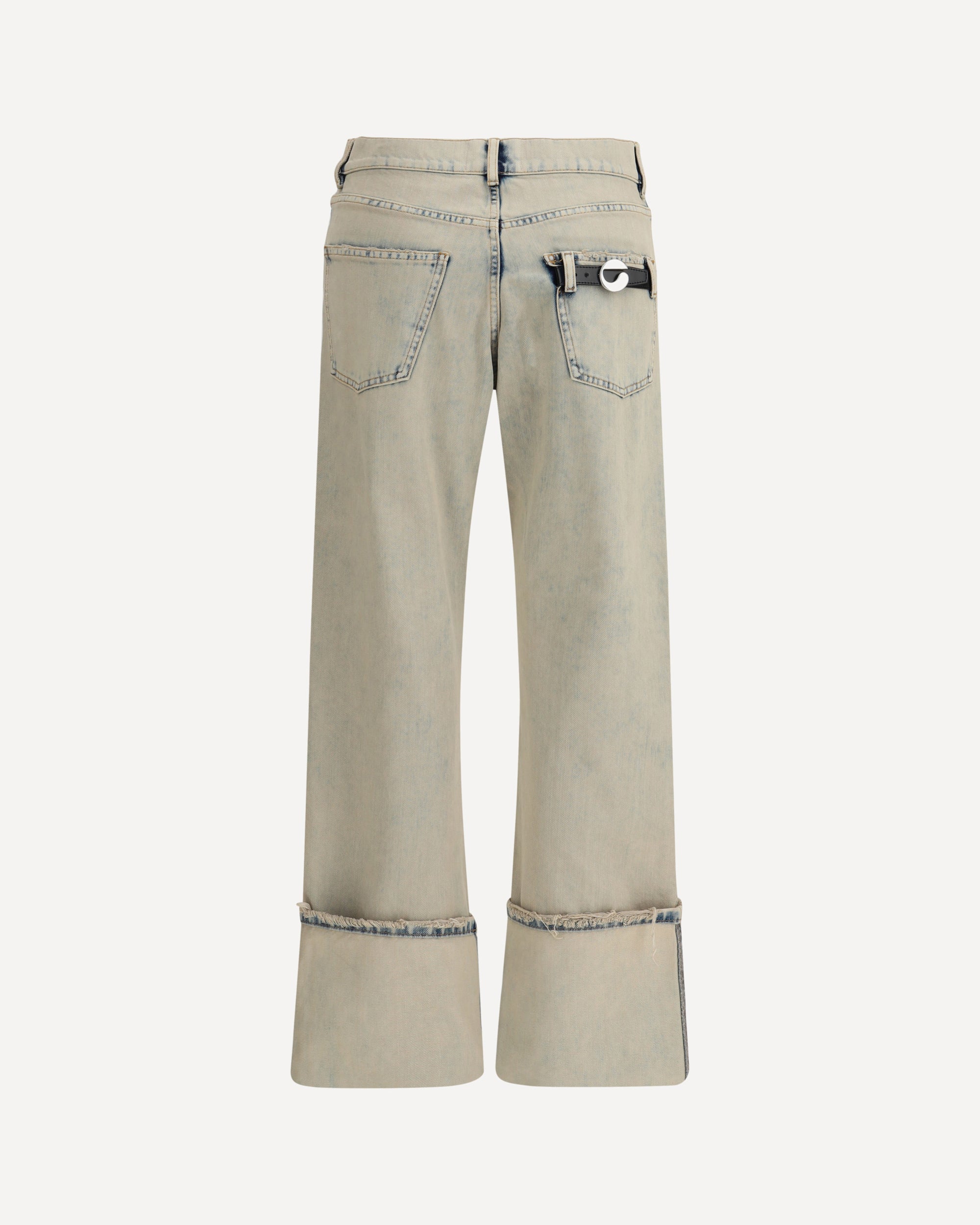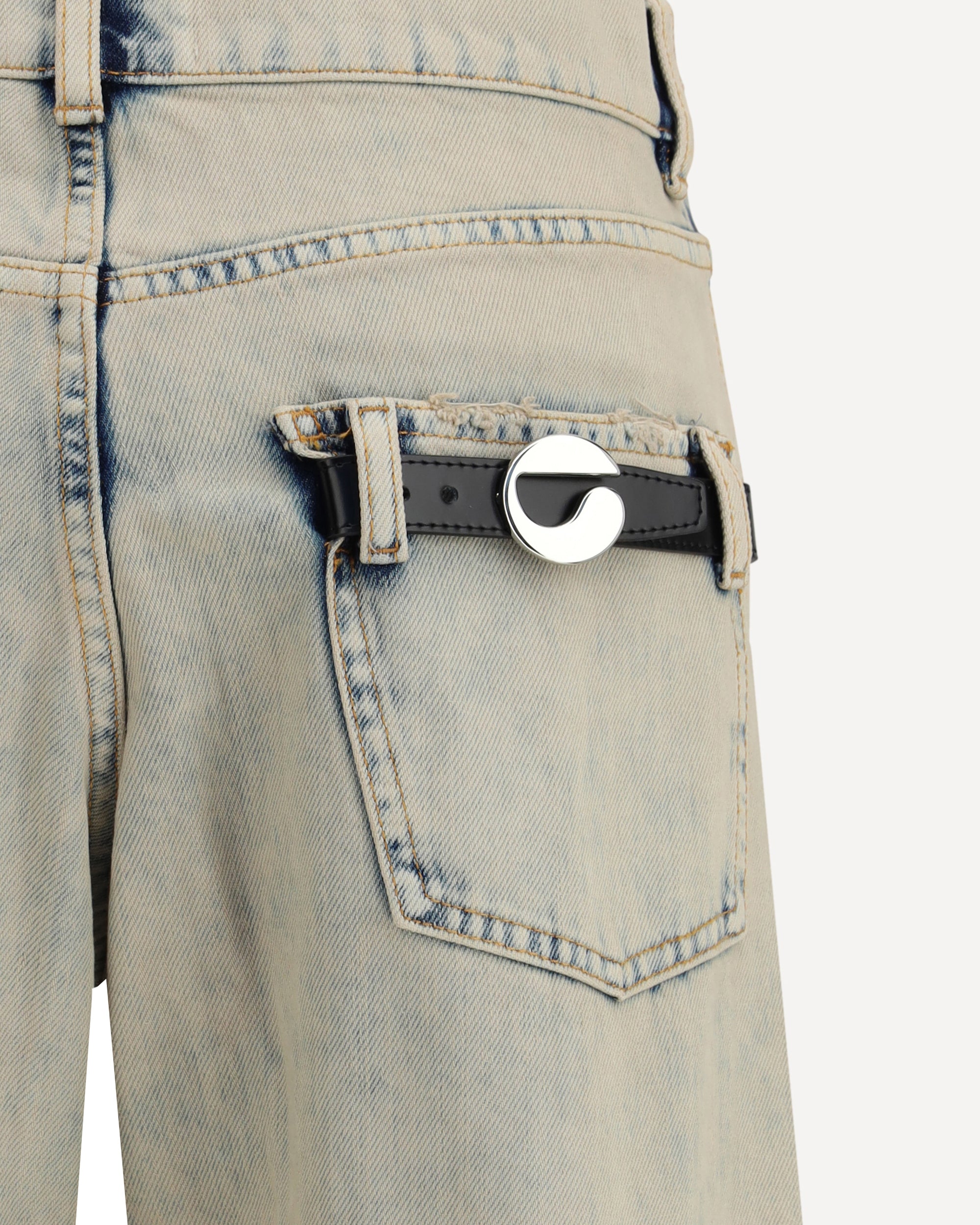 Coperni's Boyfriend Jeans reinterpret a classic with a contemporary twist. Featuring a cuffed, five-pocket design, they have belt loops at the waist and a front zipper and button closure. The distinctive detail is the leather logo buckle applied to the back pocket, which adds a refined, modern touch.