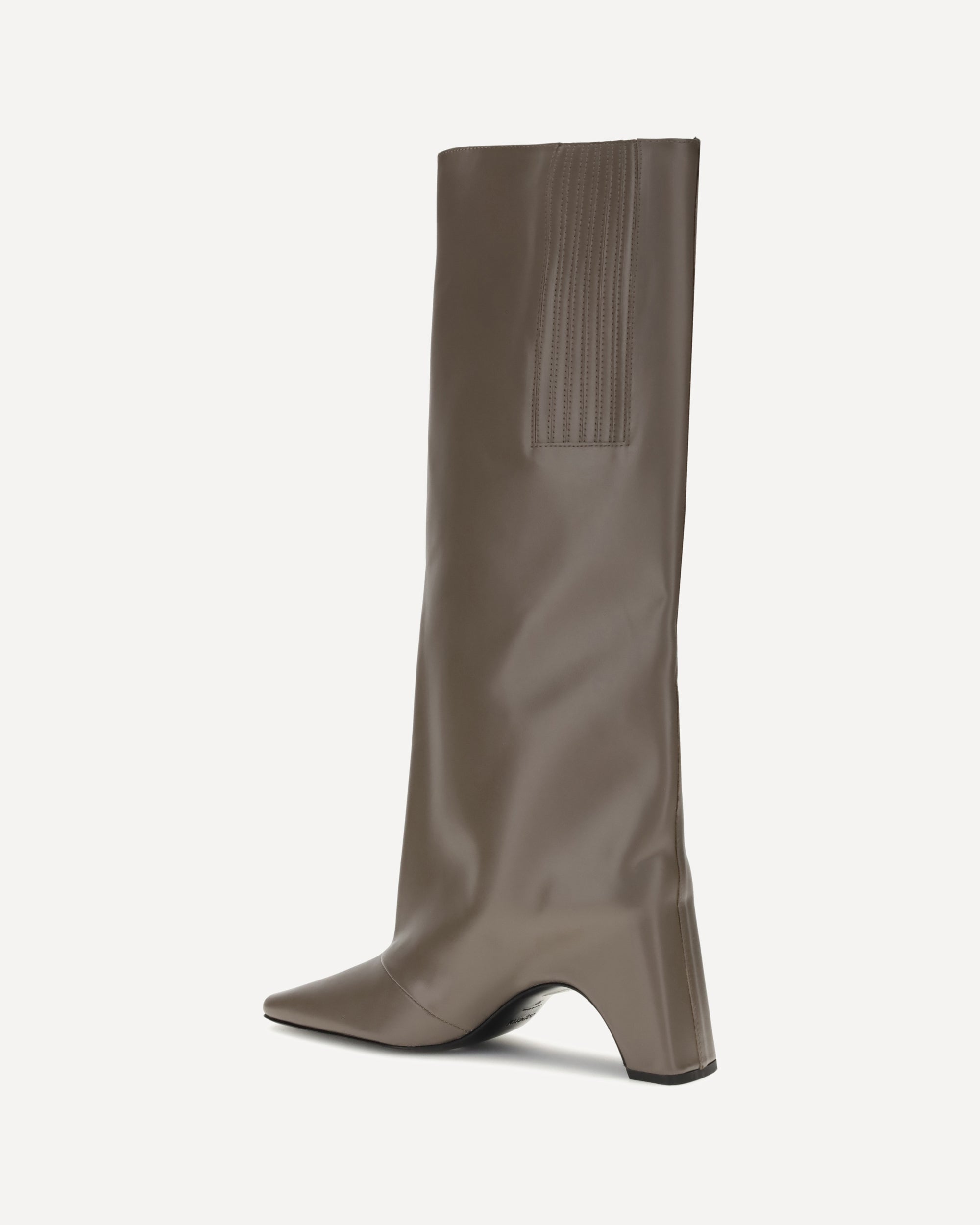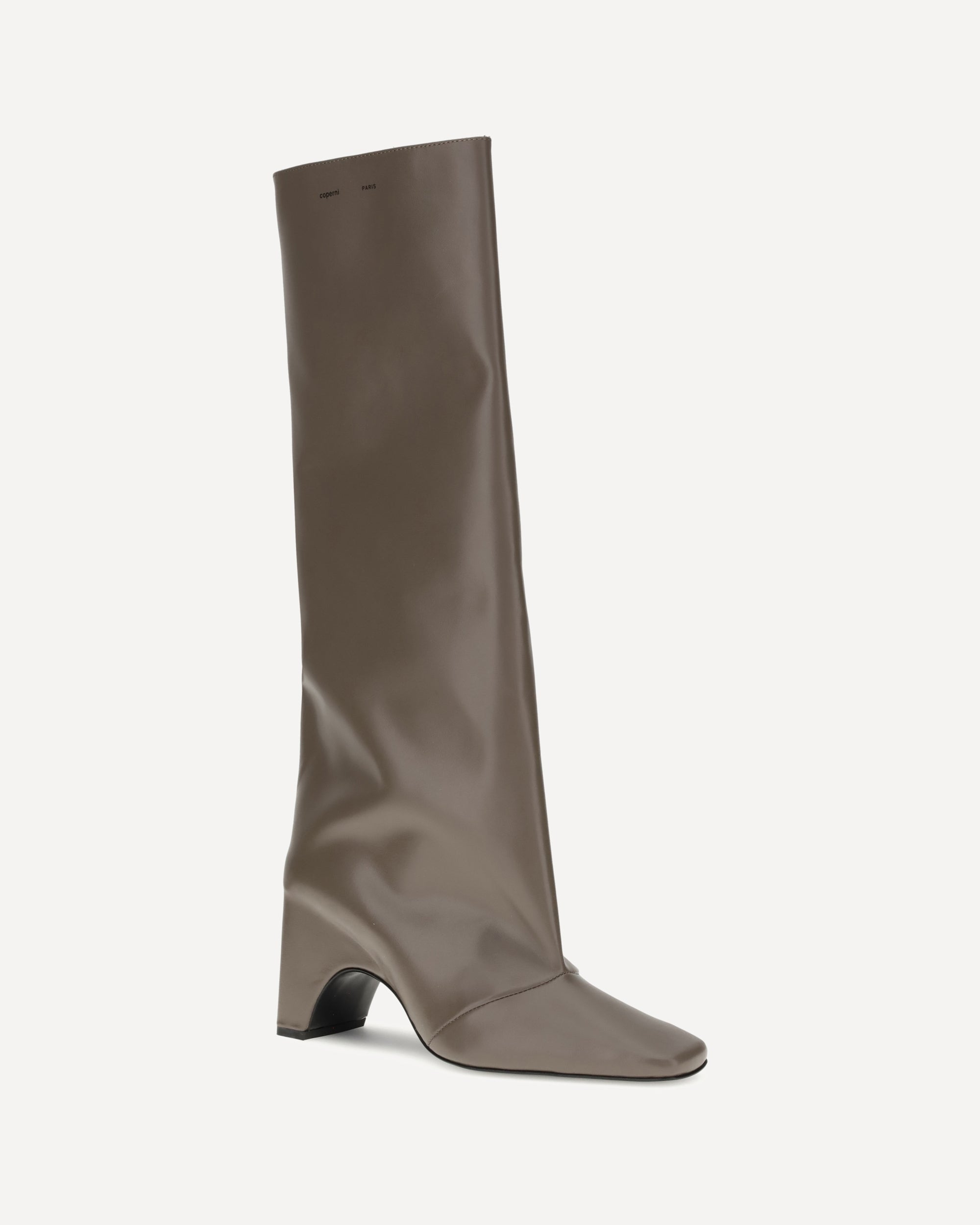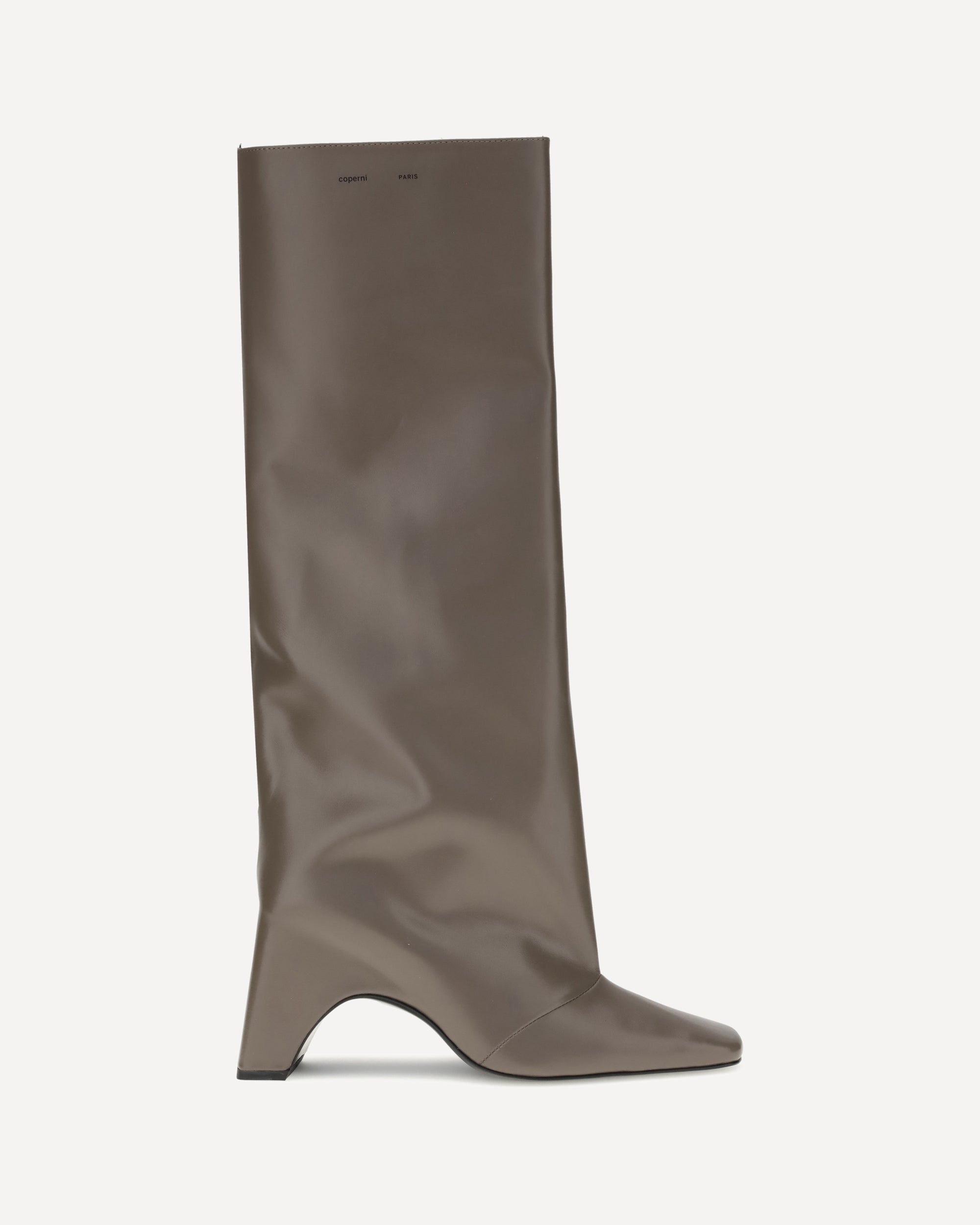 Coperni's Bridge High Boots are distinguished by a structured silhouette featuring a subtle triangular line that elegantly enhances the leg. The name comes from the arched sole, while the design is complemented by a block heel and a minimalist square toe for a sophisticated, contemporary look.