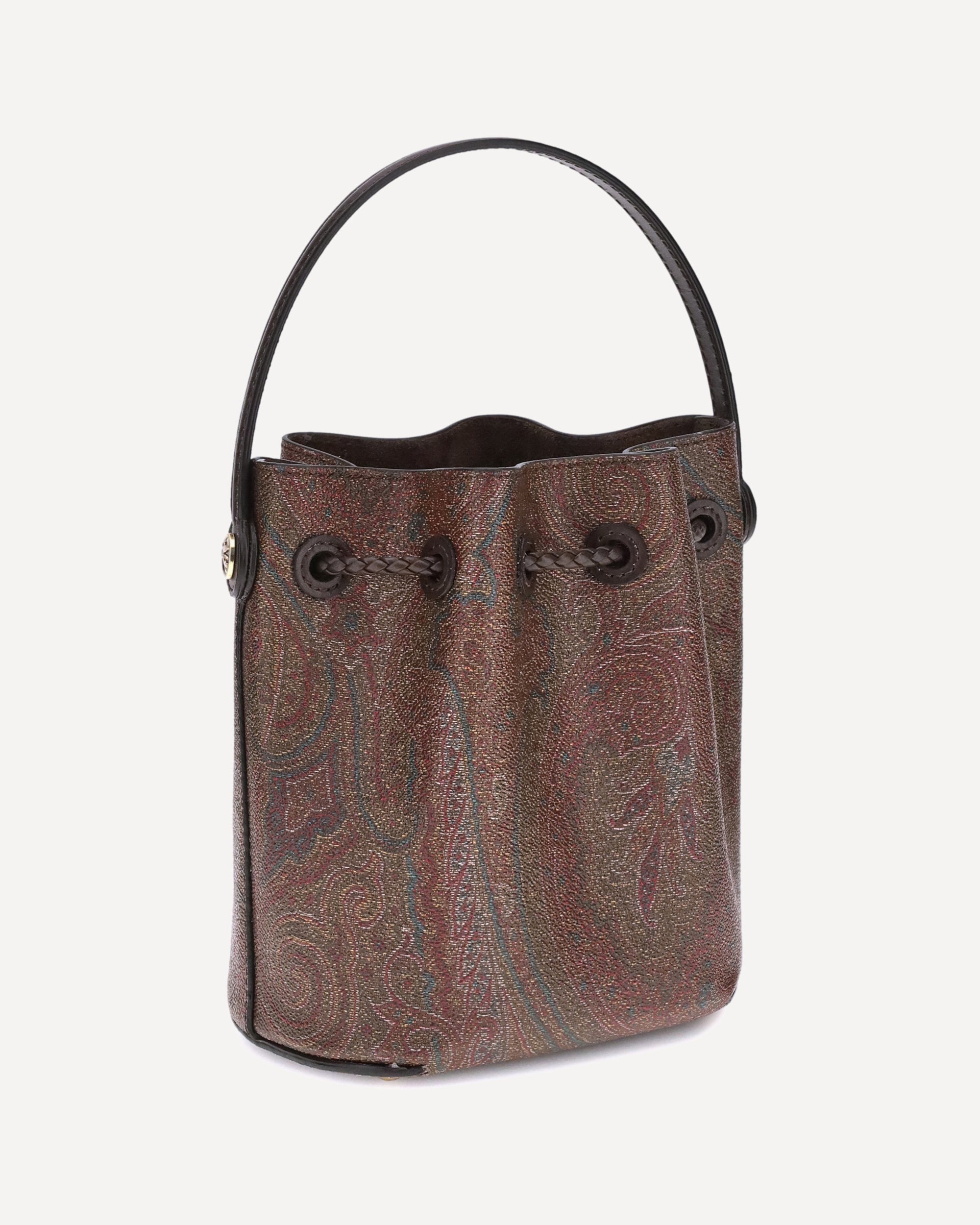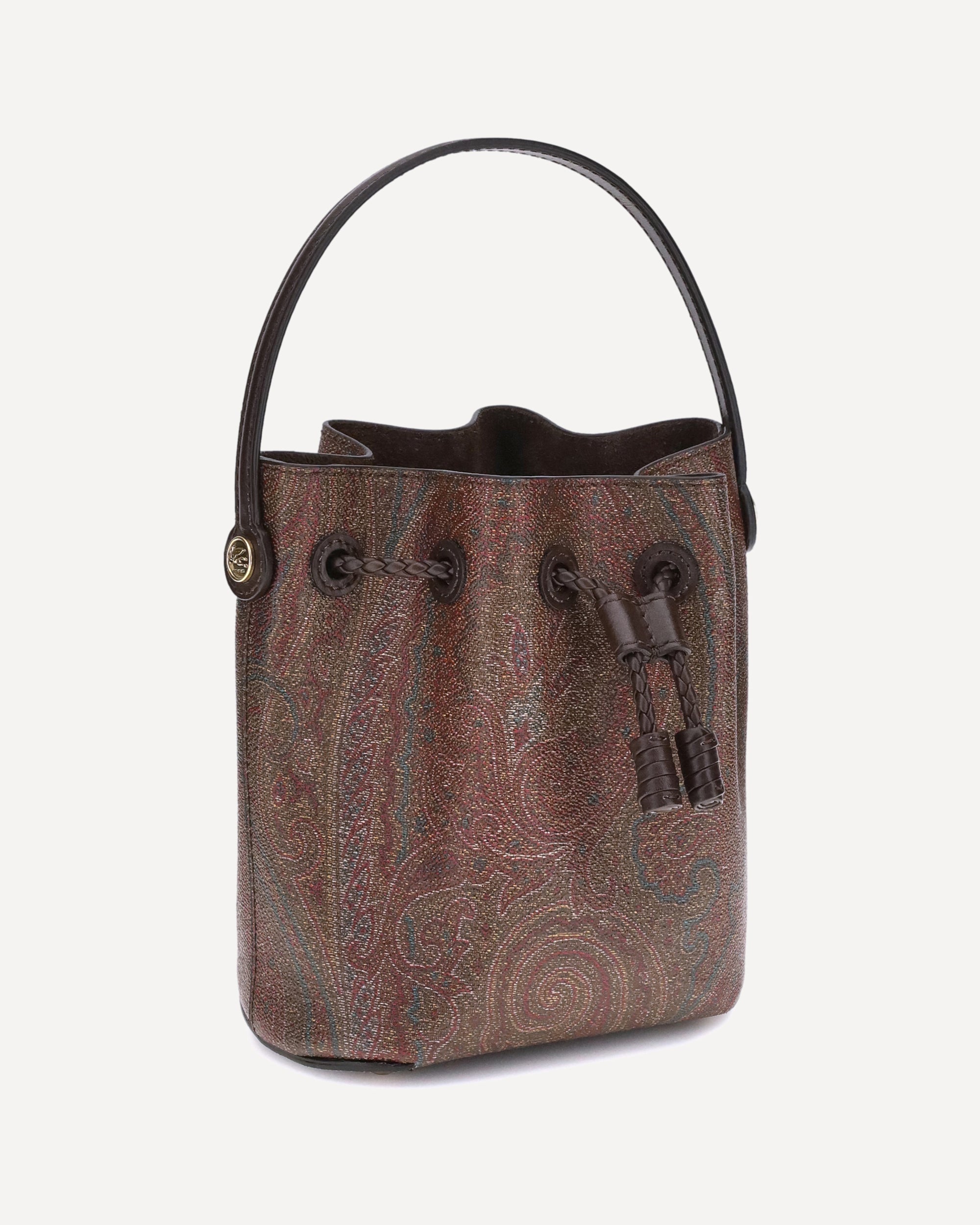 The Arnica mini bucket Bag by Etro is crafted from the Maison's signature Paisley jacquard canvas, enhanced with tone-on-tone leather trim that enhances its elegance. Featuring an adjustable shoulder strap and a braided drawstring closure, it features gold-finish metal details and metal feet for added protection and style.