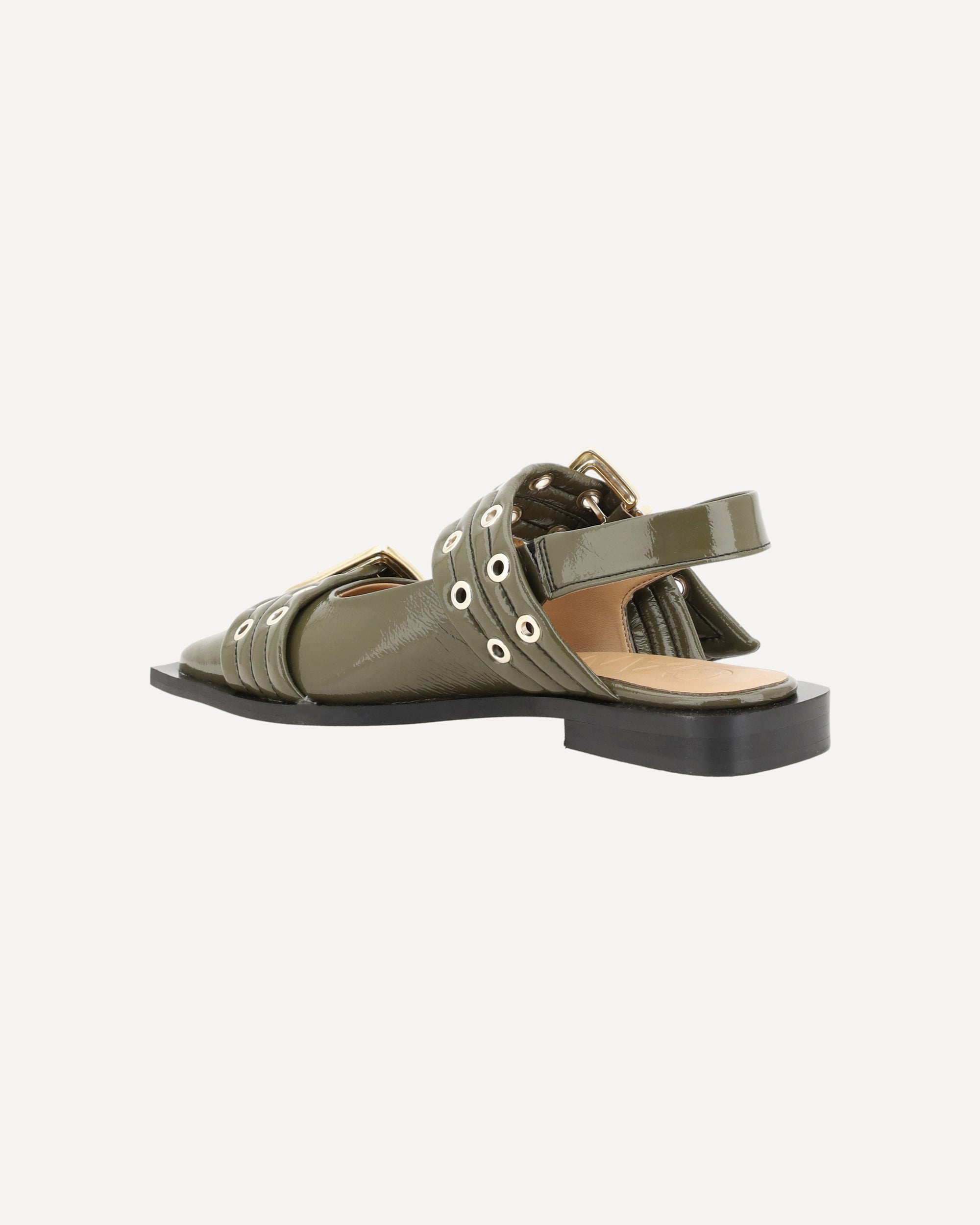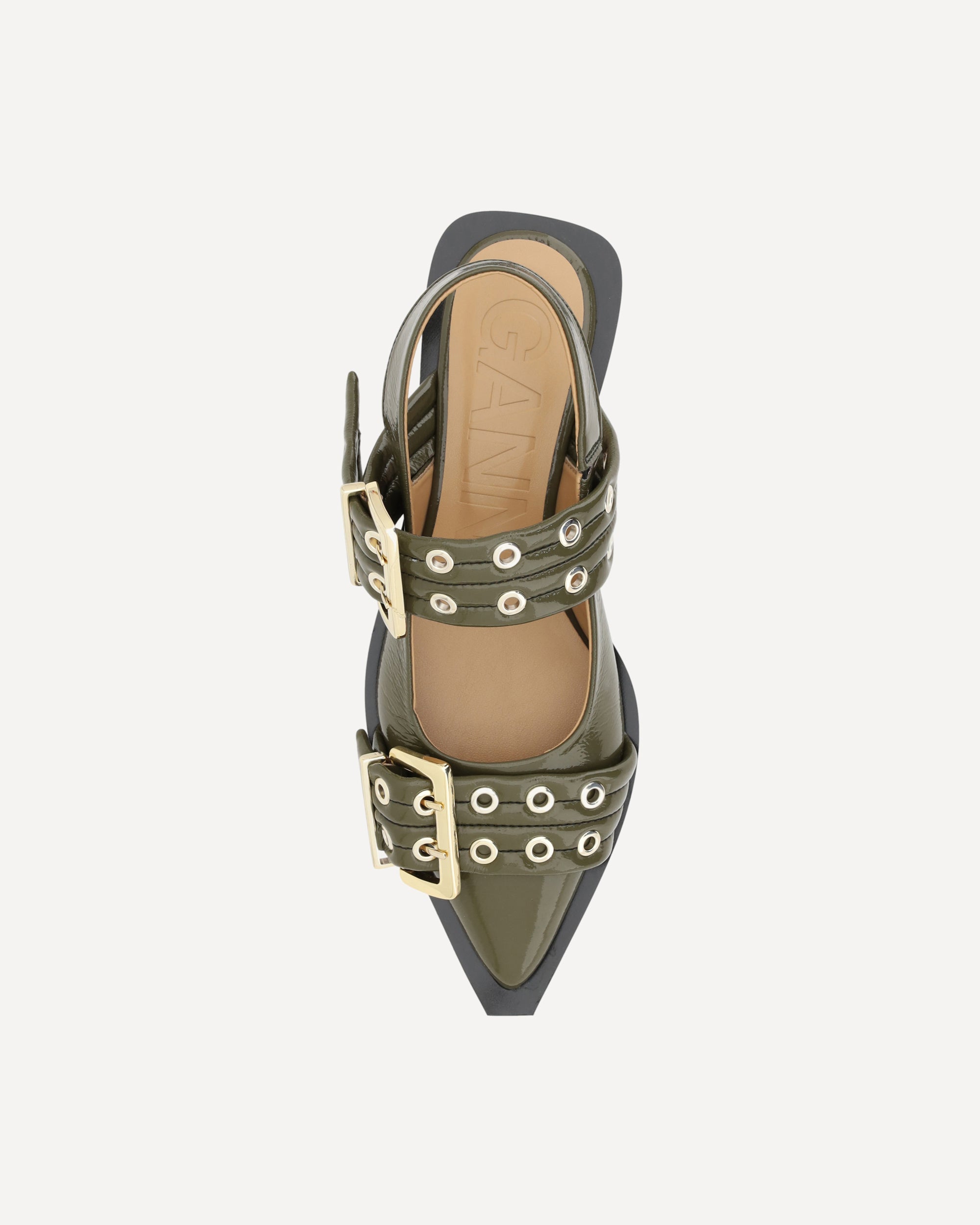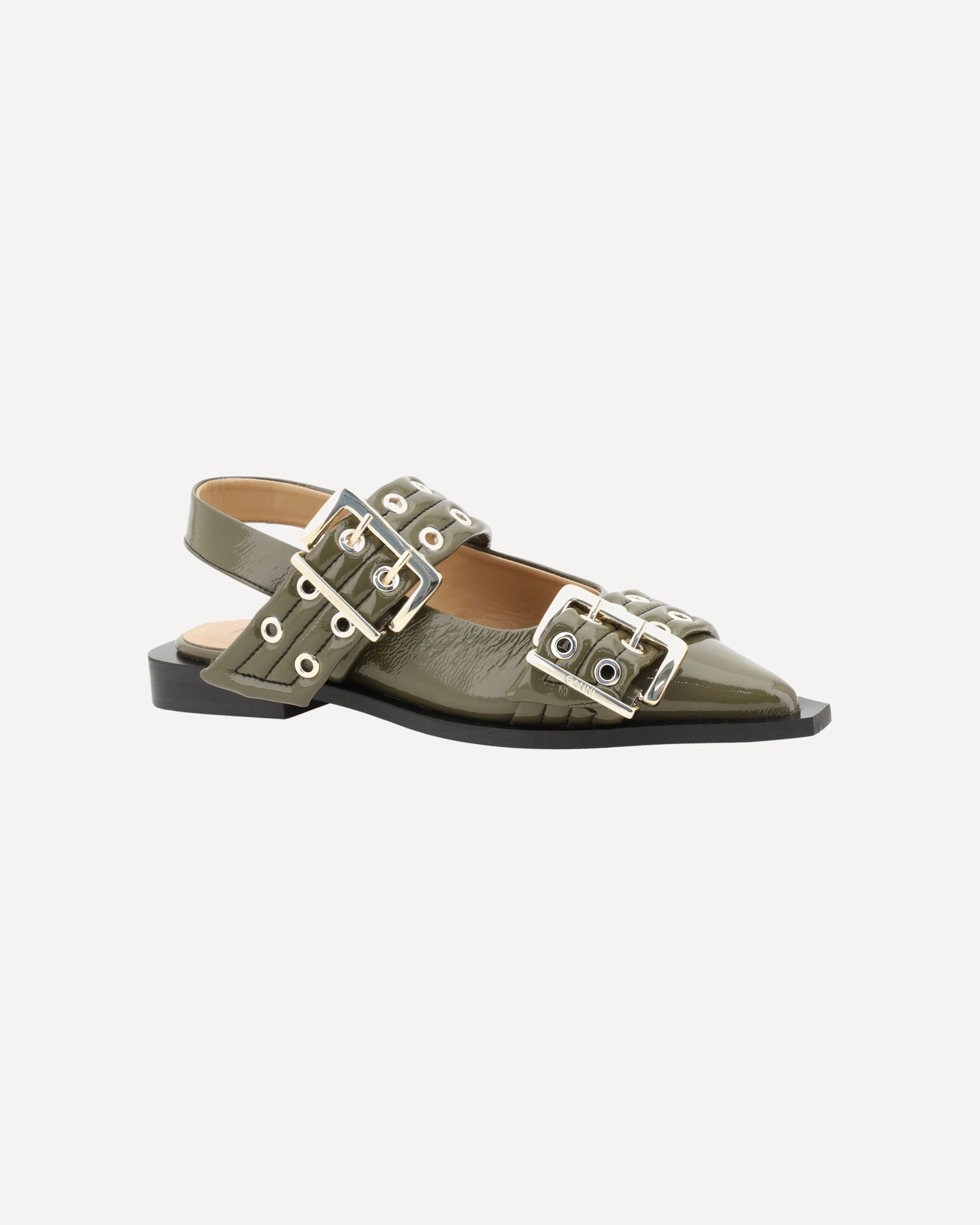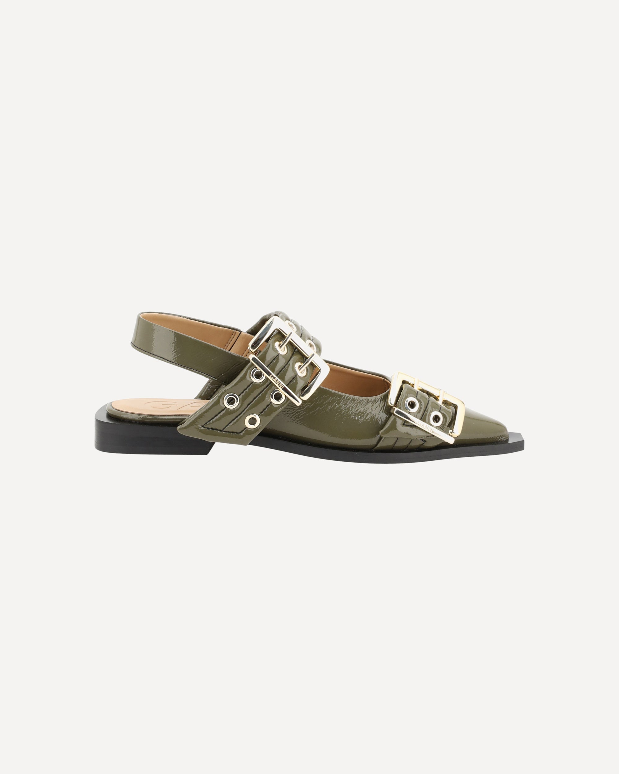 Buckle Ballerinas by Ganni, elongated toe, two adjustable front buckles, block sole, slingback style, patent leather design.