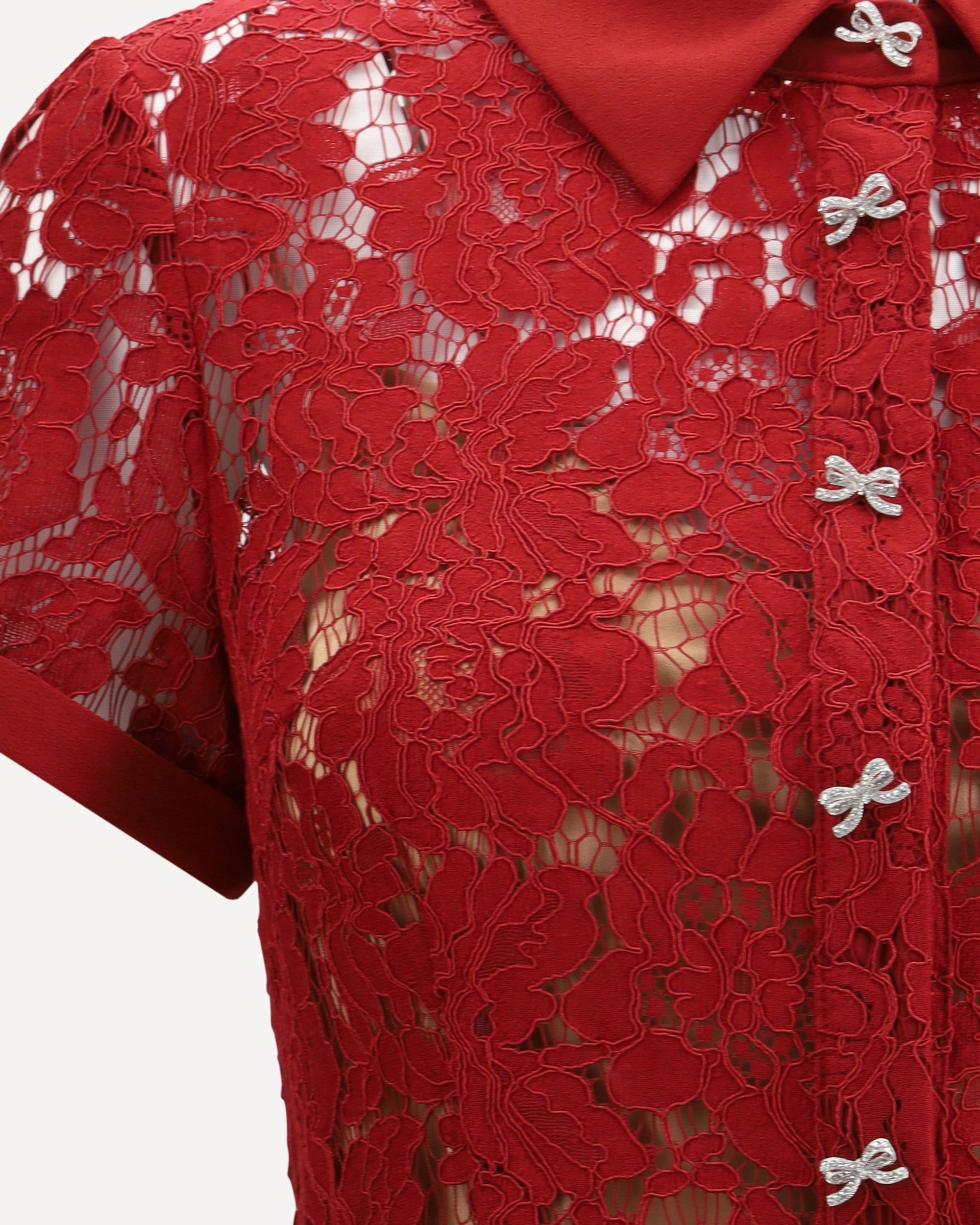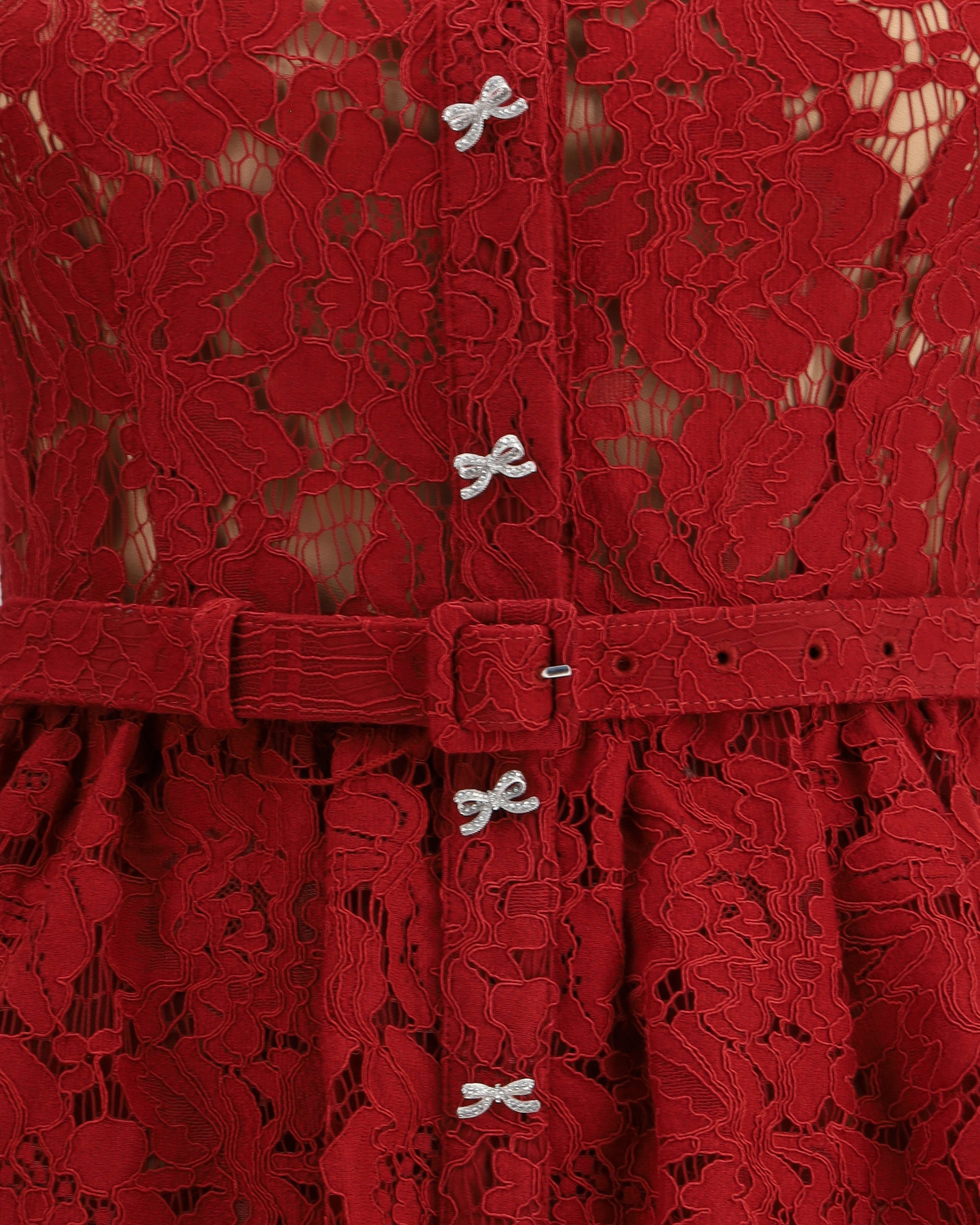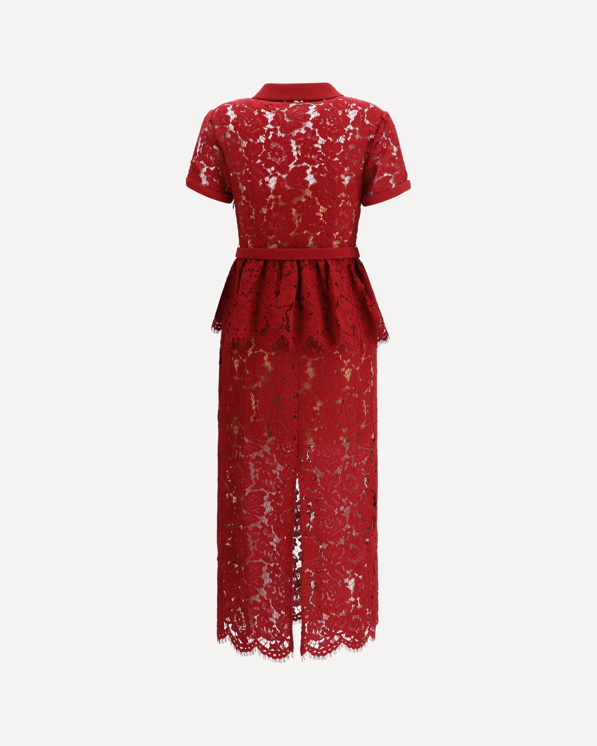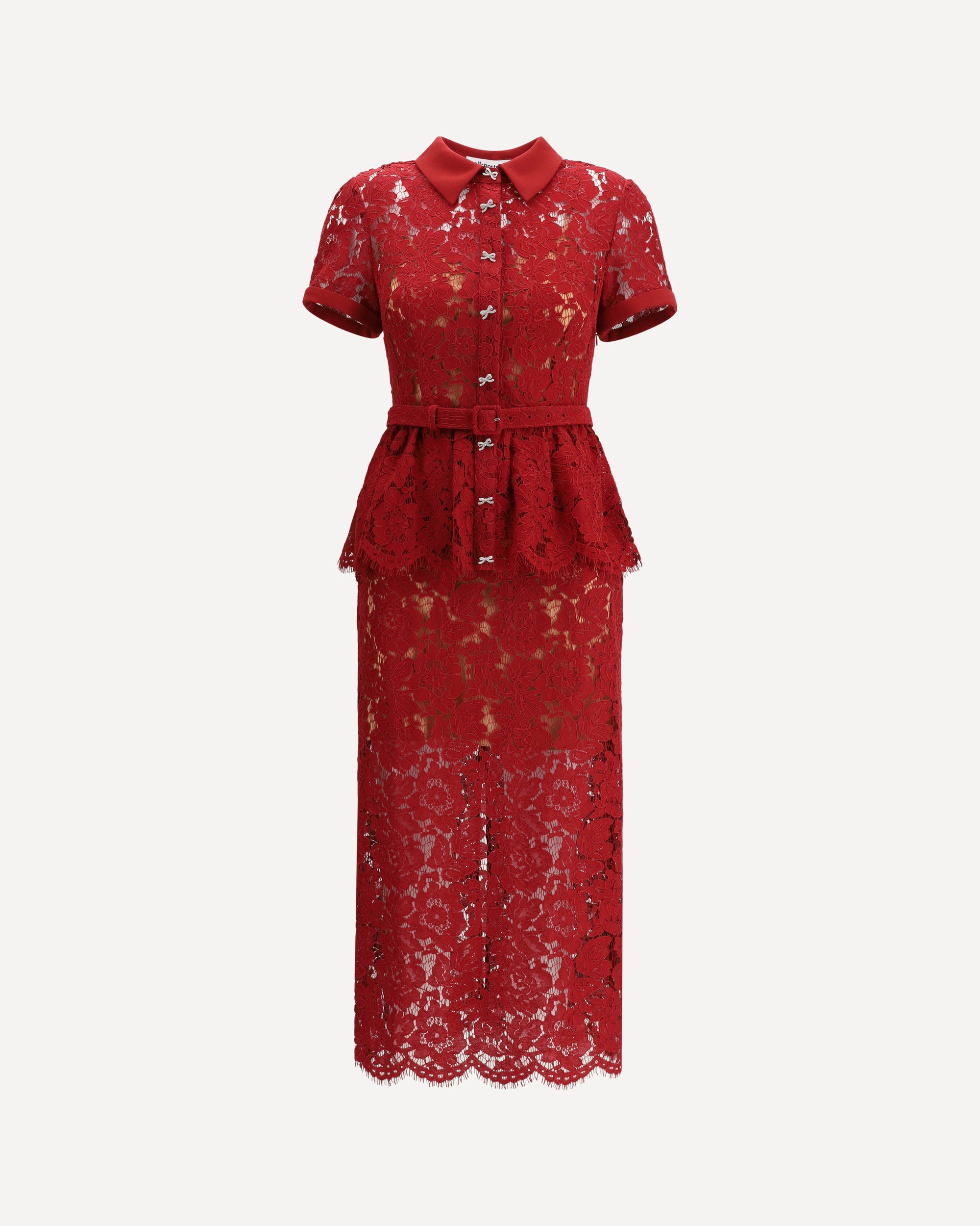 Self-Portrait's lace midi Dress is a feminine and sophisticated design with short sleeves and a classic collar. The front closure is embellished with rhinestone bow buttons, while the peplum detail below the waist gives structure and movement to the silhouette. Complemented by an adjustable matching belt, it elegantly defines the waistline.