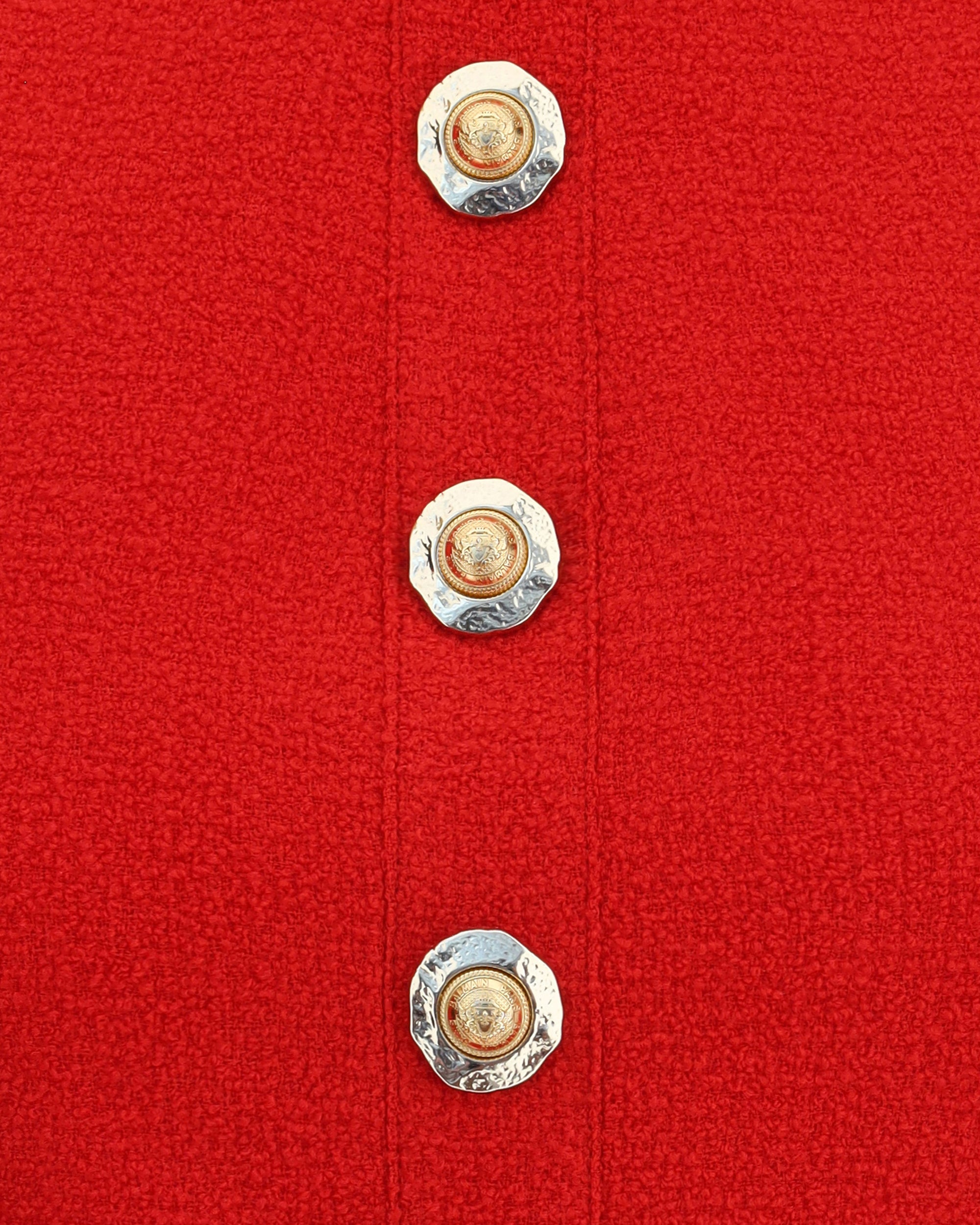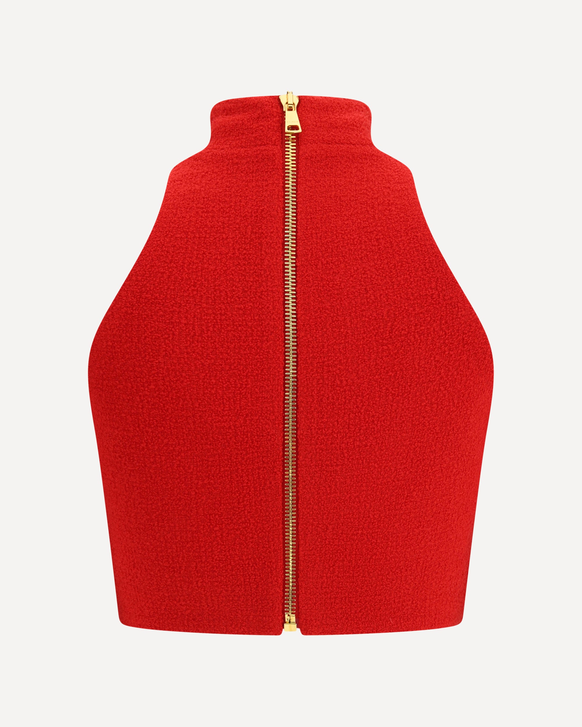 Balmain's bouclé wool crop Top is a sophisticated and characterful piece. Sleeveless and high-necked, it features a front zipper closure that adds a modern and functional detail, making it perfect for sleek, contemporary looks.