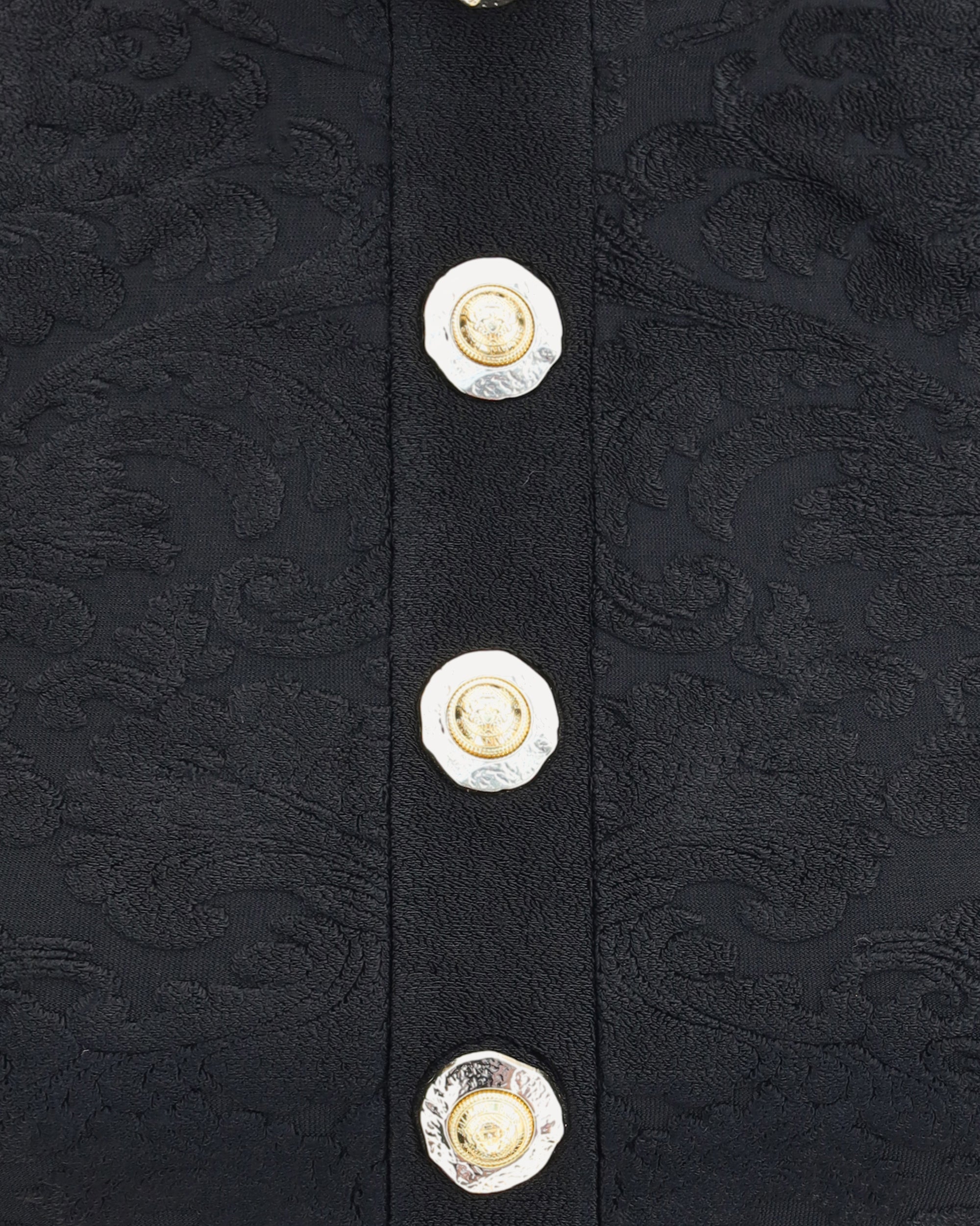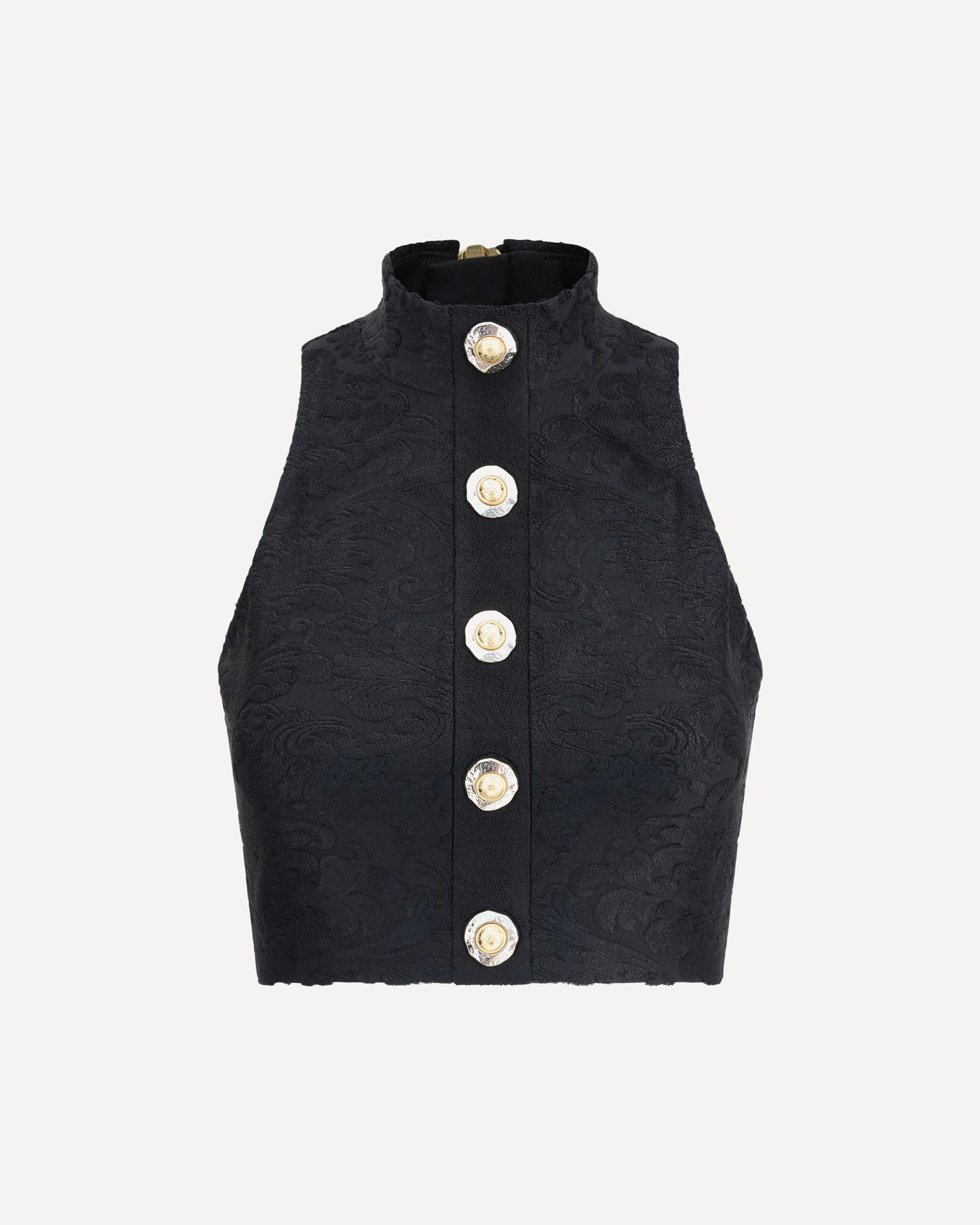 Balmain's crop Top is a striking garment defined by an American neckline and a rich baroque pattern. Bare shoulders enhance the bust line, while decorative metal "Gold and Gold Coin" buttons on the front add an iconic touch. The back closure is completed with an exposed metal zipper with Balmain Paris engraved slider, a detail that reflects the Maison's bold elegance.