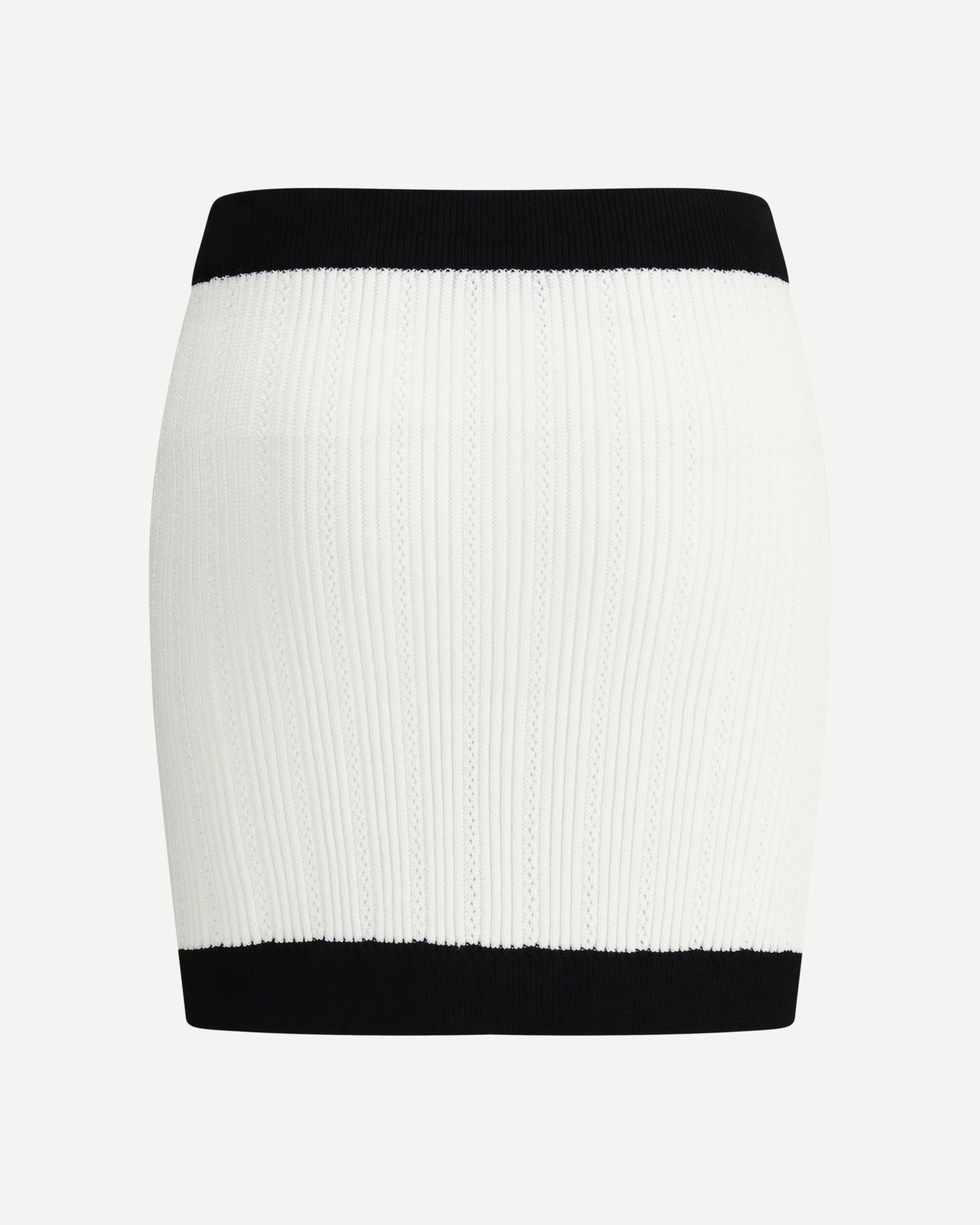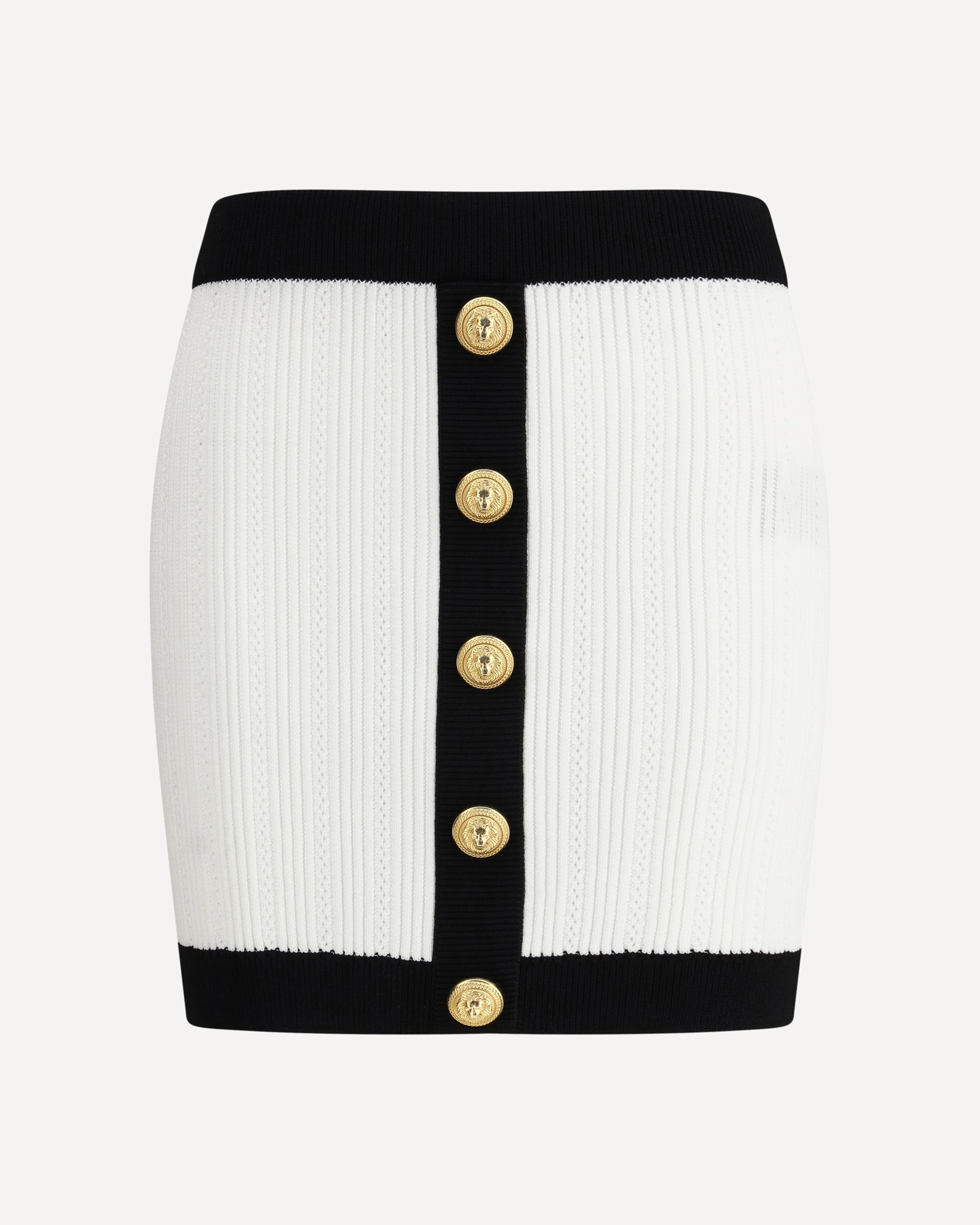 Balmain's mini Skirt enhances the silhouette with a refined ribbed knit. Decorative gold metal "Coin" buttons at the front add an iconic and distinctive touch, while contrasting ribbed trim completes the design with character and sophistication.