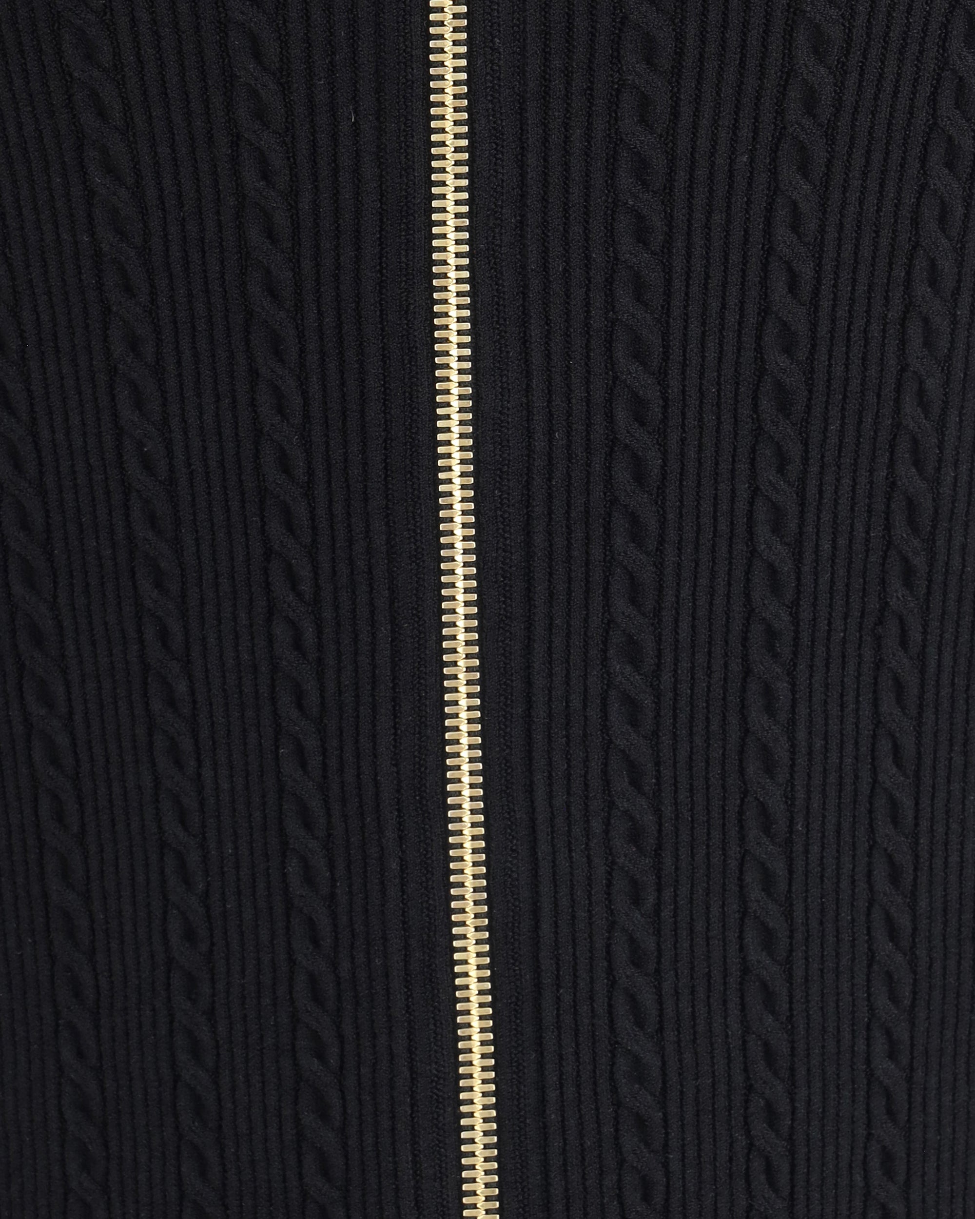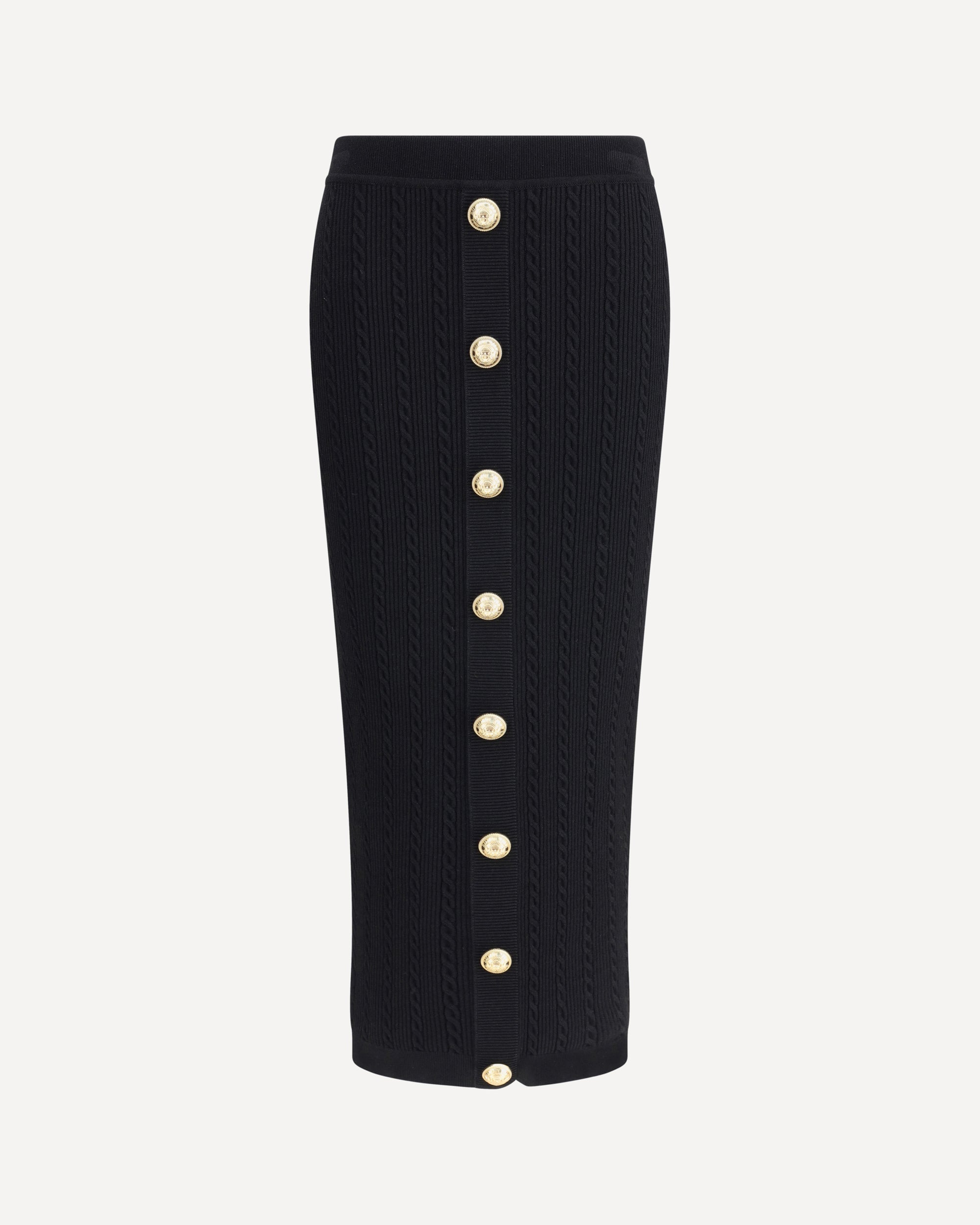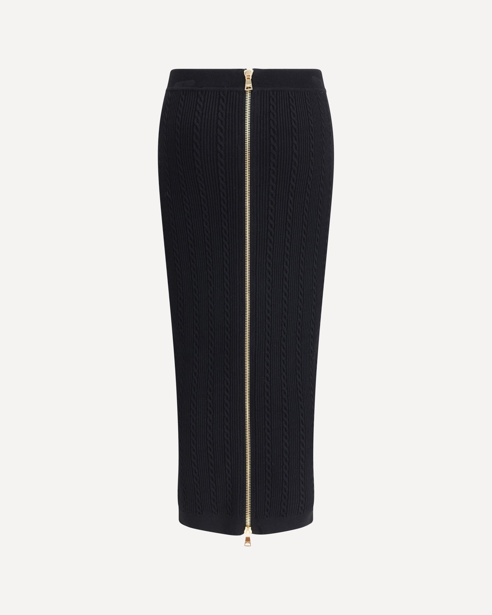 Balmain's midi Skirt enhances the silhouette with a ribbed and twisted knit, giving structure and movement to the garment. On the front, the characteristic decorative "Coin" buttons in gold metal, the house's iconic signature, stand out. The back closure is entrusted to an exposed double zipper in gold metal, with sliders engraved "Balmain Paris." Contrasting ribbed trim completes the design for a sophisticated and recognizable look.